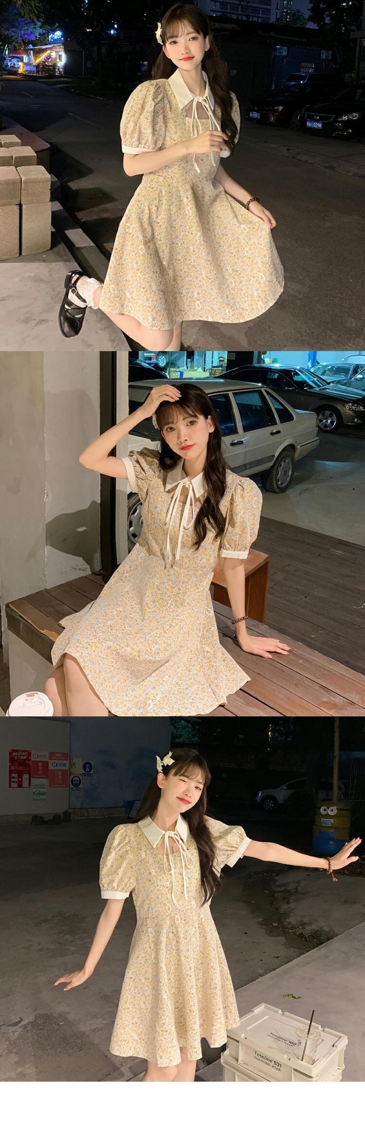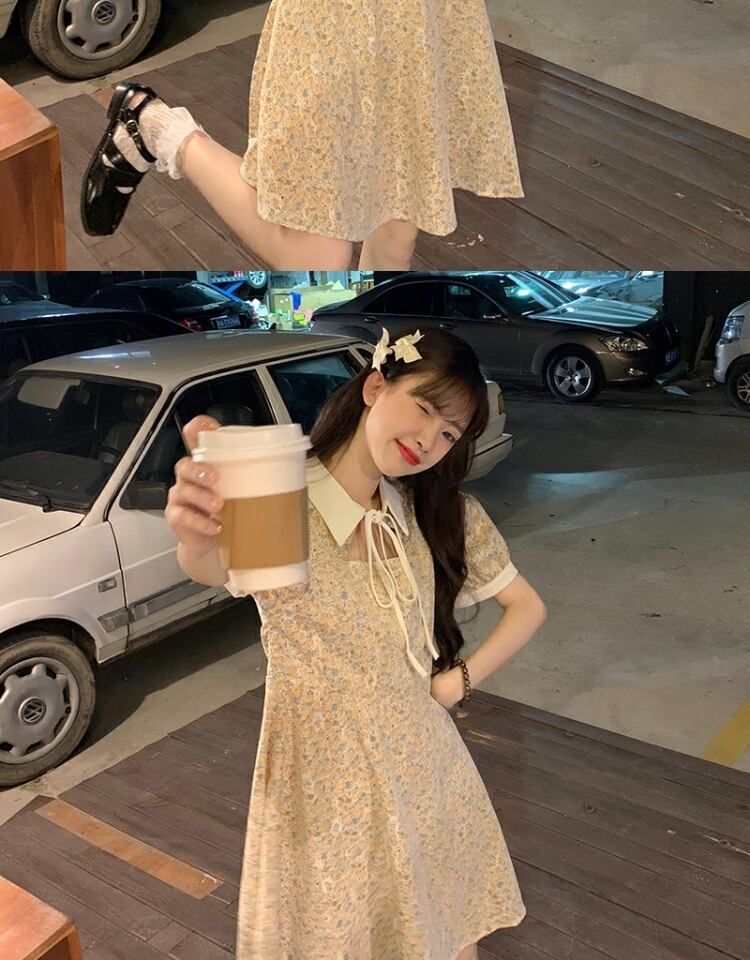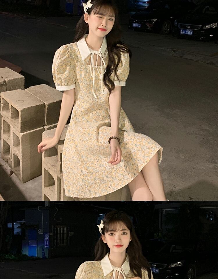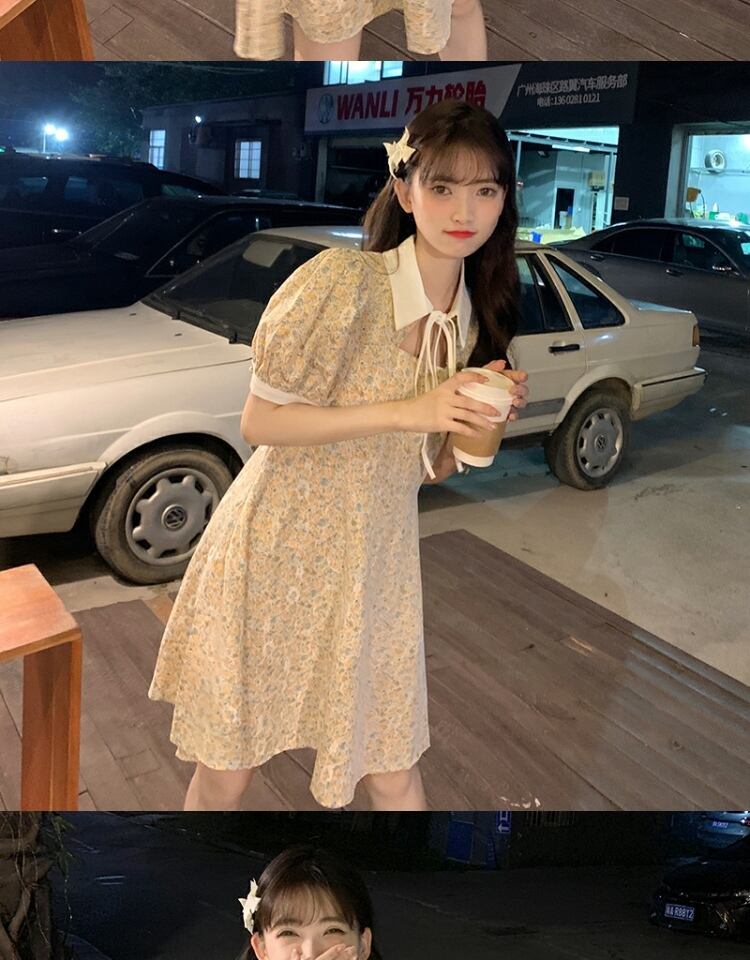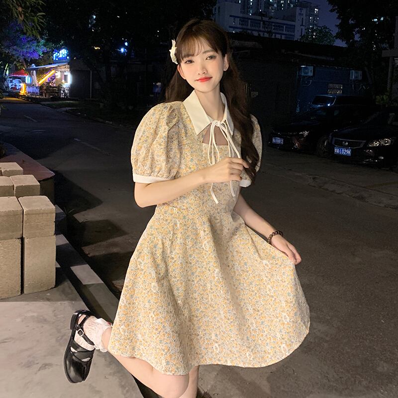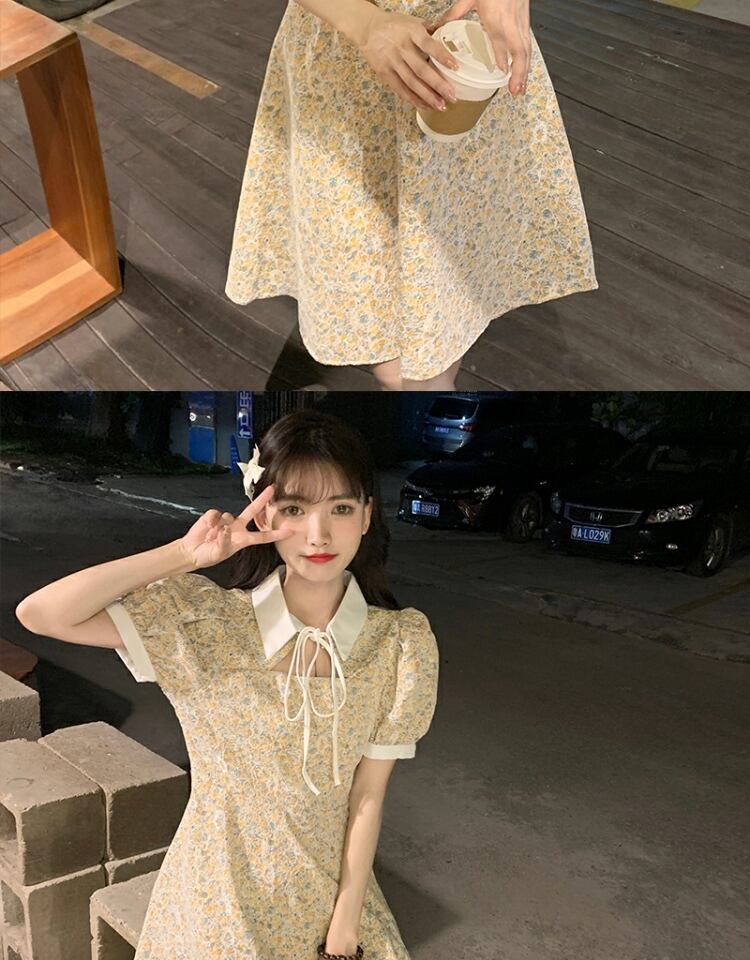 カラーレーススリーブドレス サマーフローラルスカート 夏物 花柄 萌量不足54685263911