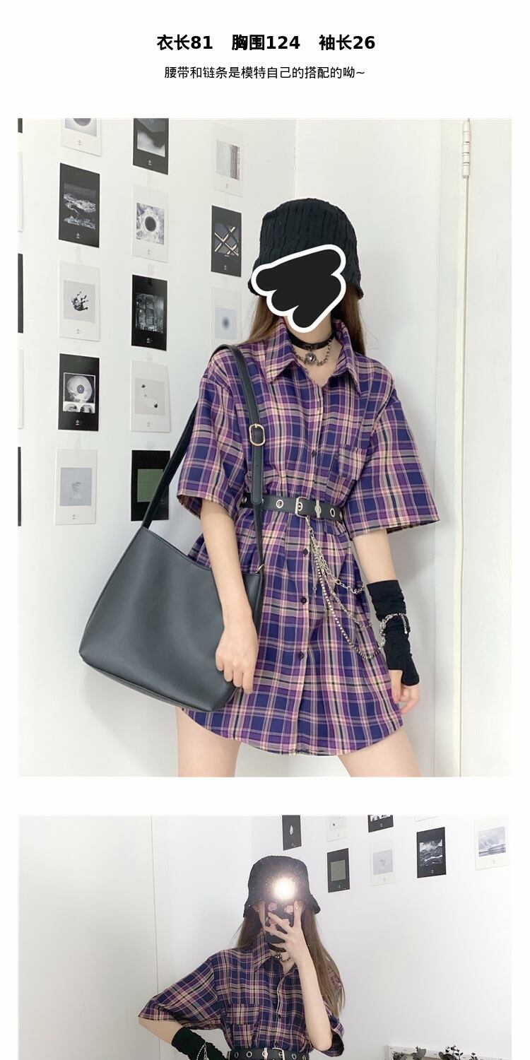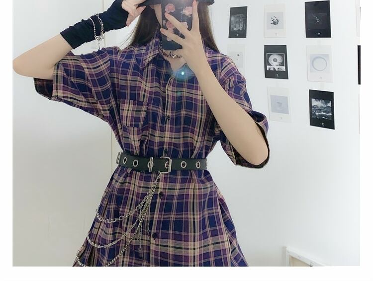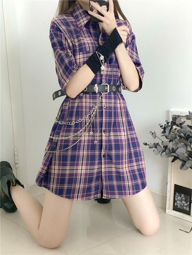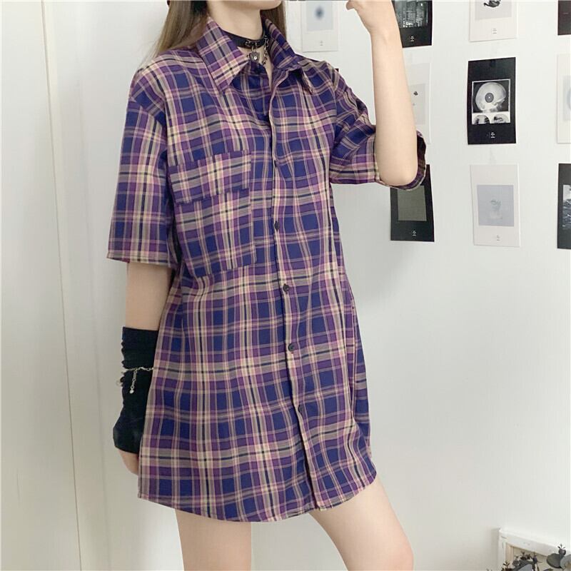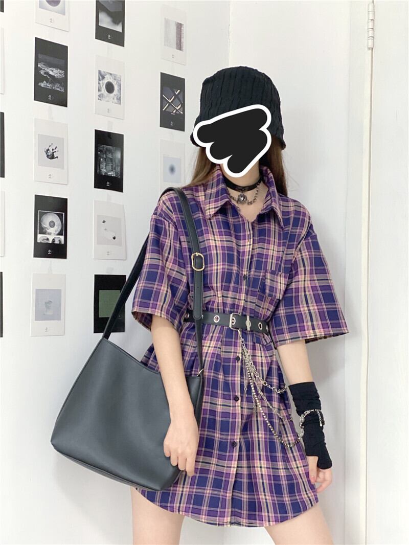 ダーク格子柄シャツ ブラウス スプリングルーズ 春物 パープル 萌量不足19114552494