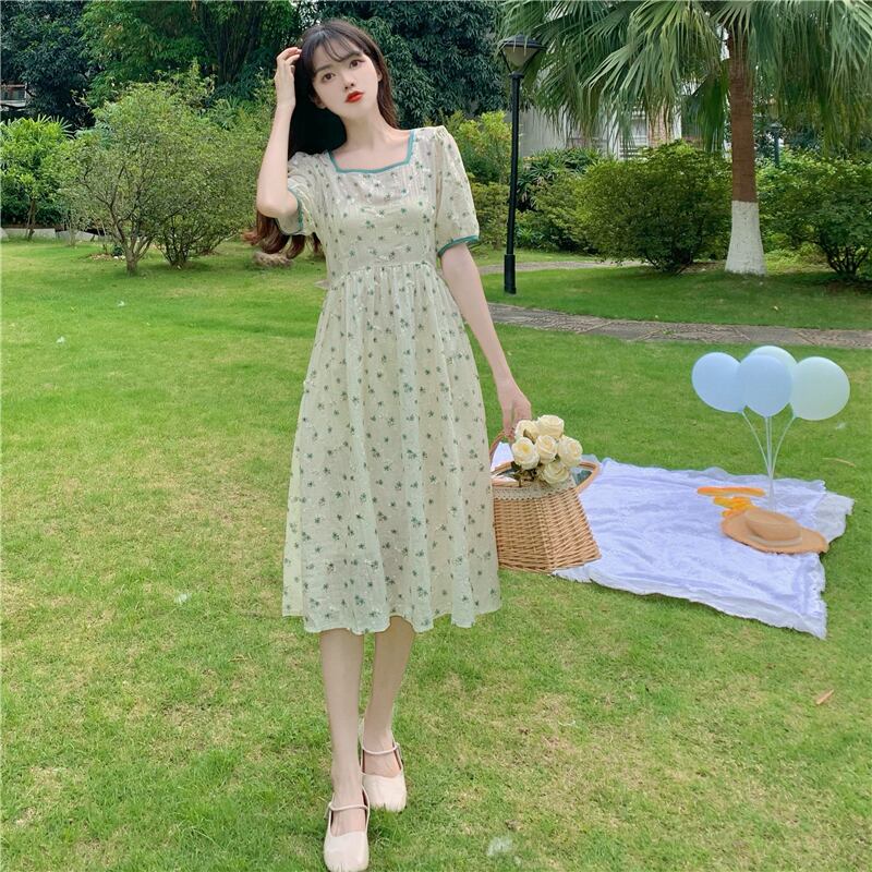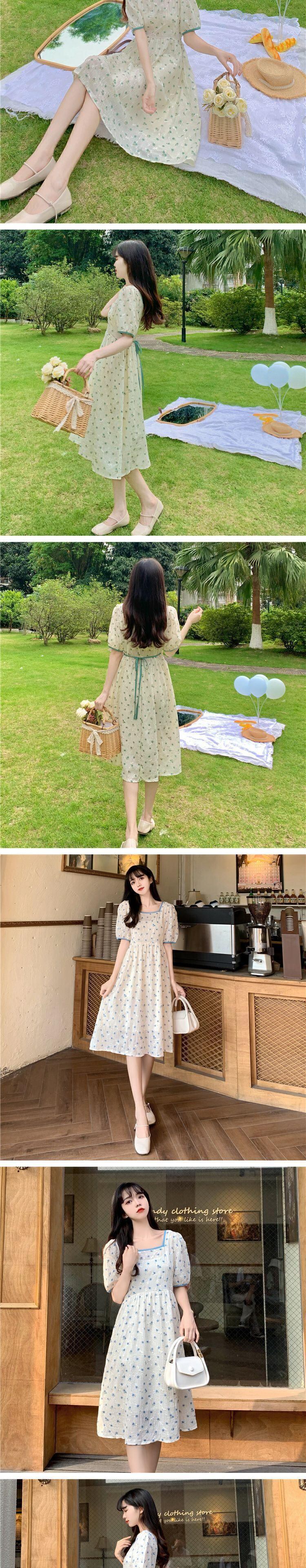 スカート カラーウェストフローラルドレス サマー 大人ガーリー スウィート キュート カジュアル 夏物 花柄 フラワーデザイン スクウェア 萌量不足2454233358