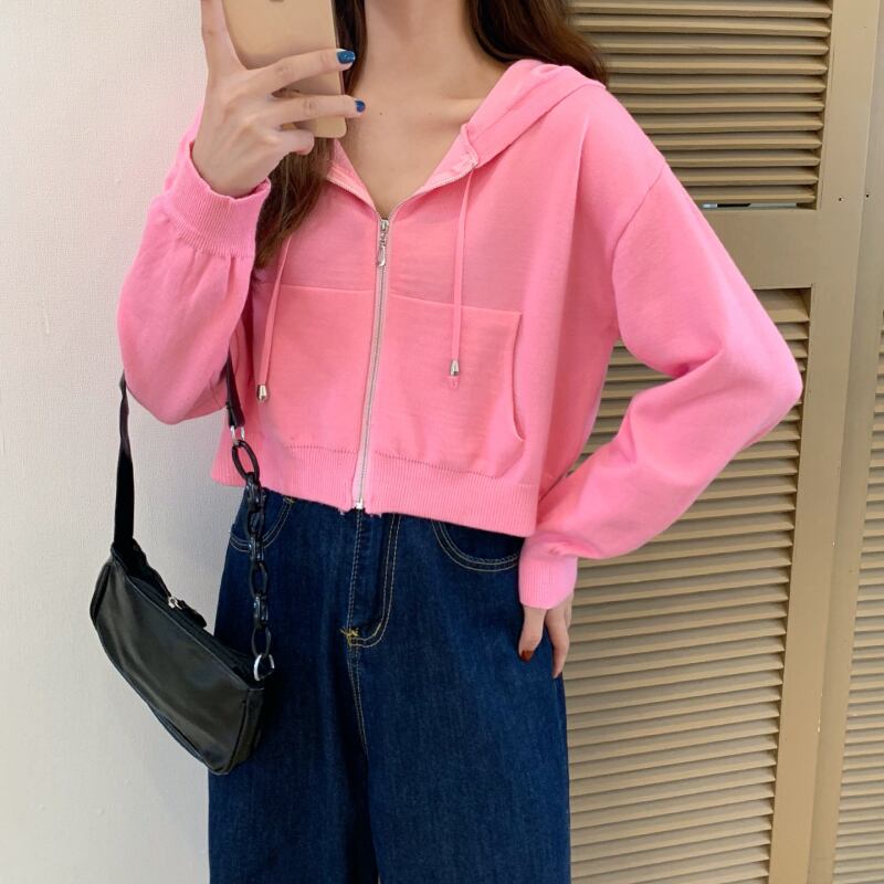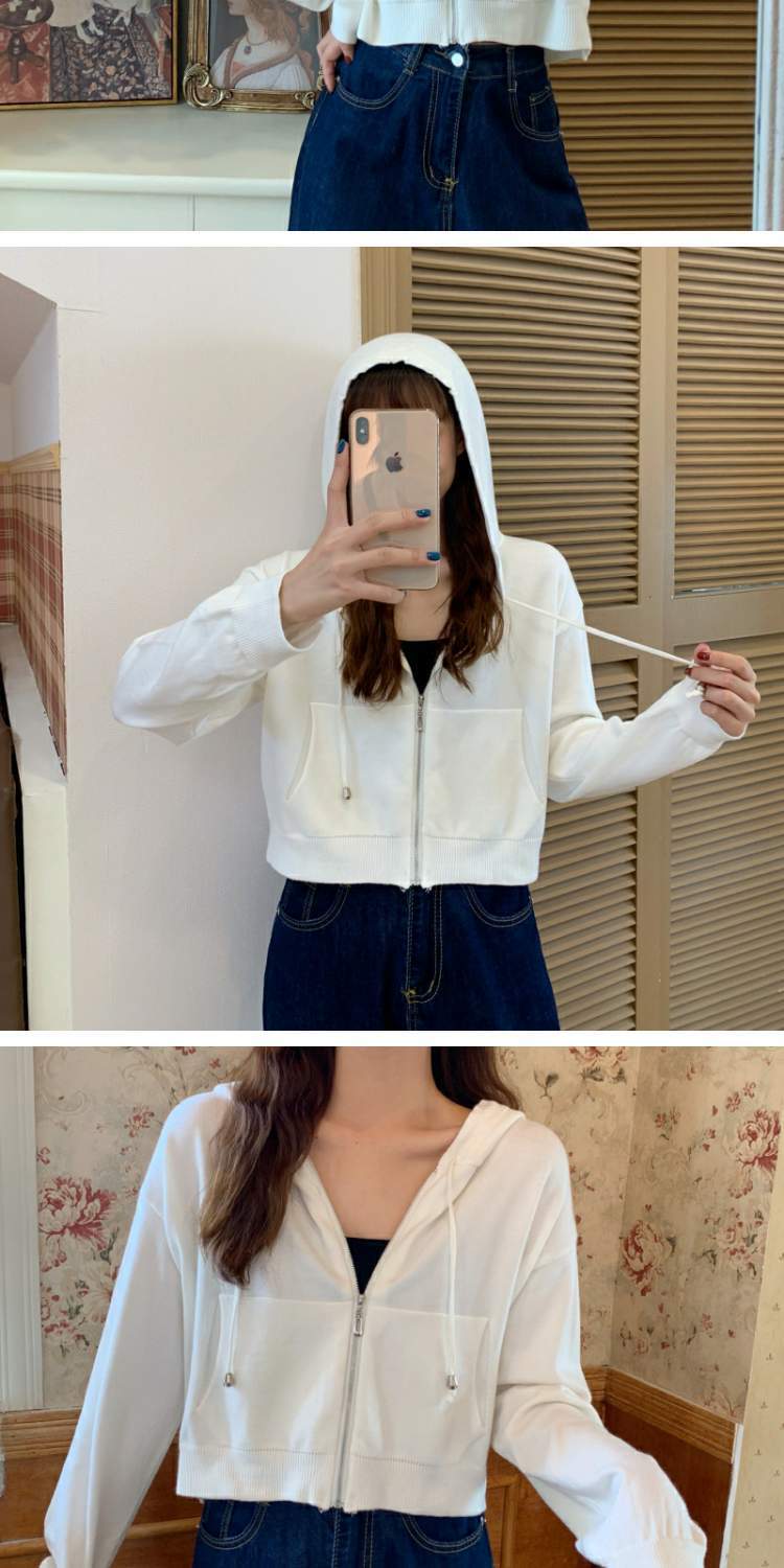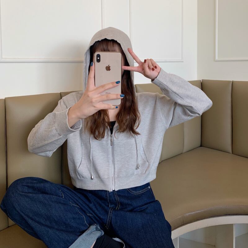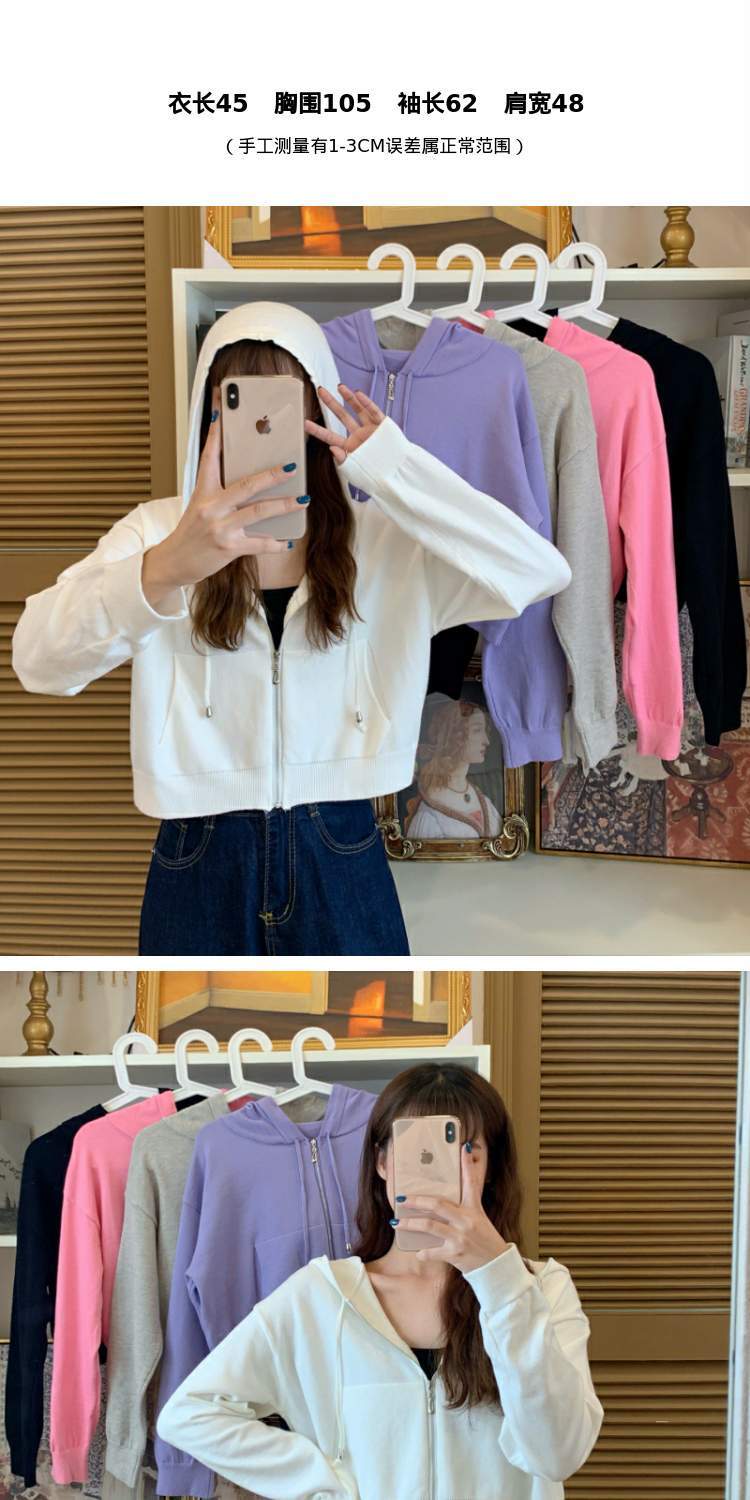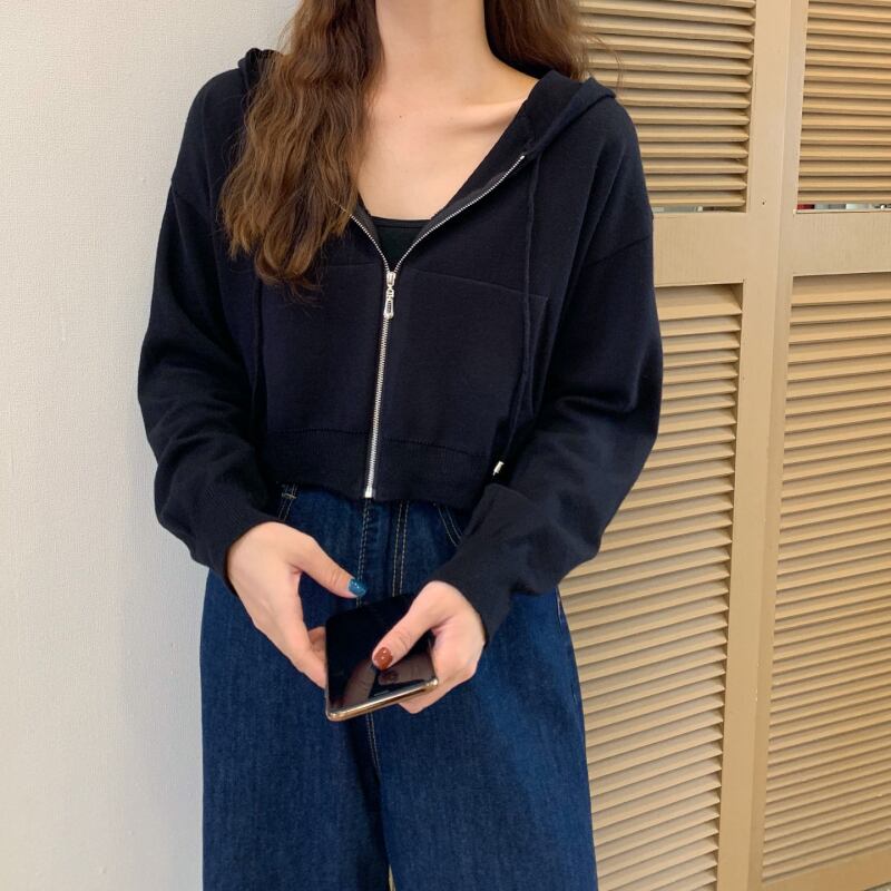 ショートルーズフードジッパーニットセーター スプリングオータムカーディガントップス ロング 春物 秋物 萌量不足23196993984