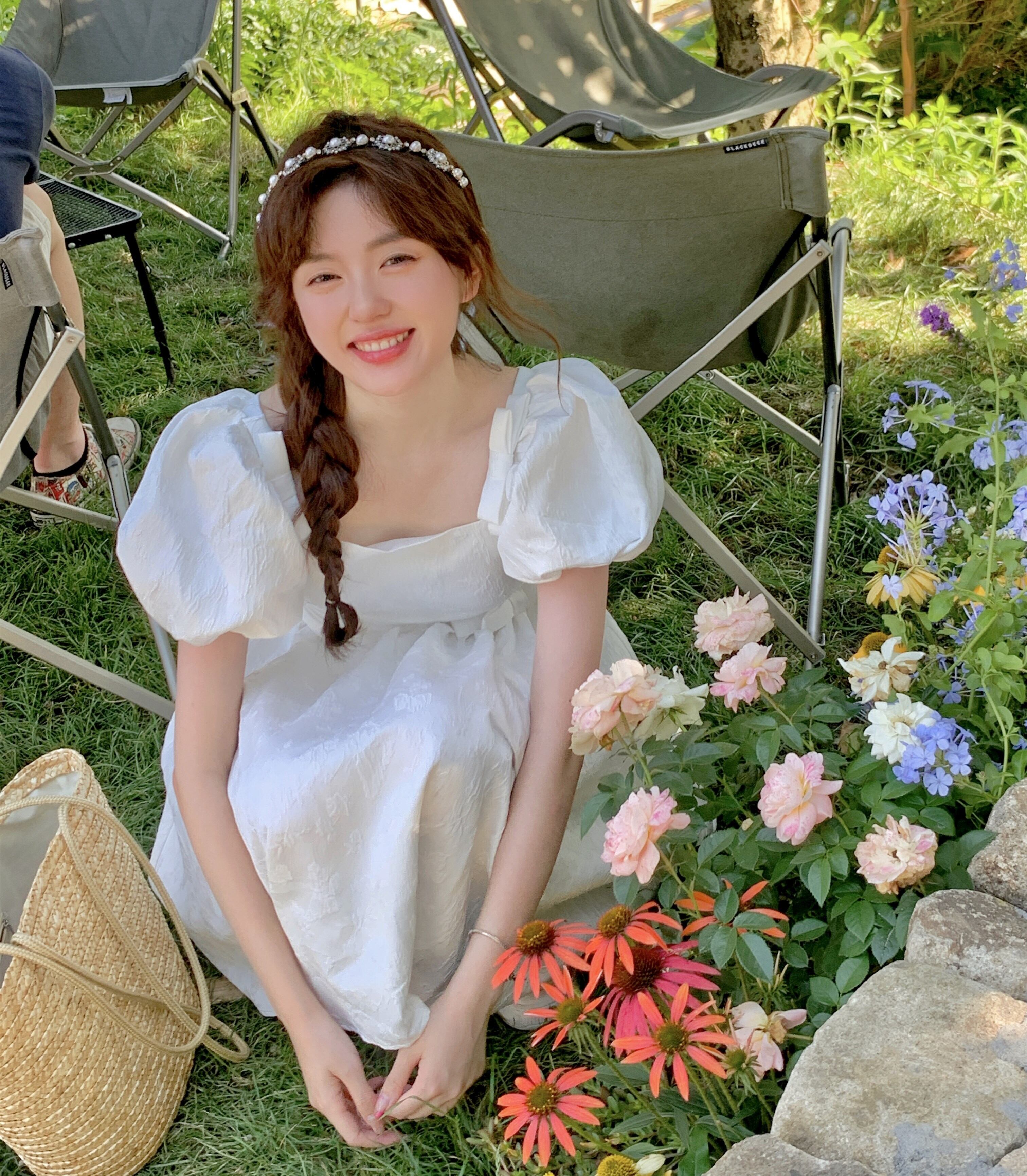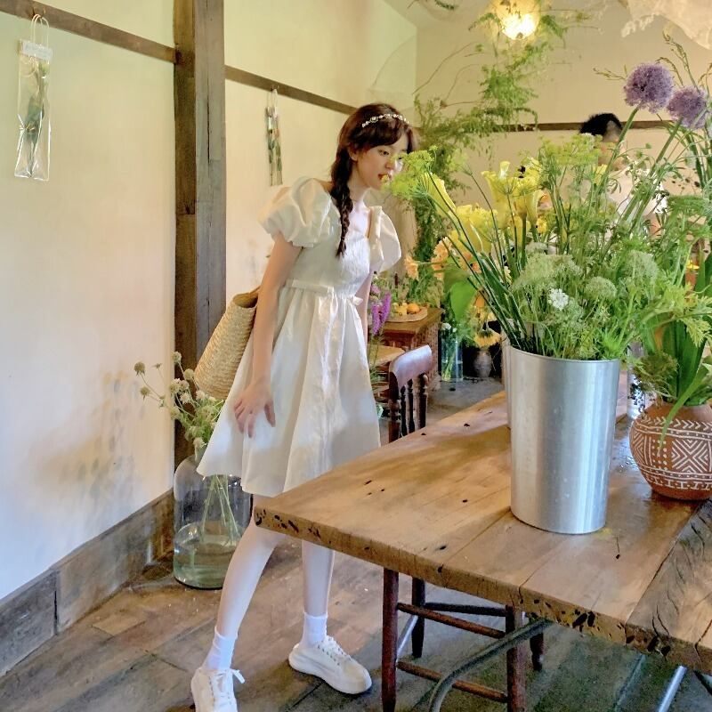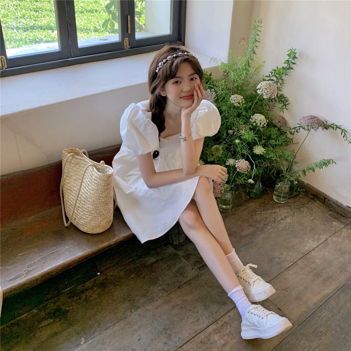 スリーブホワイトドレス サマーカラースカート Aライン 大人ガーリー スウィート キュート カジュアル 夏物 スクウェア 萌量不足16131198171