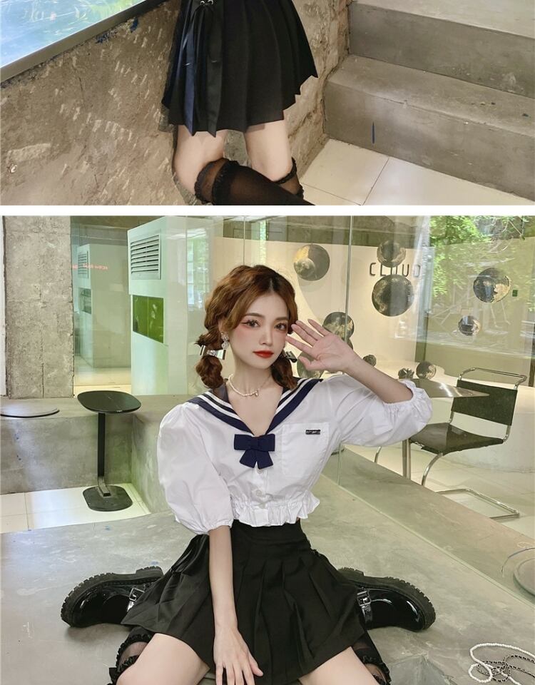 サマーネイビースタイルトップス ハイウェストウェストブラックプリーツスカート ショートレッド 夏物 萌量不足36052524142