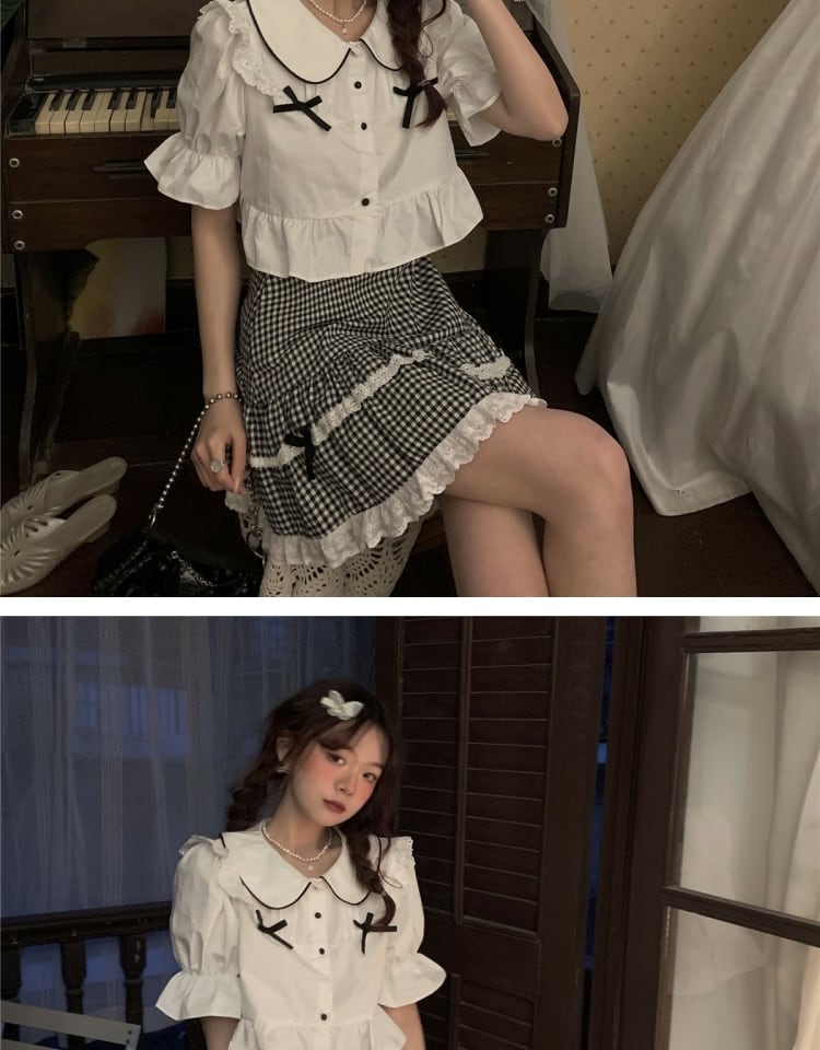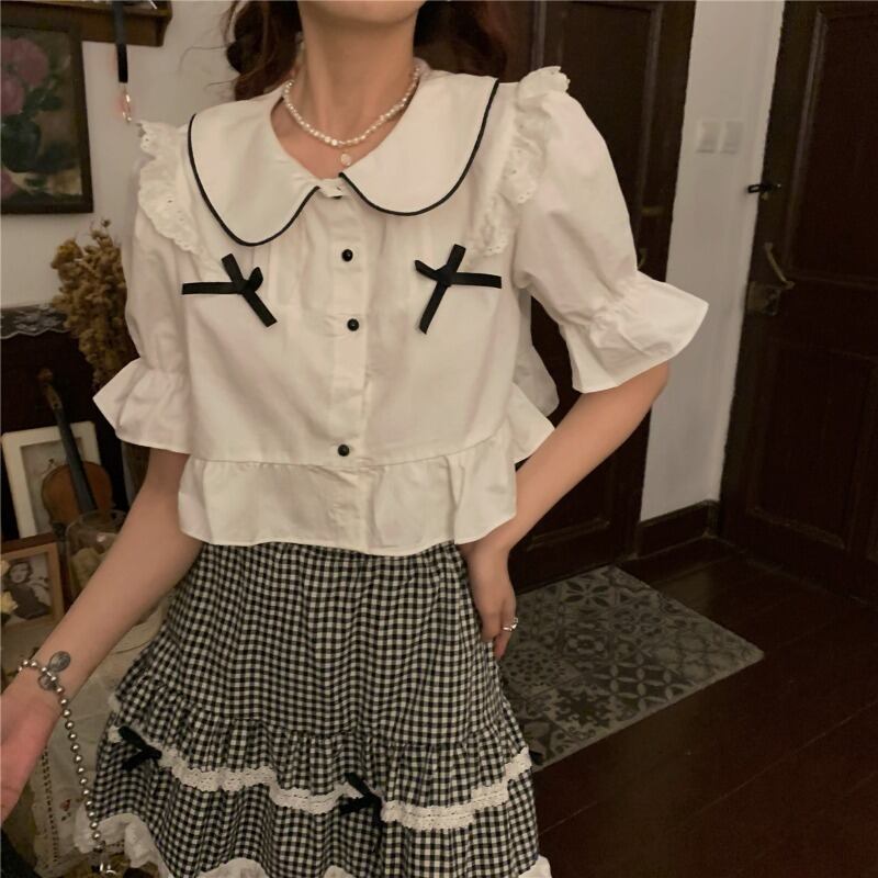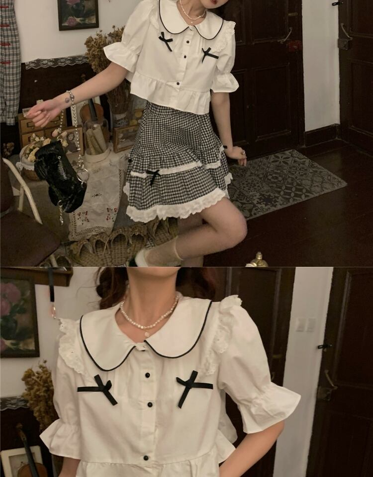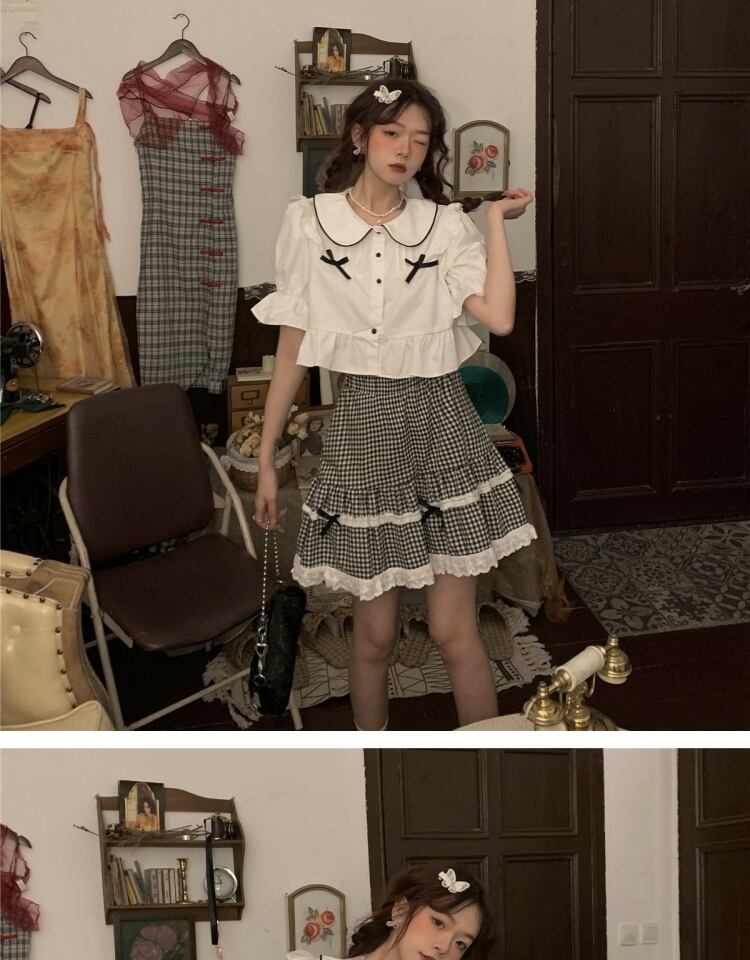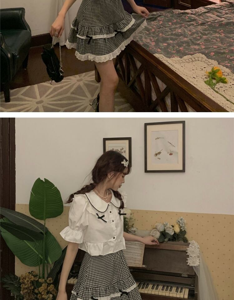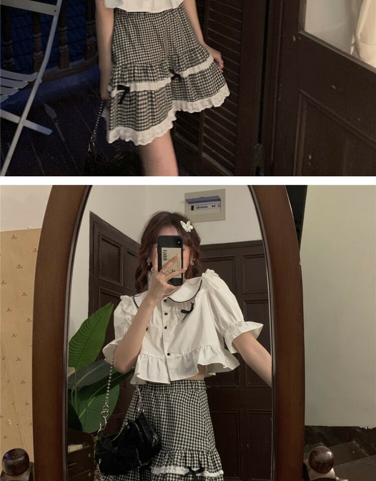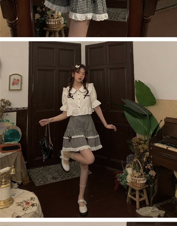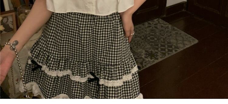 スカート サマーカラーショートシャツ トップス レース格子柄 大人ガーリー スウィート キュート カジュアル 夏物 萌量不足48370762672