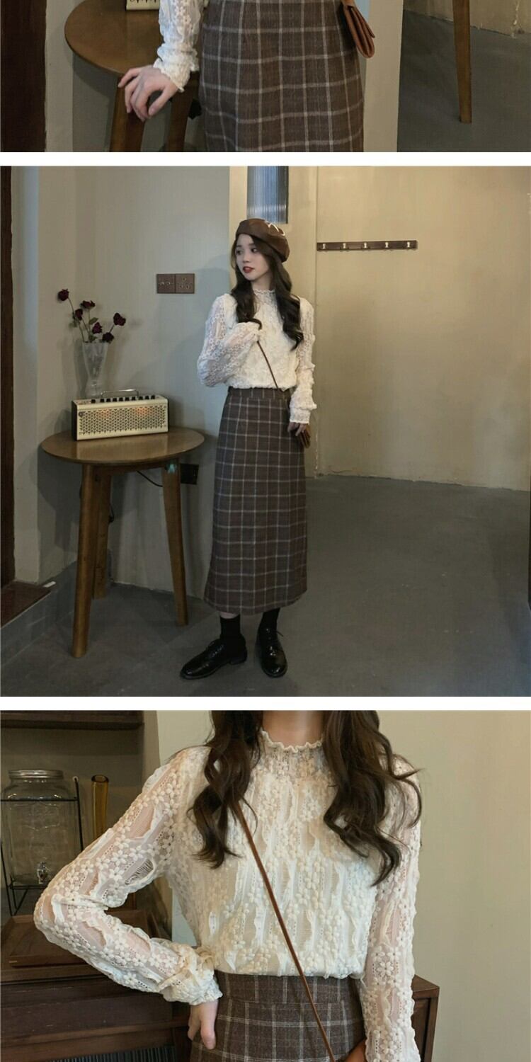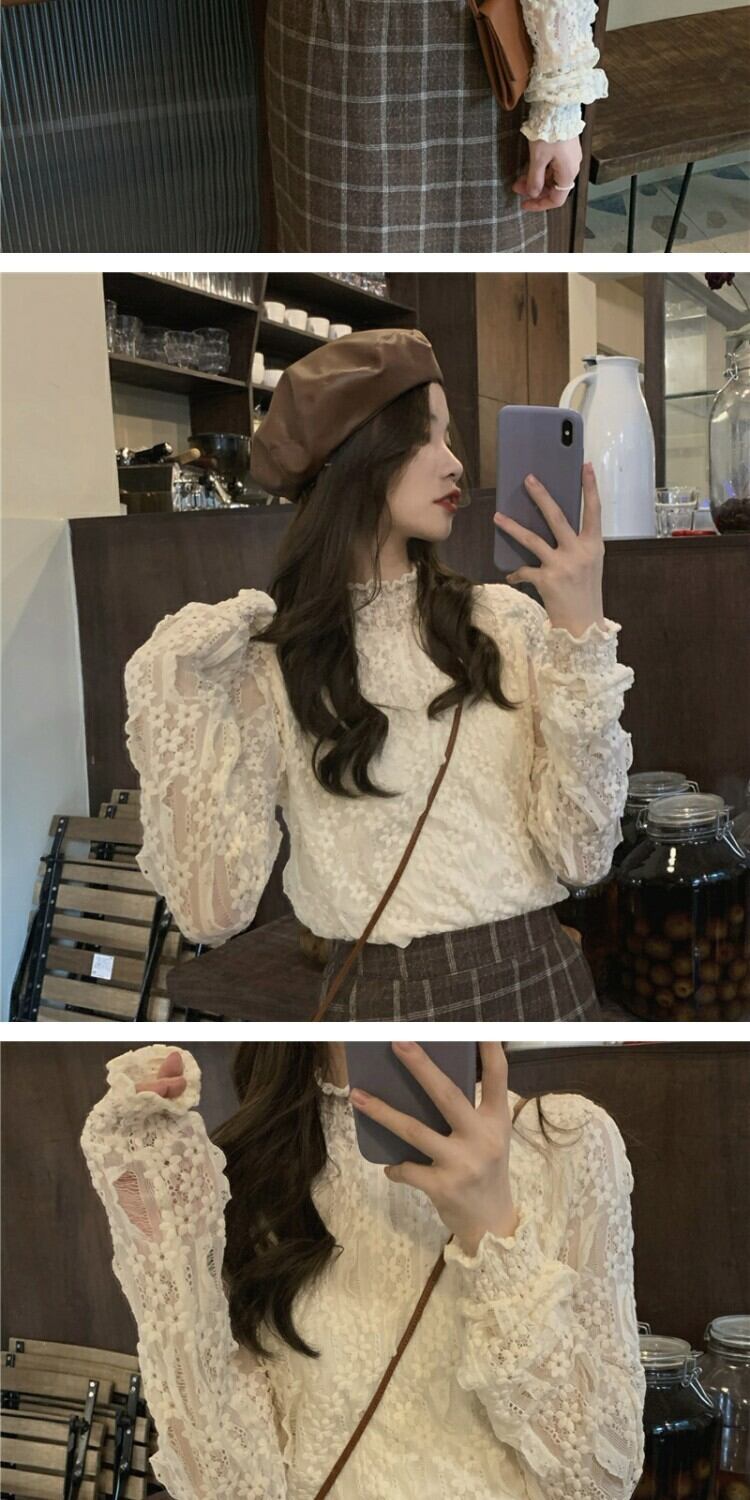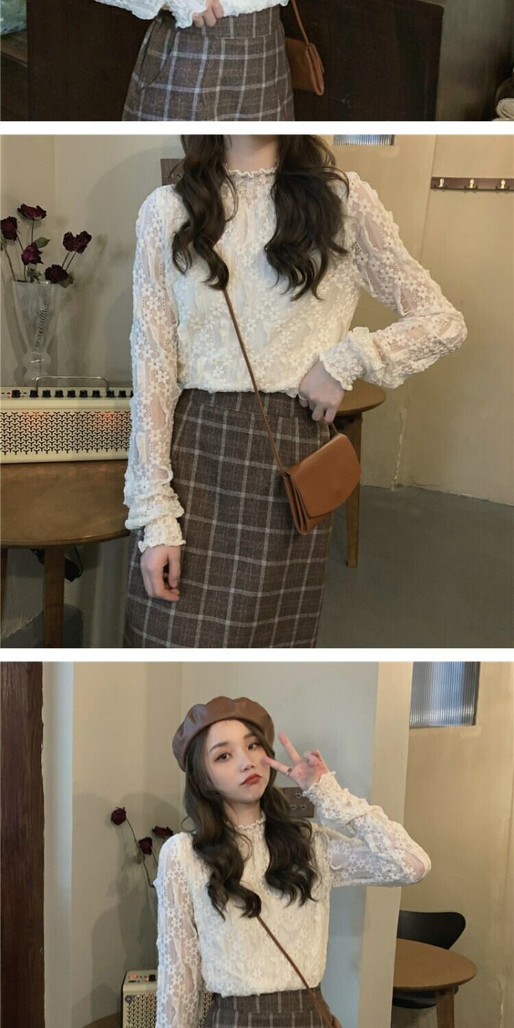 メッシュカラーレースシャツ オータムウィンタースタイルプルオーバー トップス ロング 秋物 冬物 萌量不足6623314789