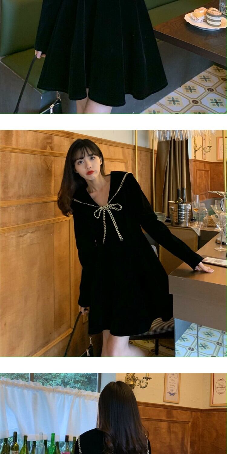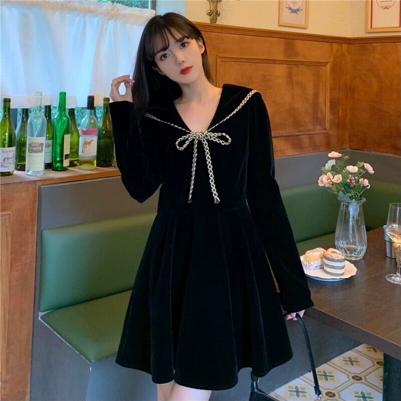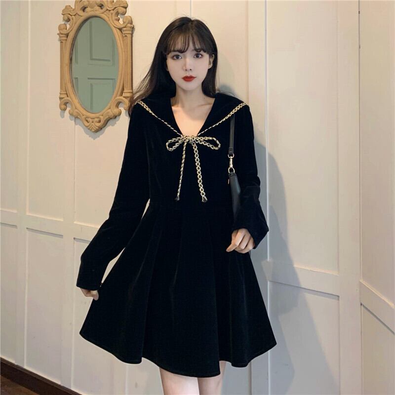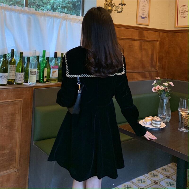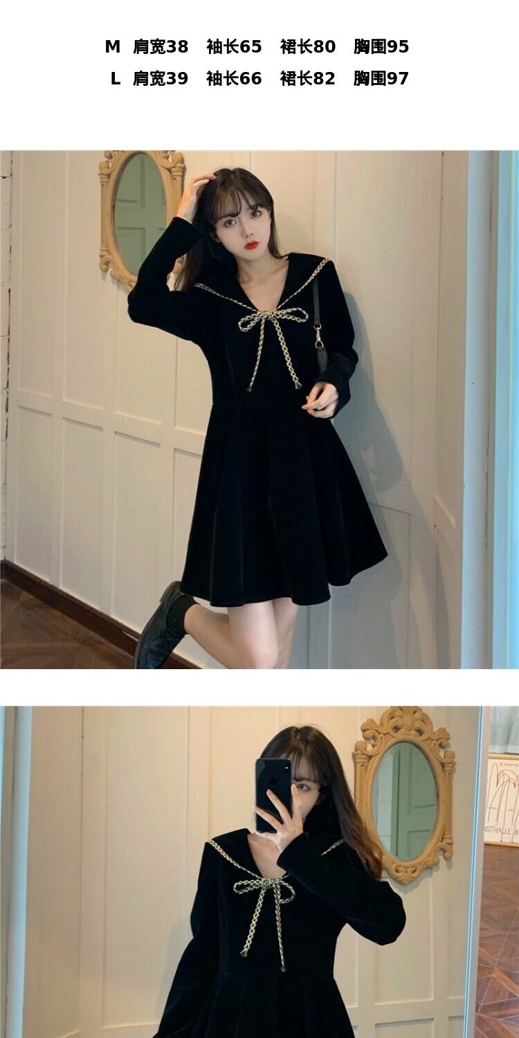 スプリングブラックドレス オータムウィンタースタイルベルベットネイビーカラー薄手 春物 秋物 冬物 萌量不足73773900702