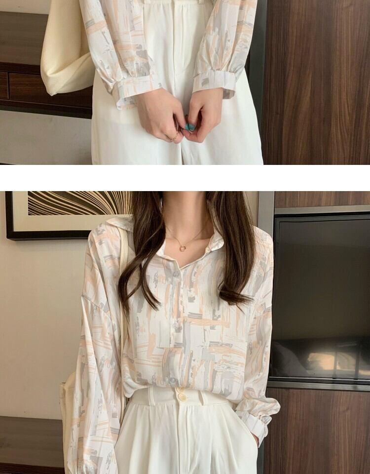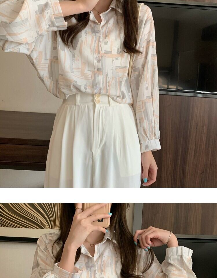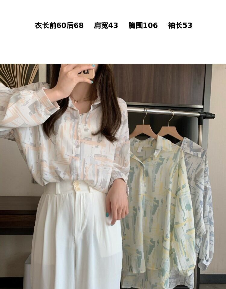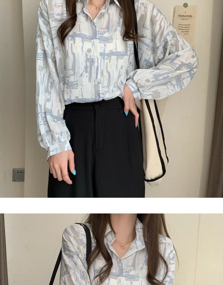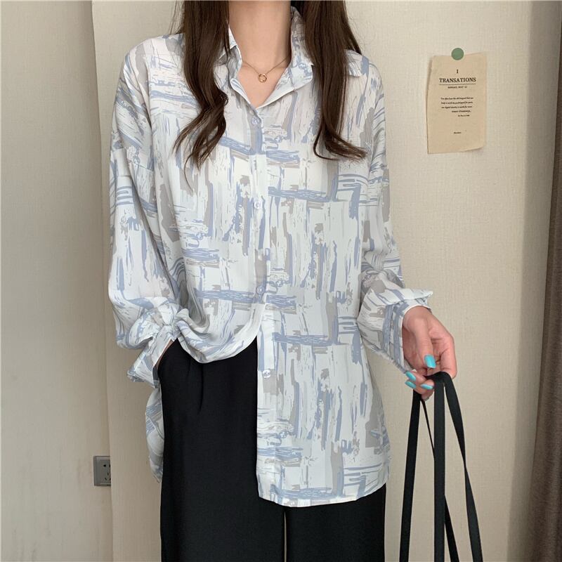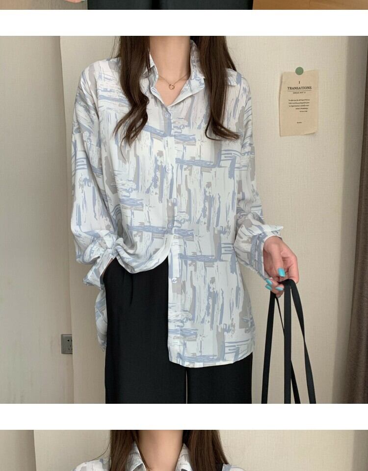 スタンダードルーズカジュアルプリント薄手シャツ レディーススタイルスプリングオータム ロング レトロ 春物 秋物 萌量不足98294371778