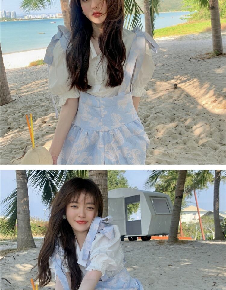 色:白いシャツ(シングルピース),ブルーサスペンダースカート(ワンピース)