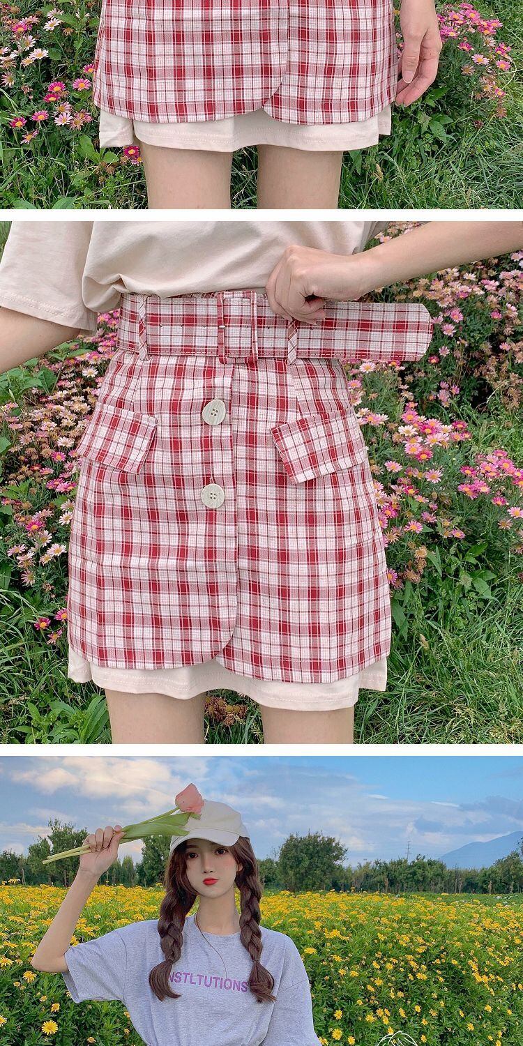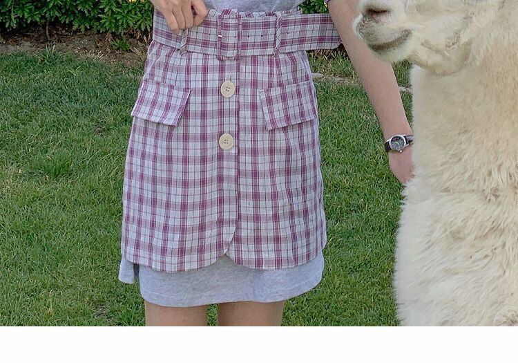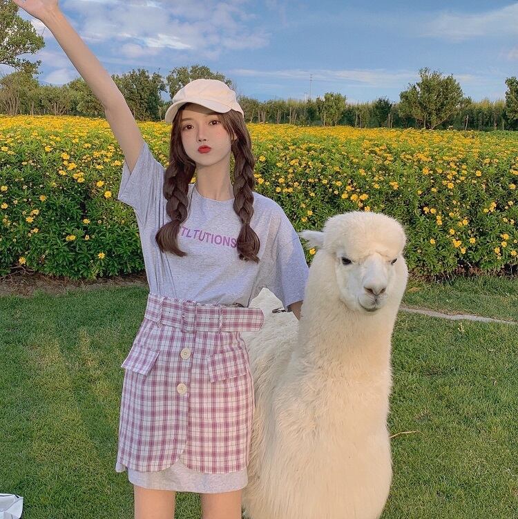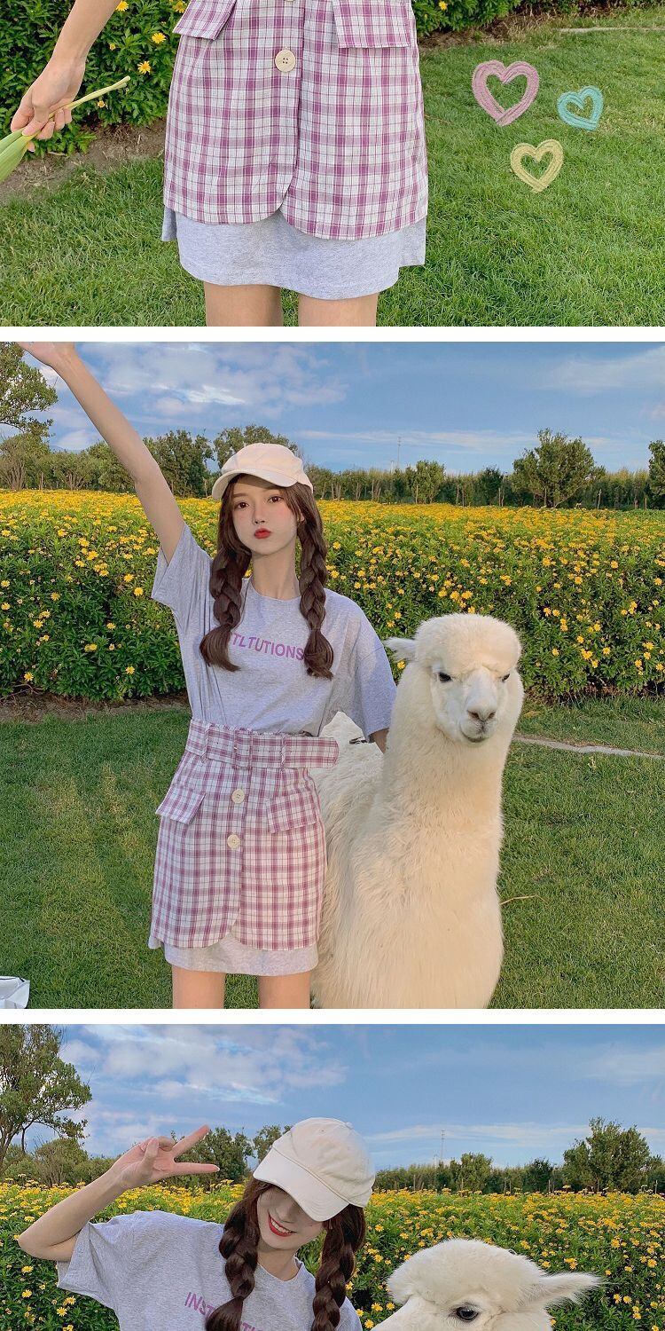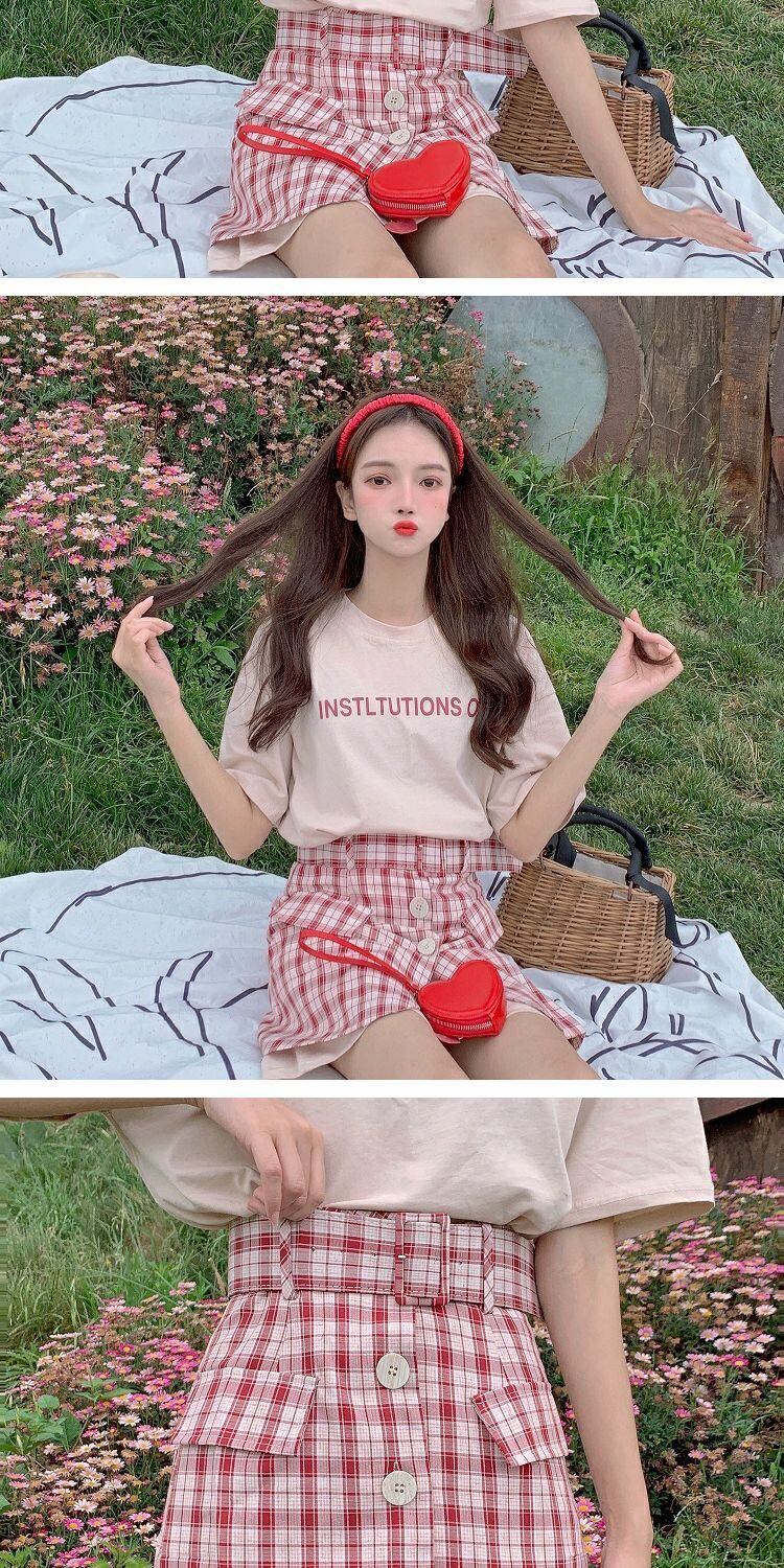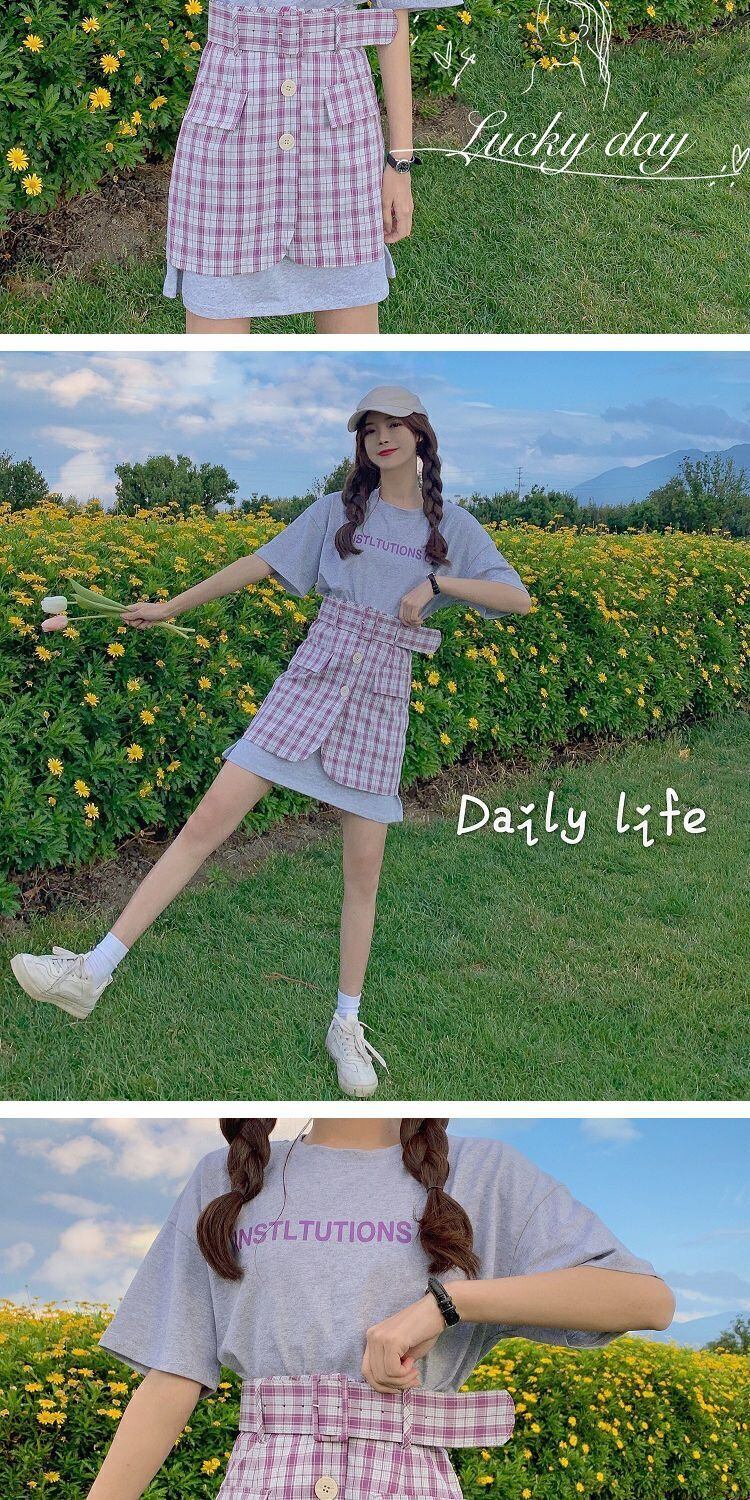 色:アプリコットT+レッドチェックスカート,グレーT+パープルチェックスカート