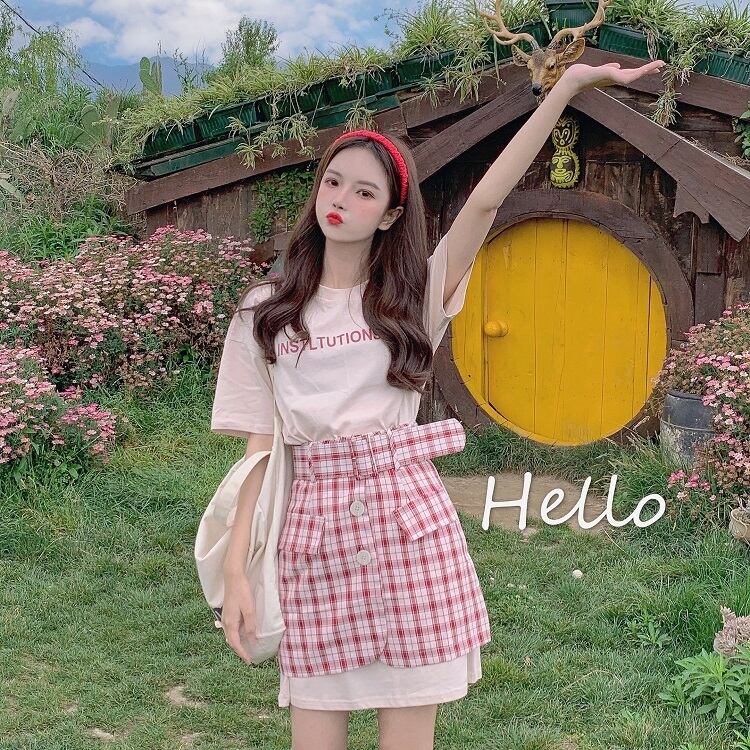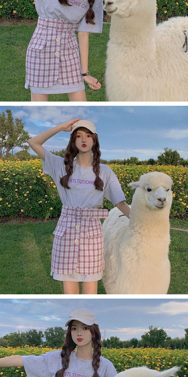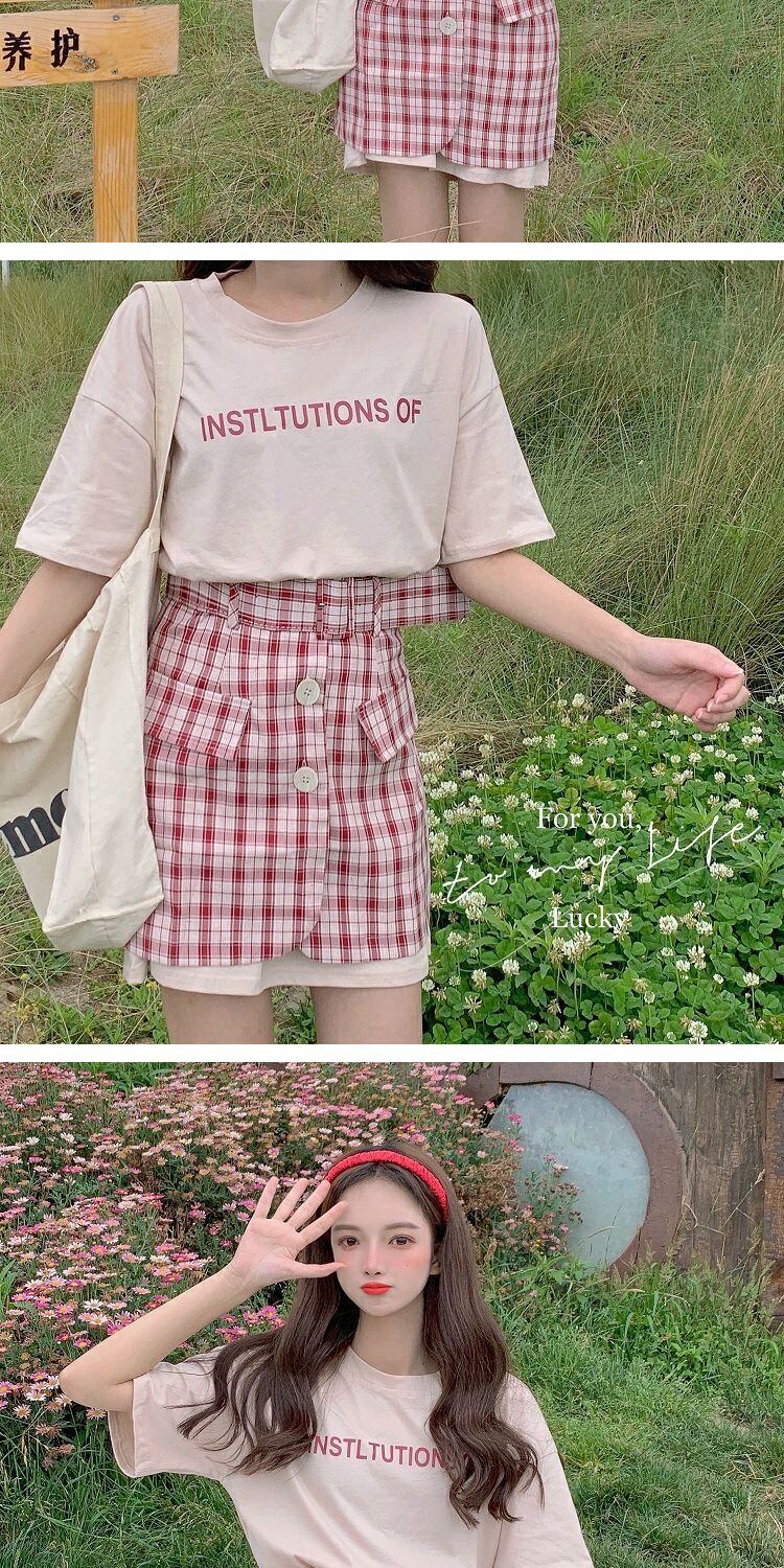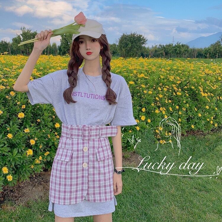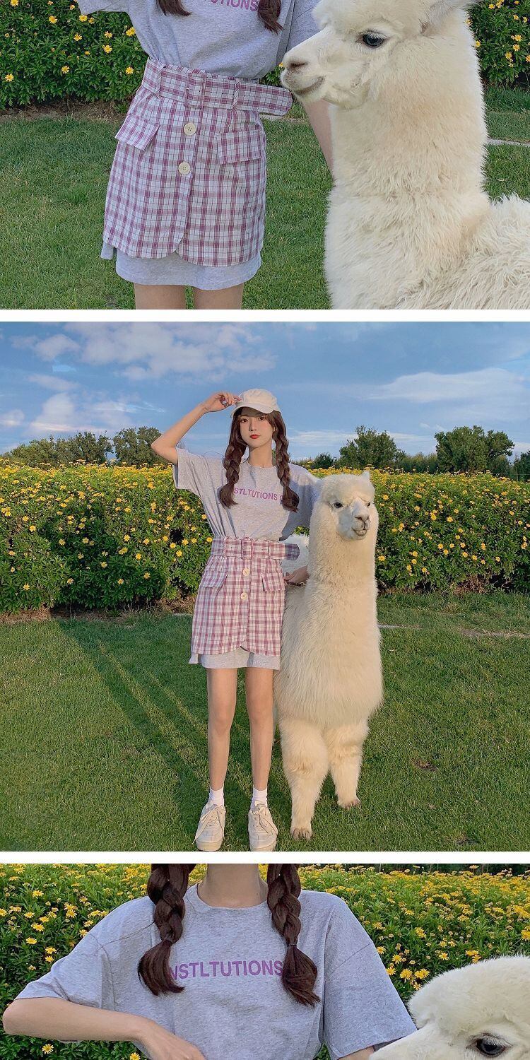 スプリングプリント柄Tシャツ 格子柄スカート スタイル 春物 萌量不足33002049913