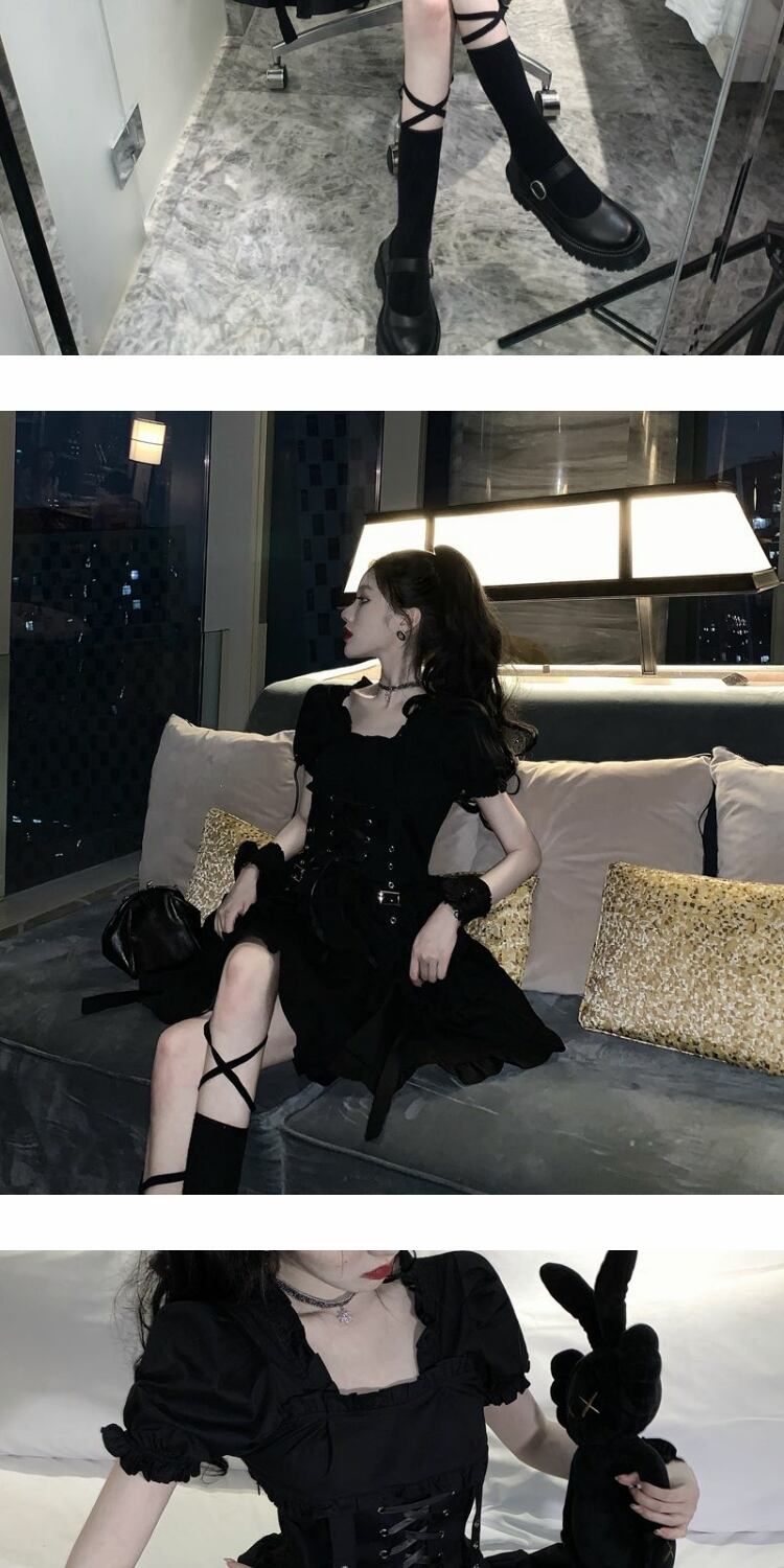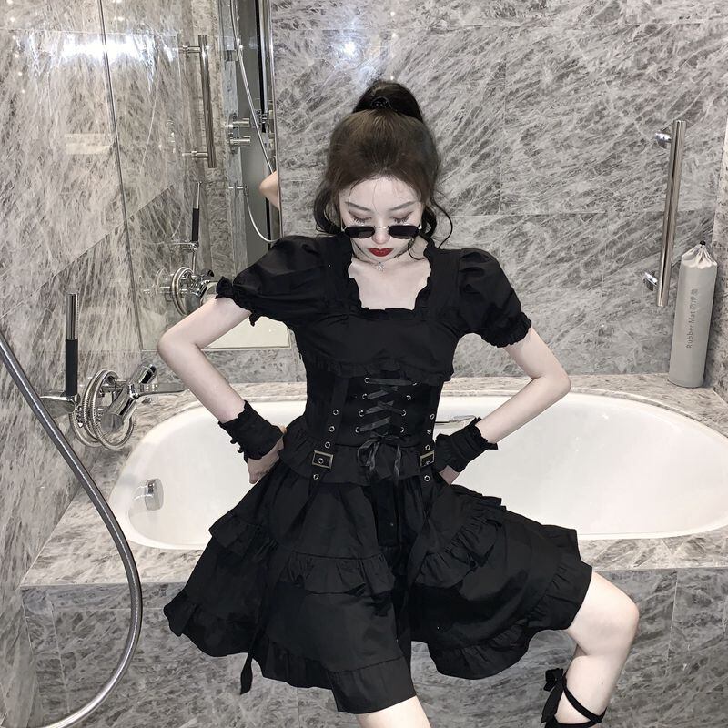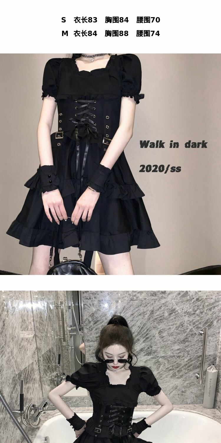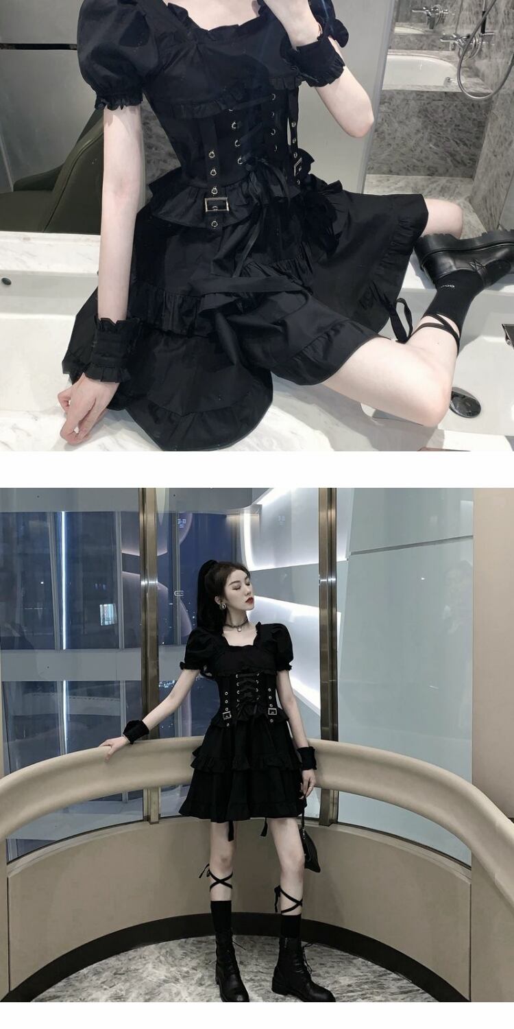 スカート サマーダークスリーブスタンダードブラックドレス レトロ 夏物 萌量不足77088725945