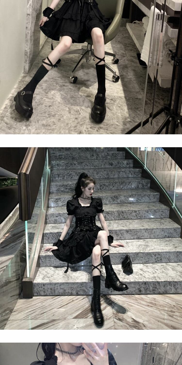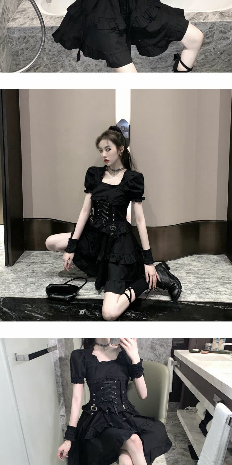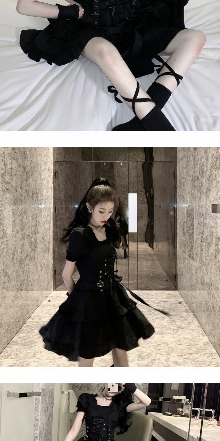 スカート サマーダークスリーブスタンダードブラックドレス レトロ 夏物 萌量不足77088725945