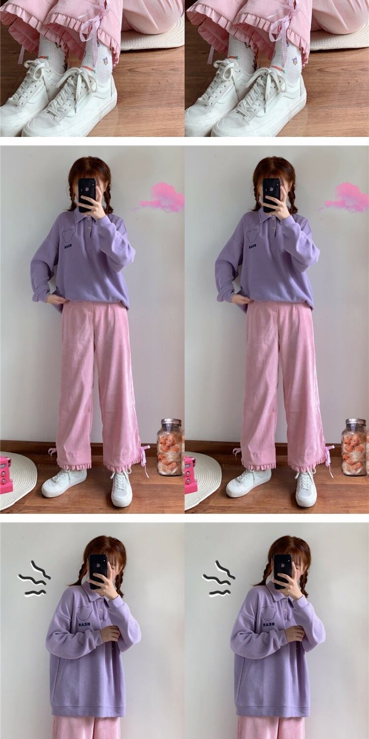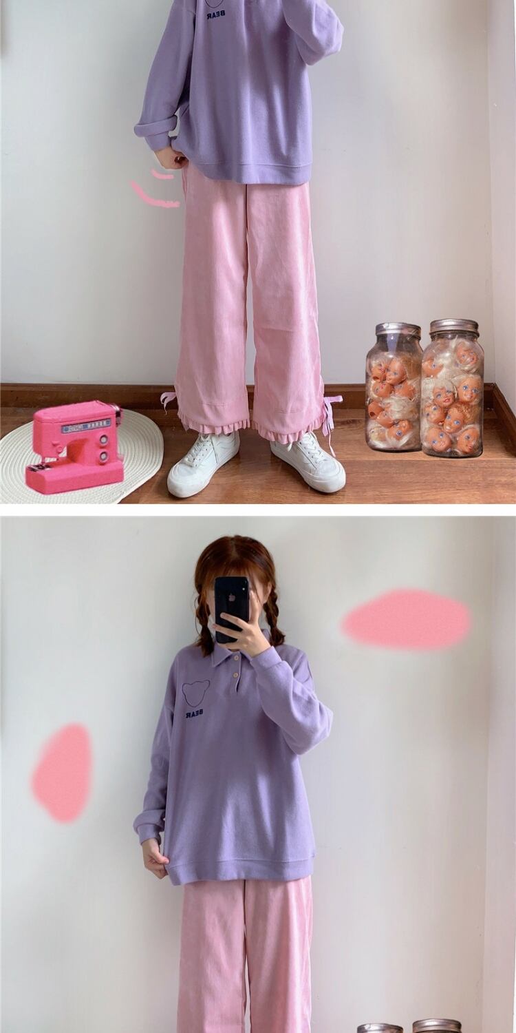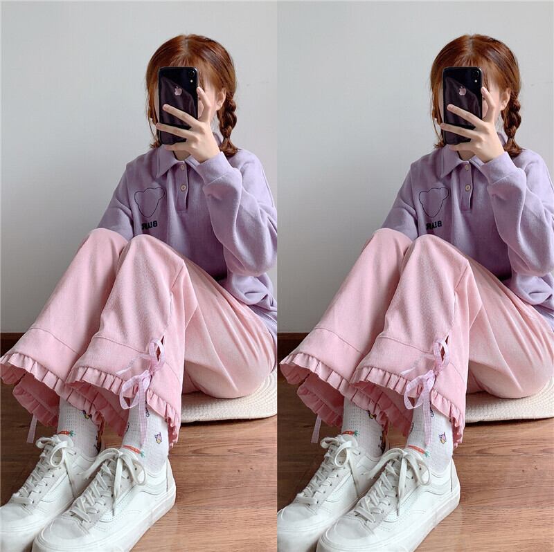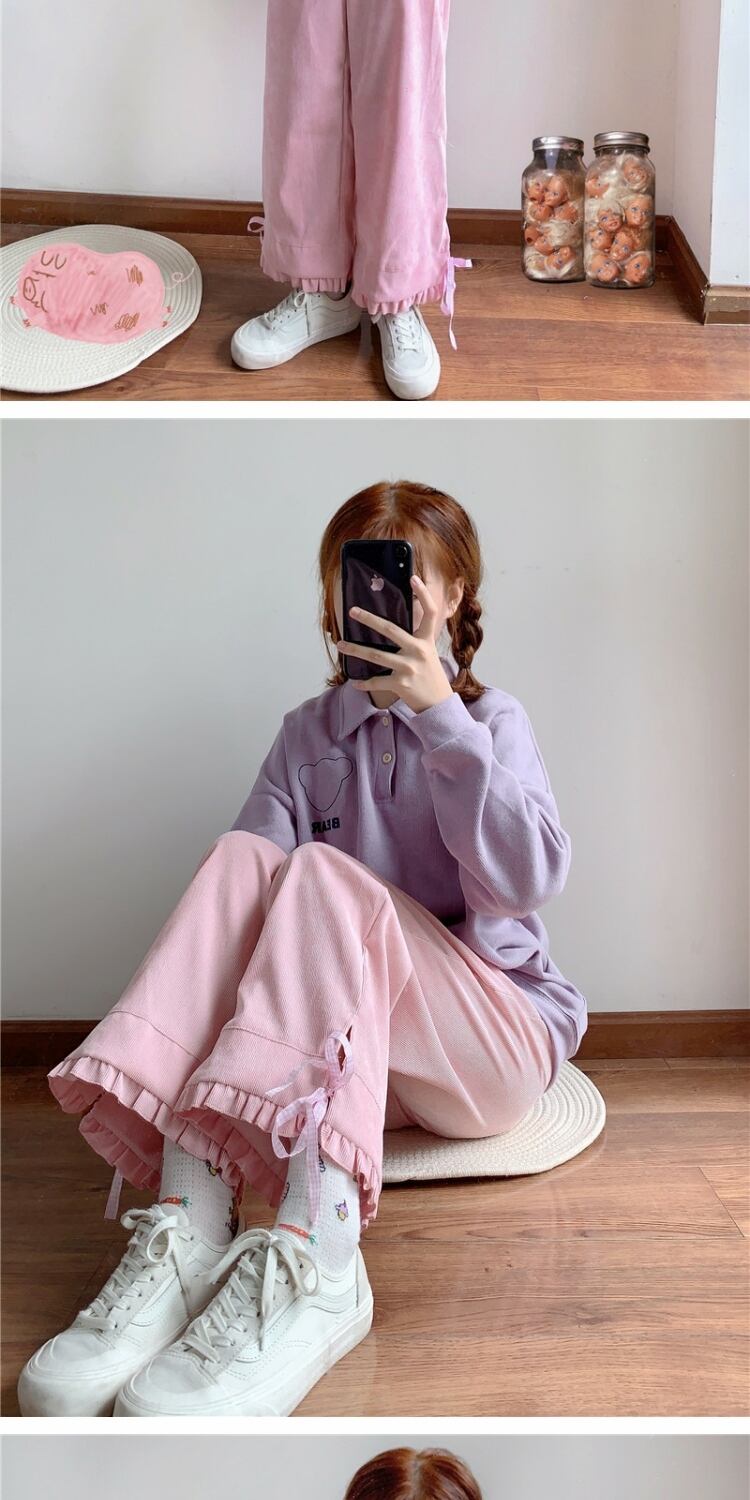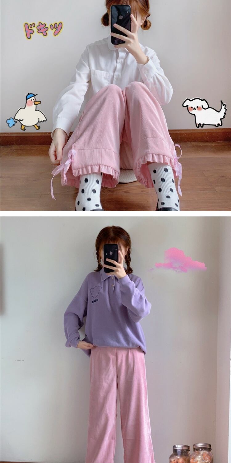 スプリングオータムパンツ リボンハイウェストウェストワイドレッグカジュアルレディース ピンク 大人ガーリー スウィート キュート 春物 秋物 ワイドパンツ 萌量不足84356175870