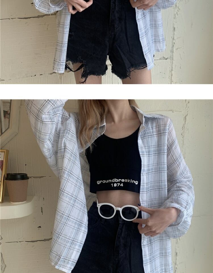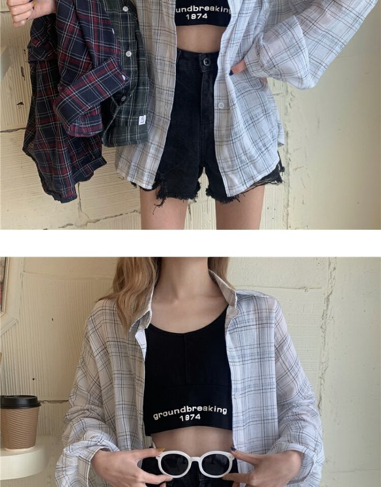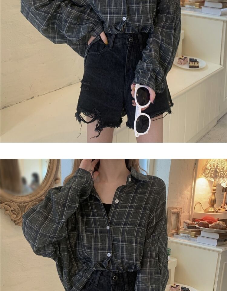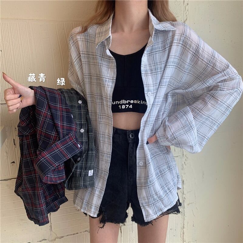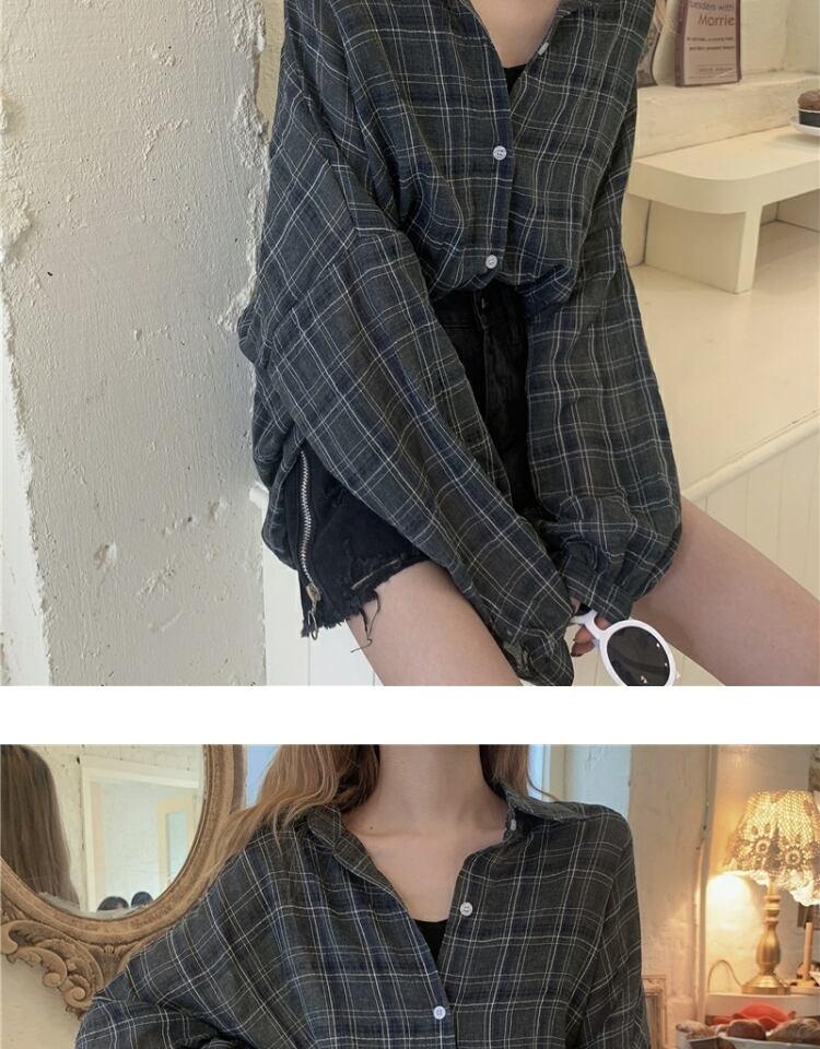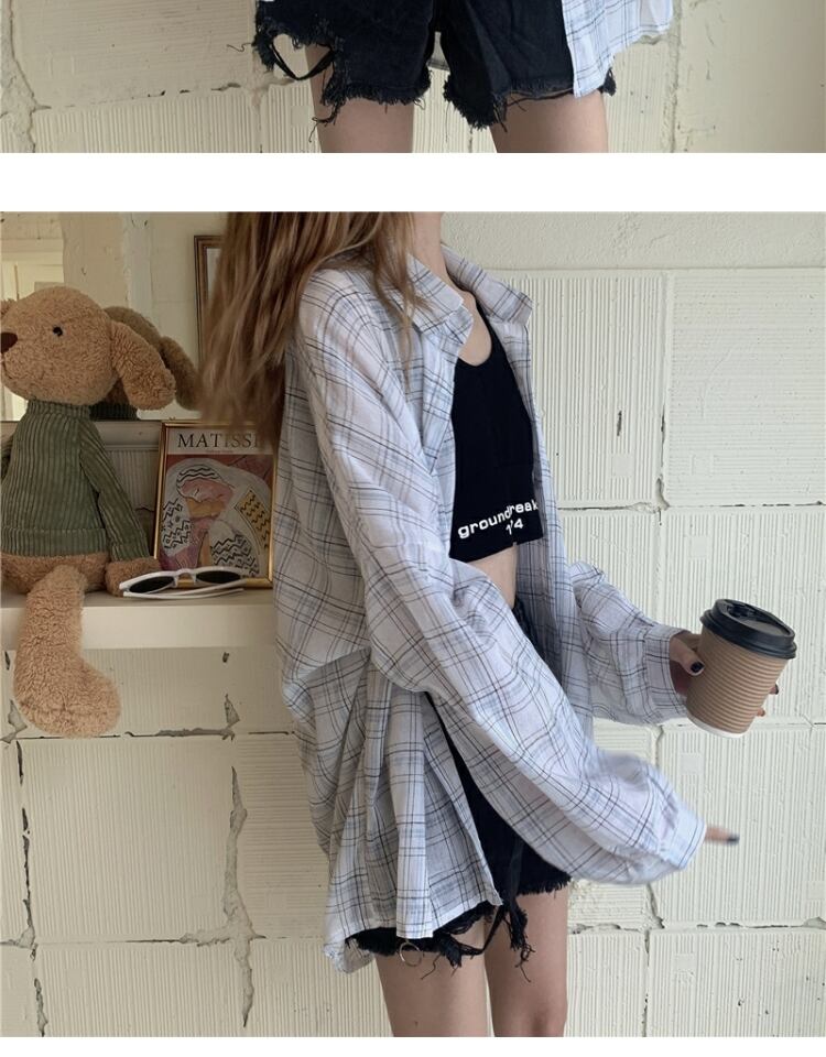 スプリングオータムスタンダード格子柄シャツ サマー薄手カジュアルルーズトップス ロング レトロ 春物 夏物 秋物 萌量不足80770237790
