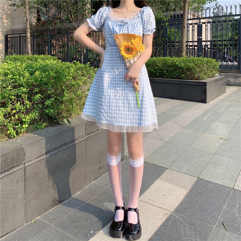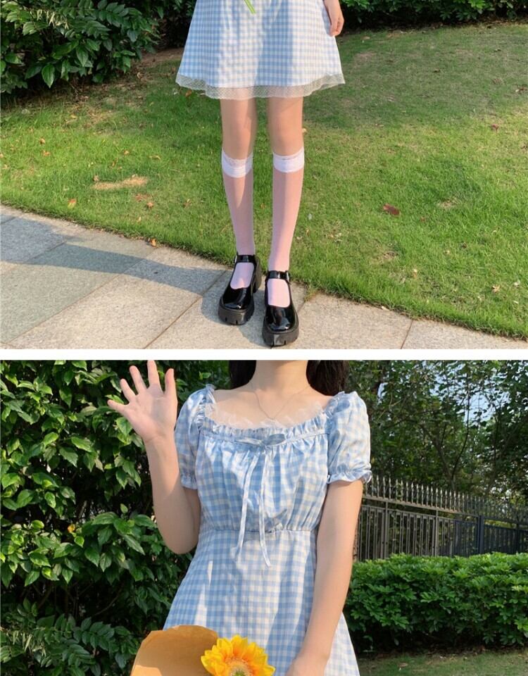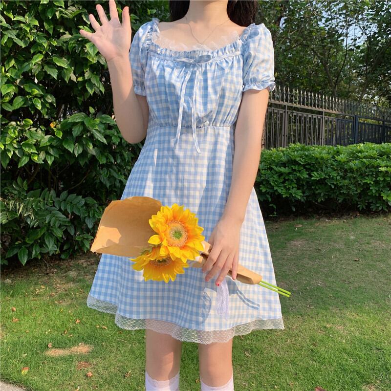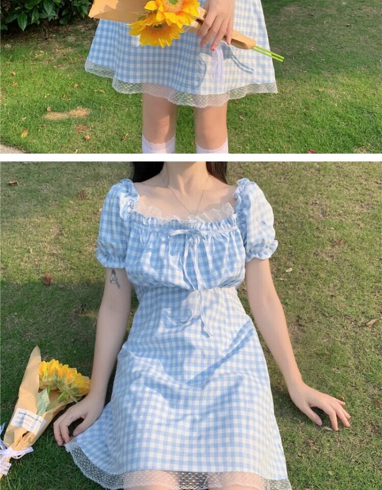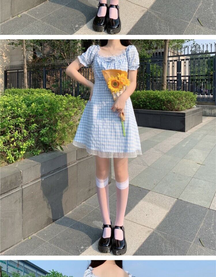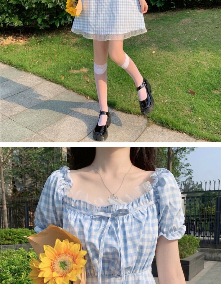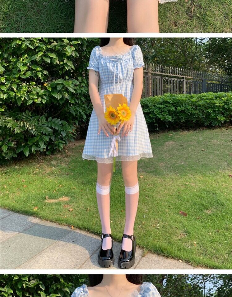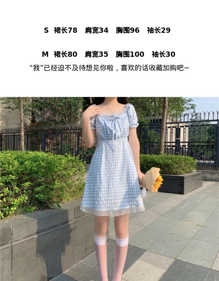 ブルー格子柄ドレス サマーレーススリーブウェスト薄手スカート 大人ガーリー スウィート キュート カジュアル 夏物 スクウェア 萌量不足71011193265