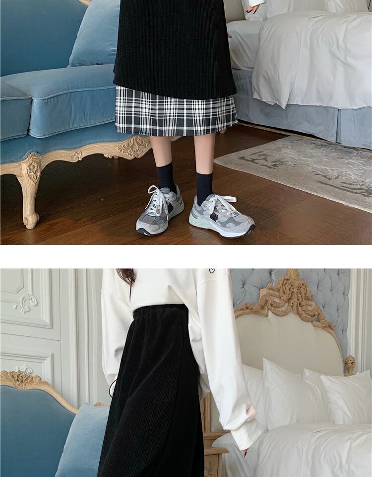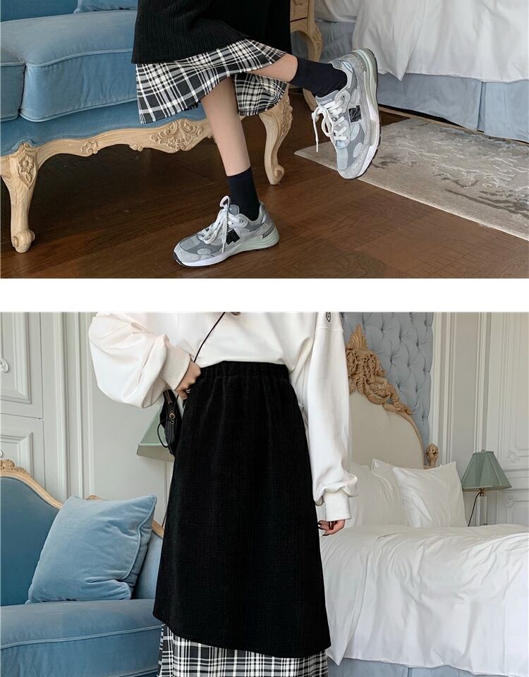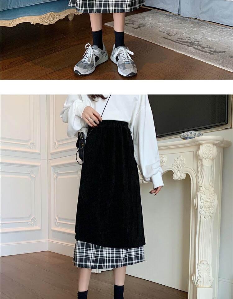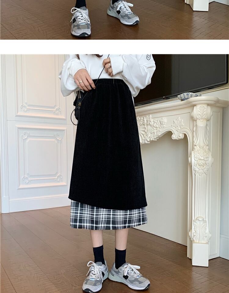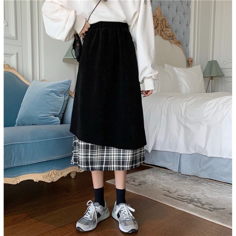 コーデュロイ格子柄スカート ブラックハイウェストウェストロングAライン ステッチ 萌量不足26830492063