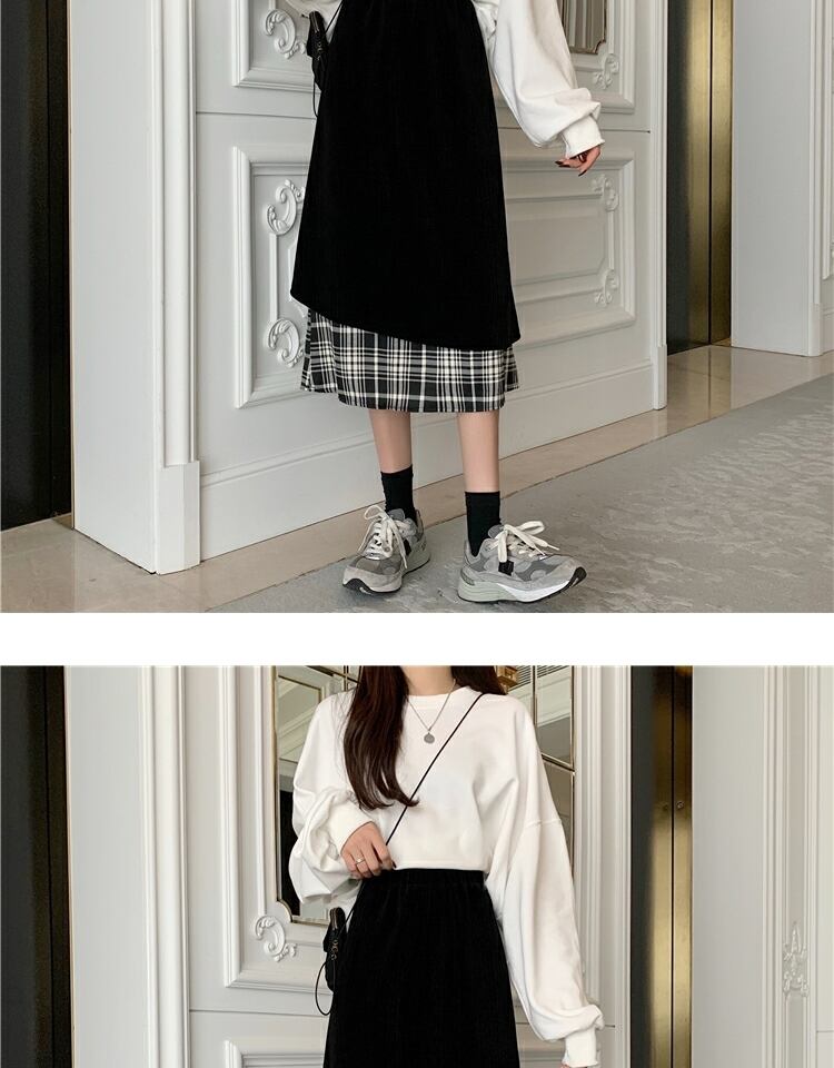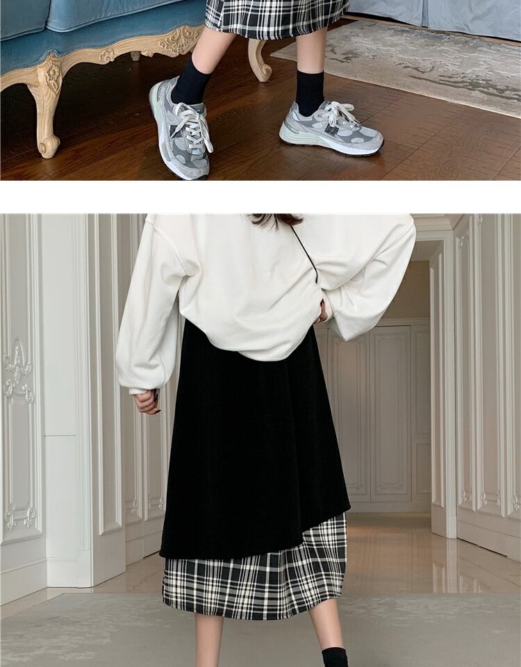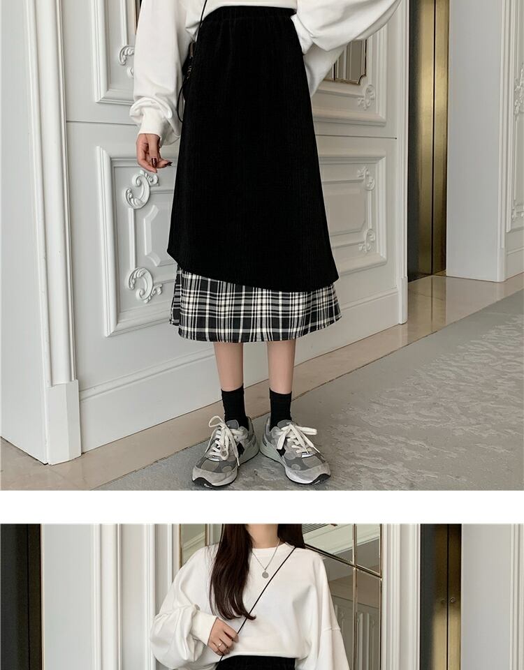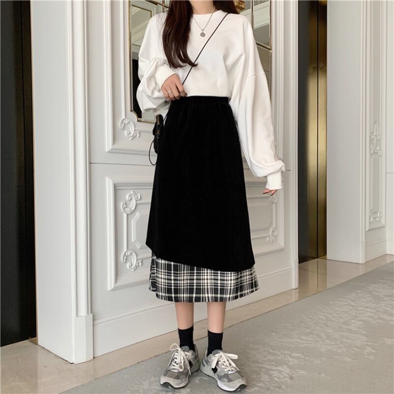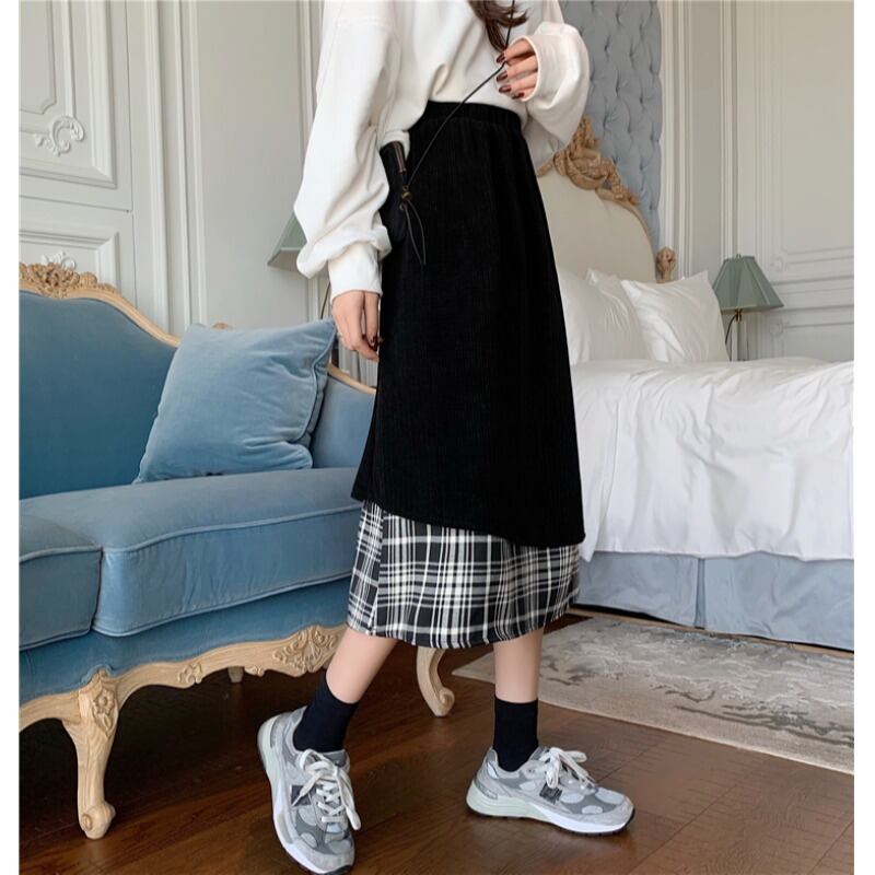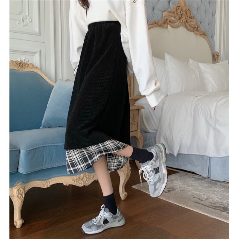 コーデュロイ格子柄スカート ブラックハイウェストウェストロングAライン ステッチ 萌量不足26830492063