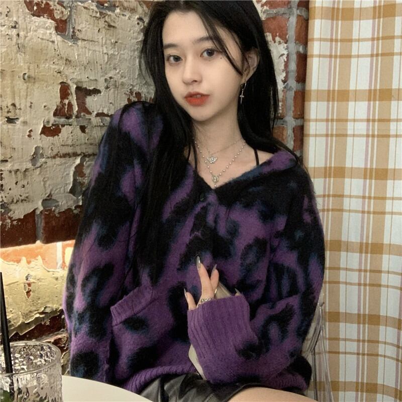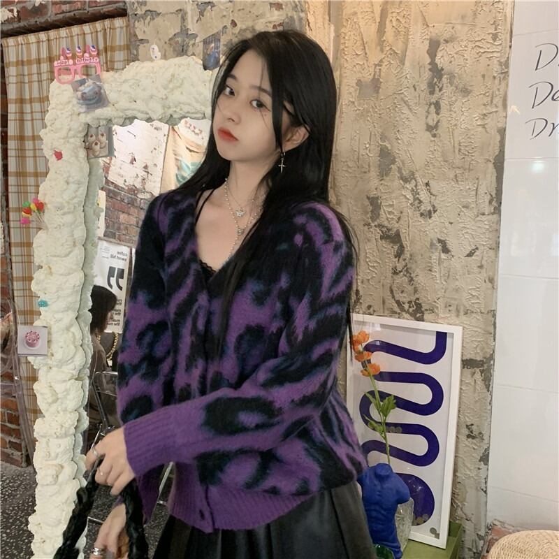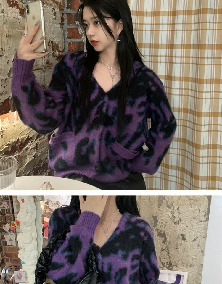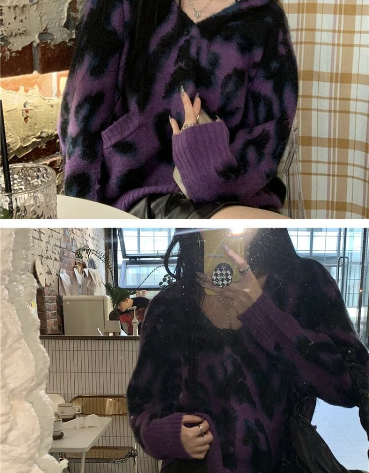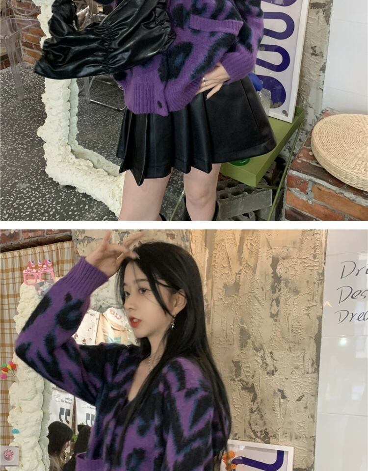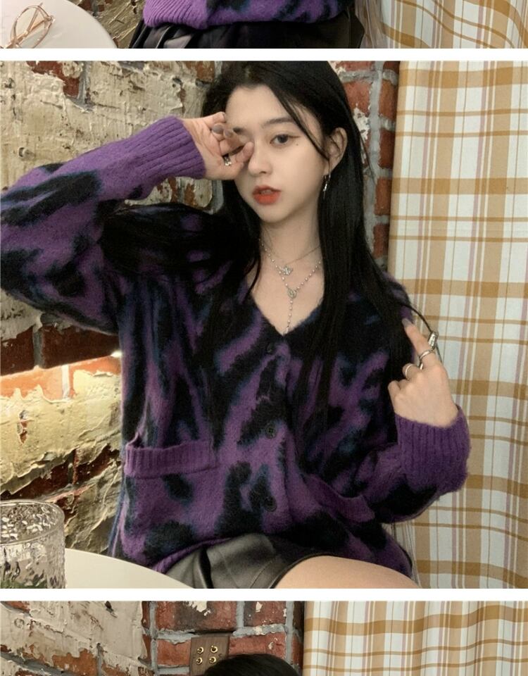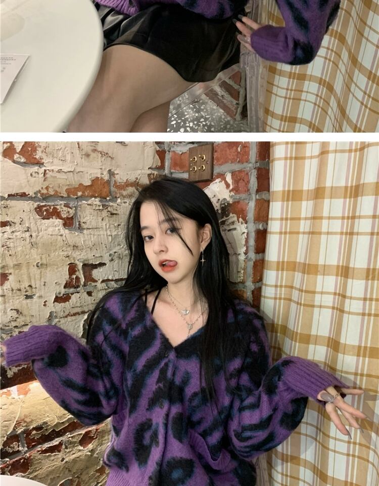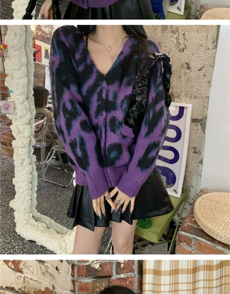 スタンダードスタイルホワイトレオパードセーター カーディガン レトロ 大人ガーリー スウィート キュート カジュアル パープル 萌量不足38171546913