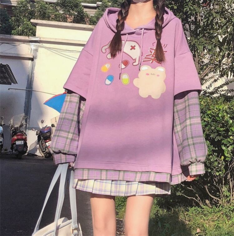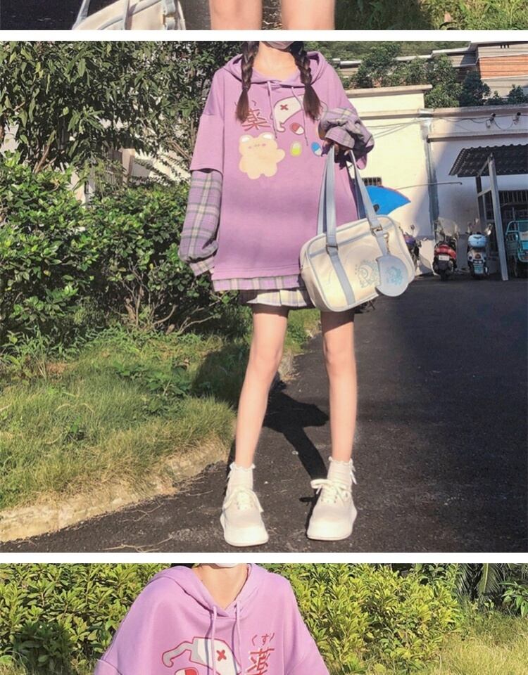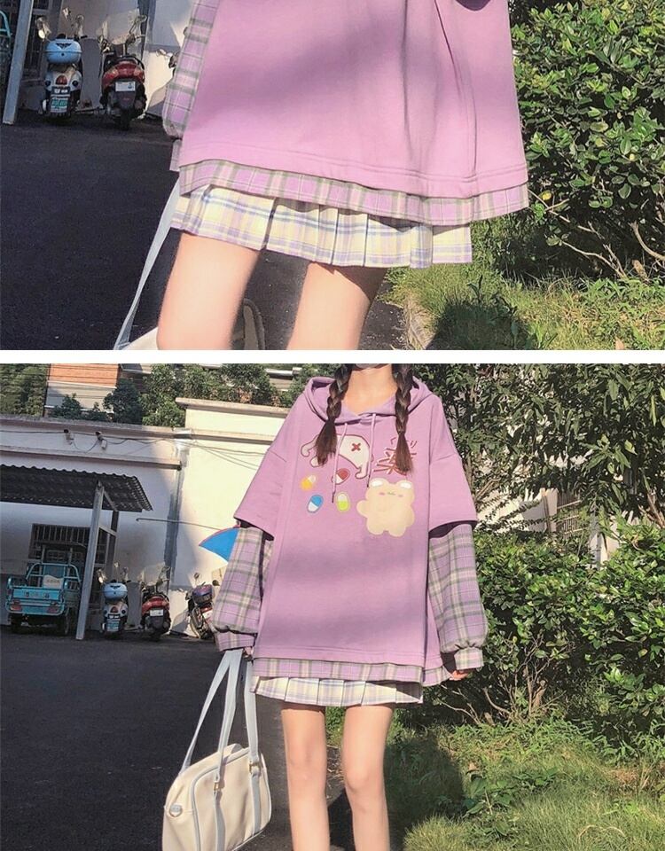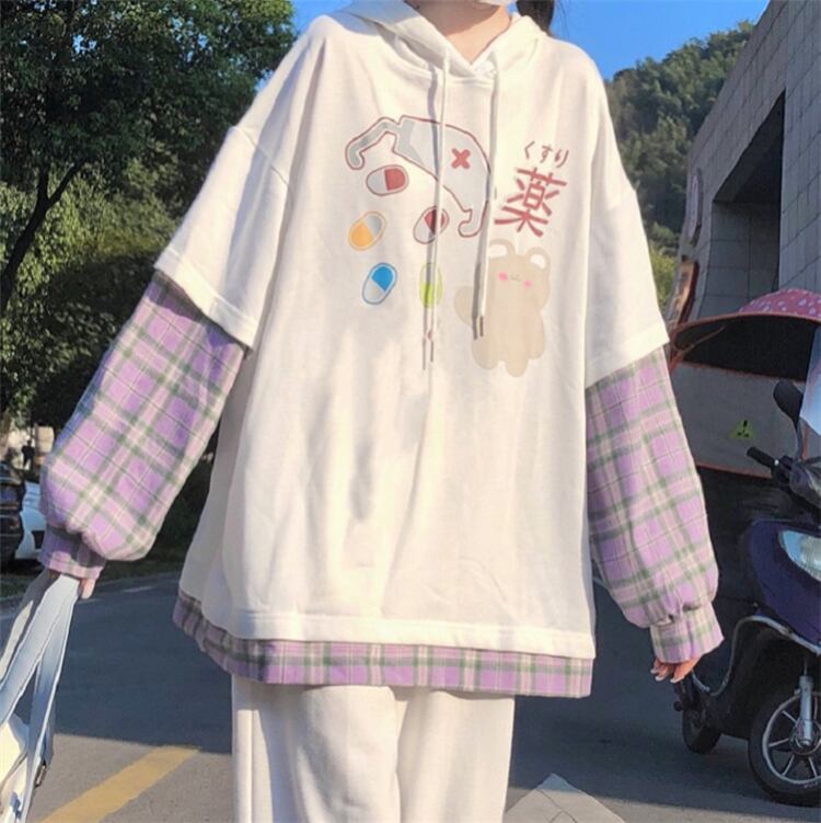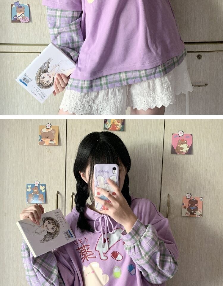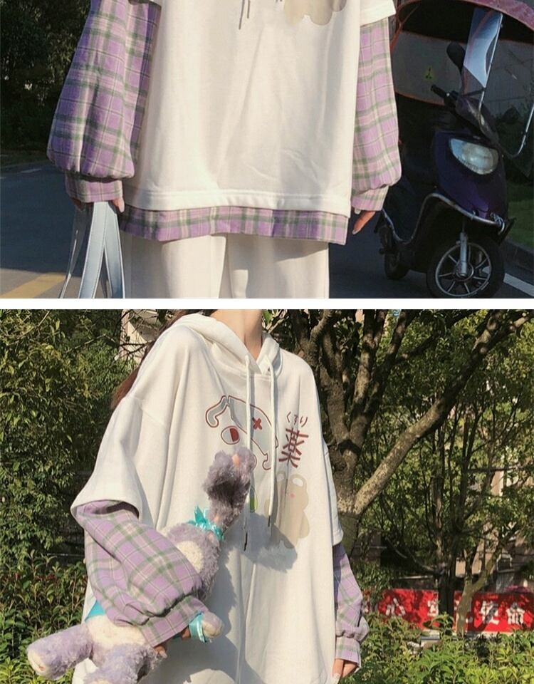 プリント格子柄フードセーター レディーススプリングオータムルーズブラウス ロング 春物 秋物 萌量不足43001631784