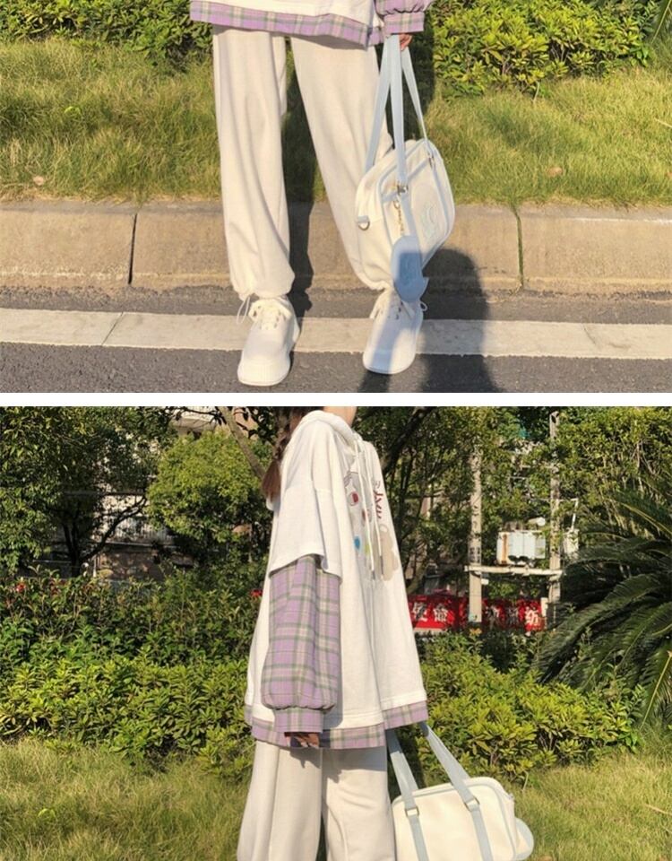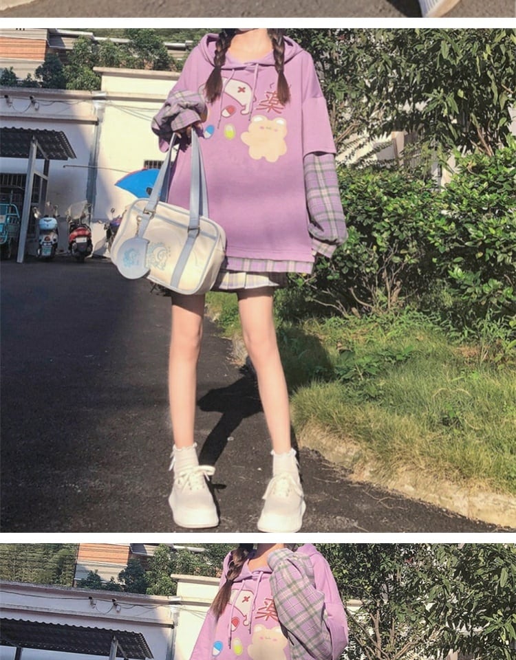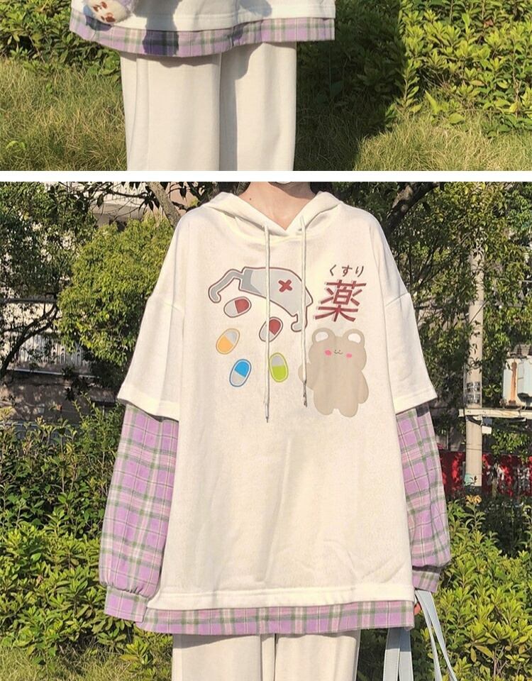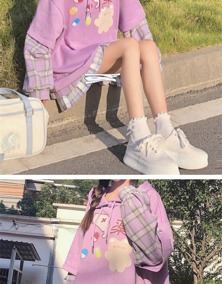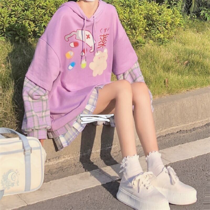 プリント格子柄フードセーター レディーススプリングオータムルーズブラウス ロング 春物 秋物 萌量不足43001631784
