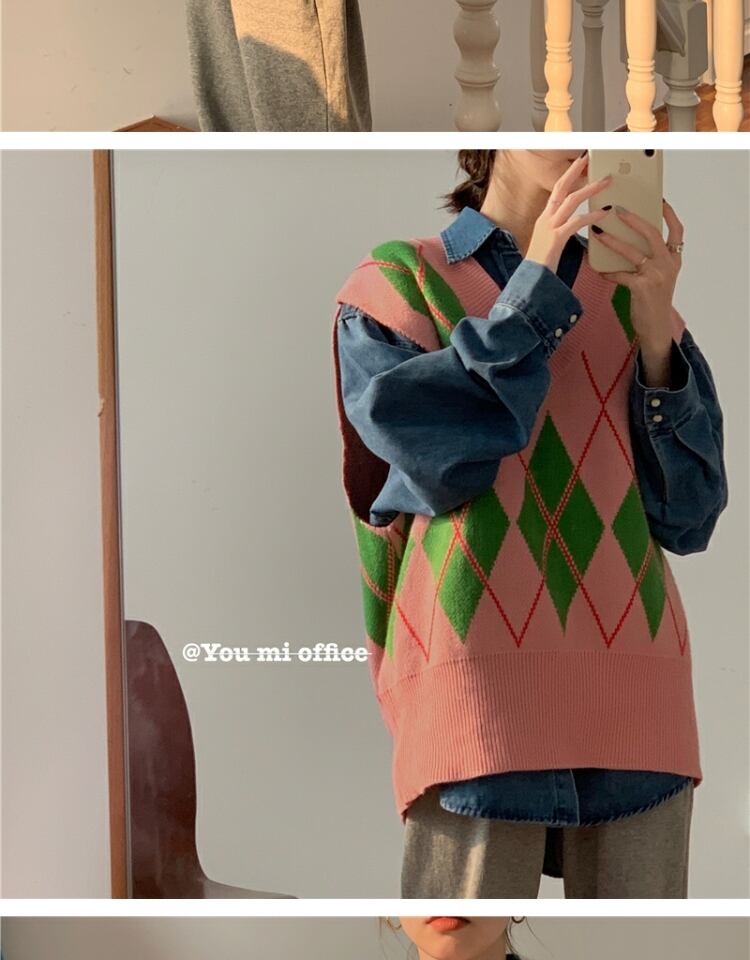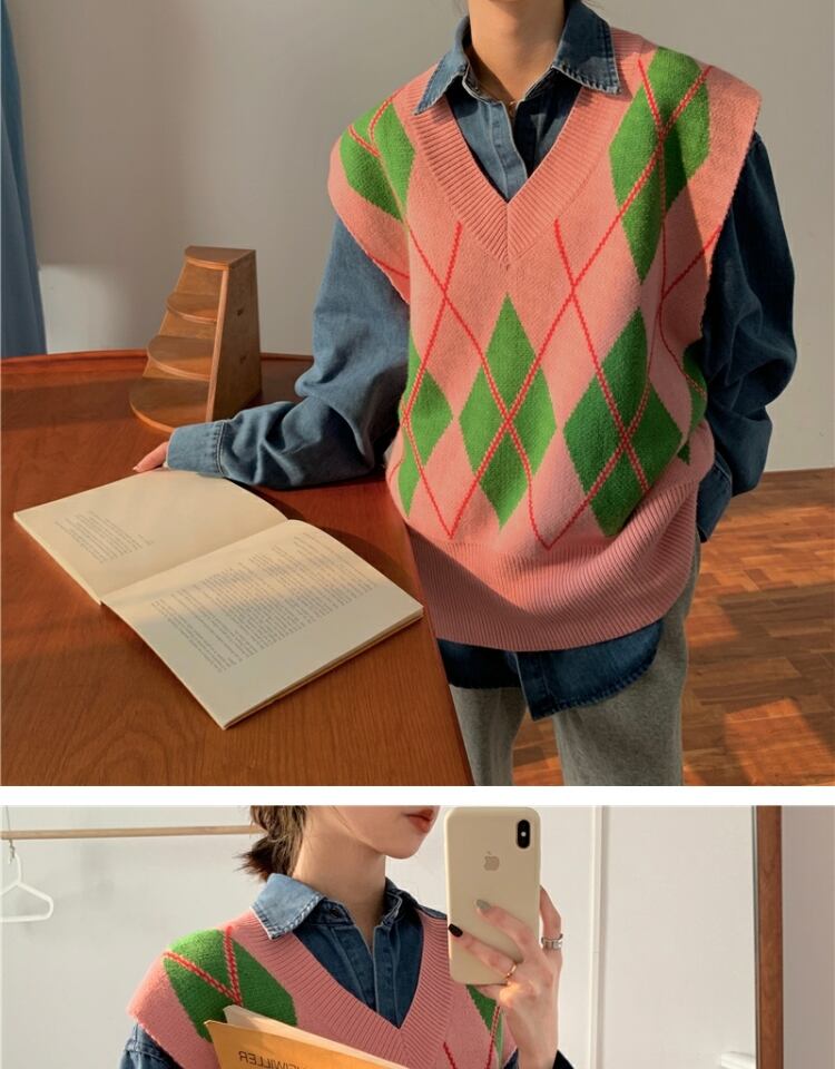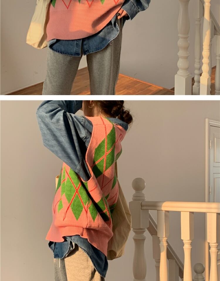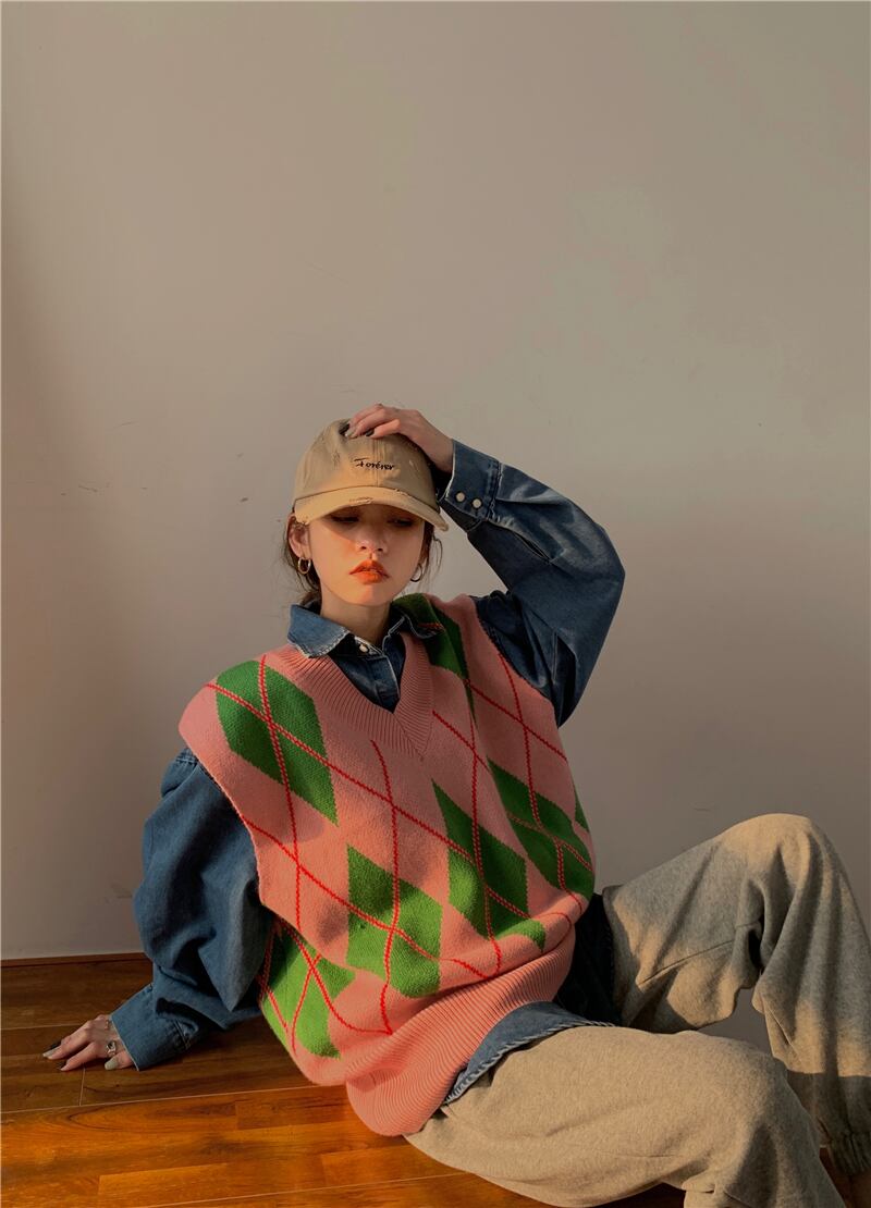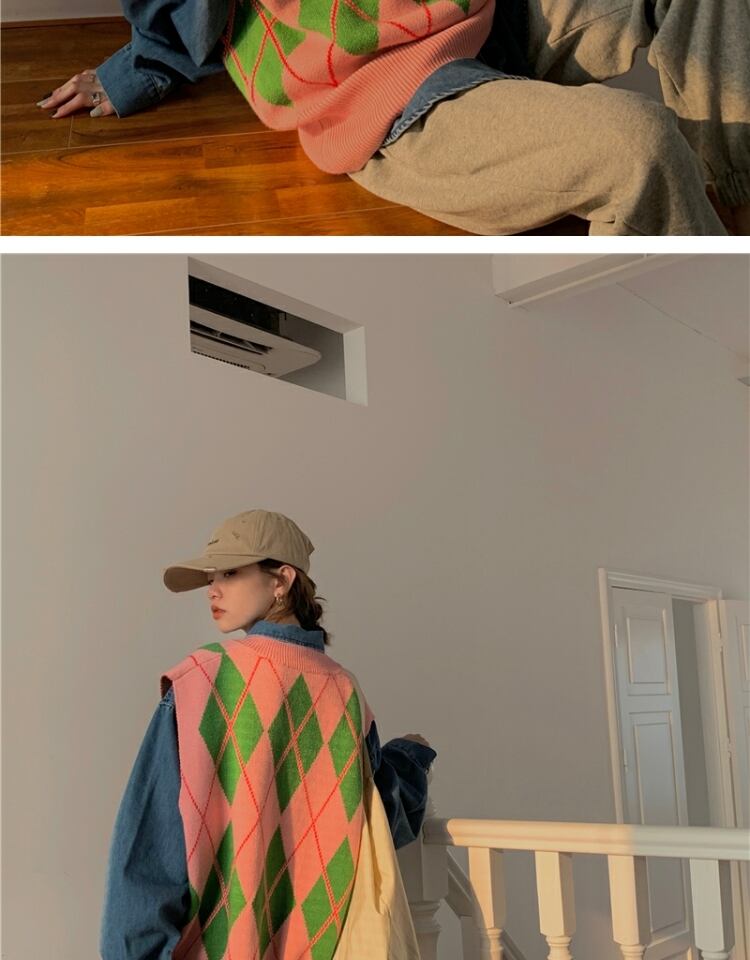 スタンダード格子柄セーター ノースリーブレディーススプリングオータムルーズプルオーバー トップス ピンク レトロ 春物 秋物 萌量不足26728527000