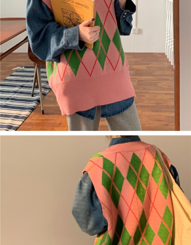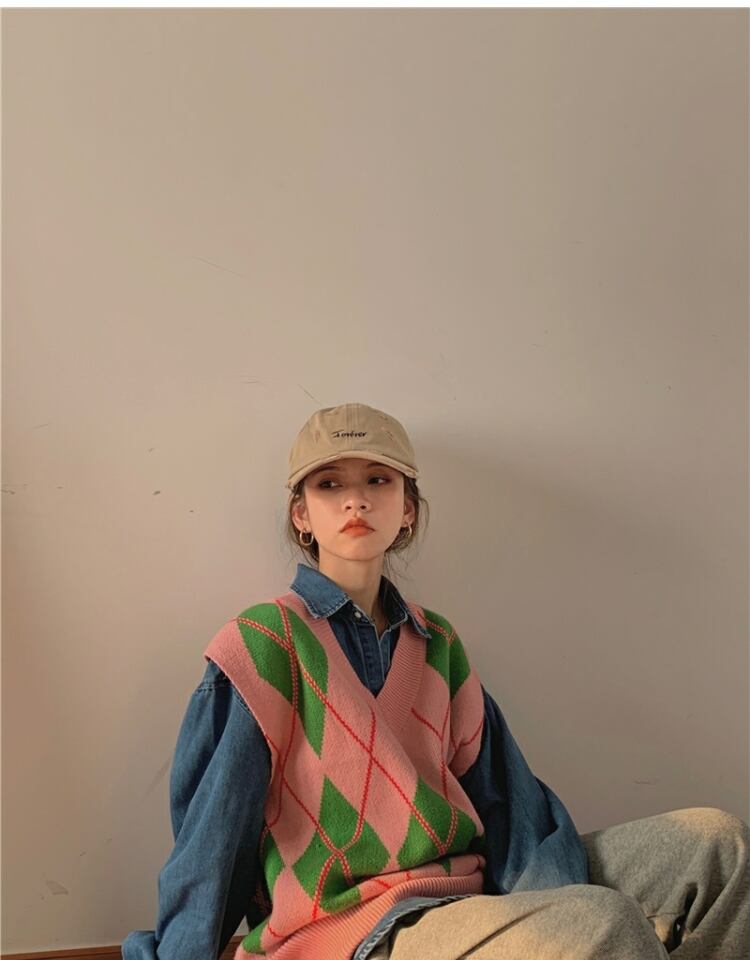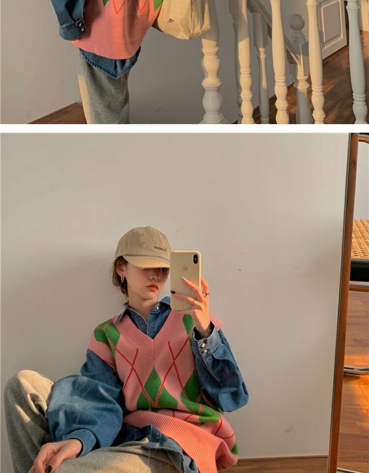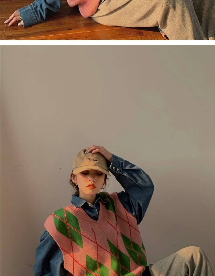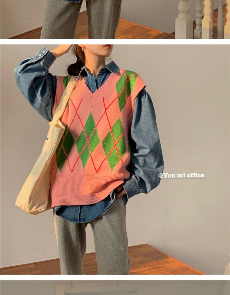 スタンダード格子柄セーター ノースリーブレディーススプリングオータムルーズプルオーバー トップス ピンク レトロ 春物 秋物 萌量不足26728527000