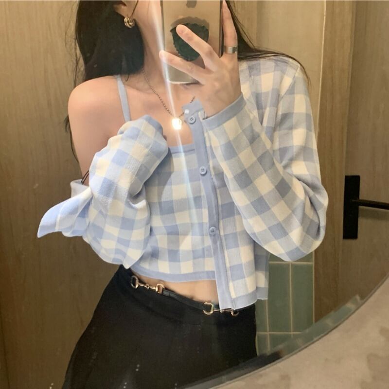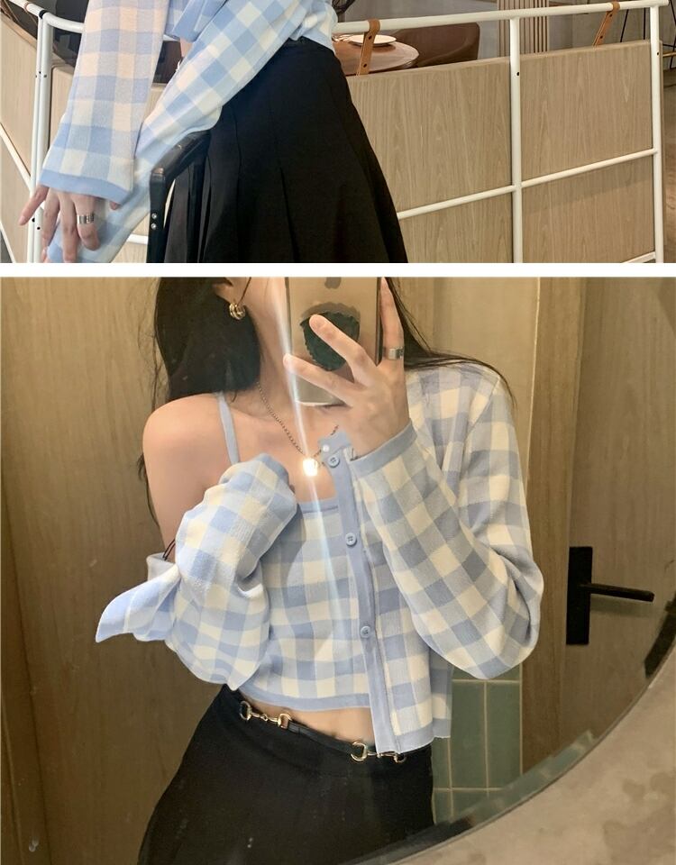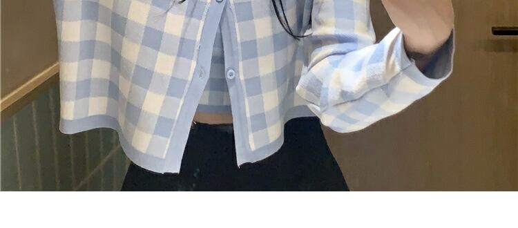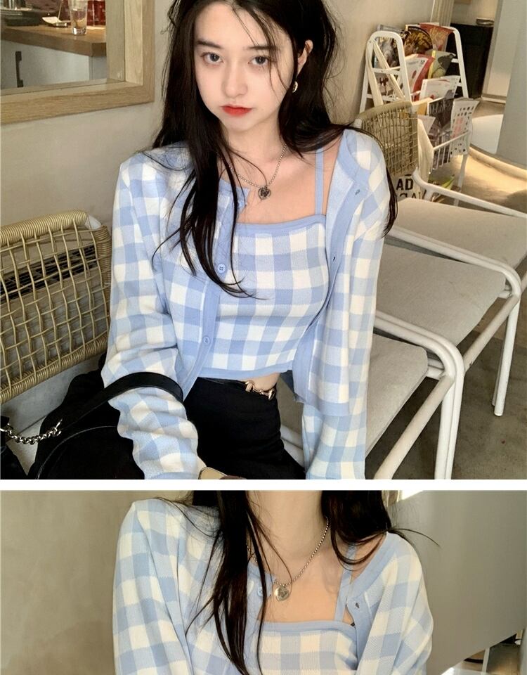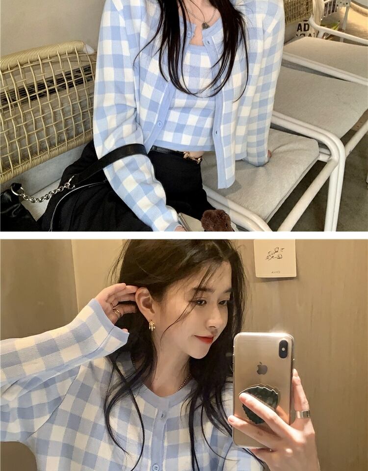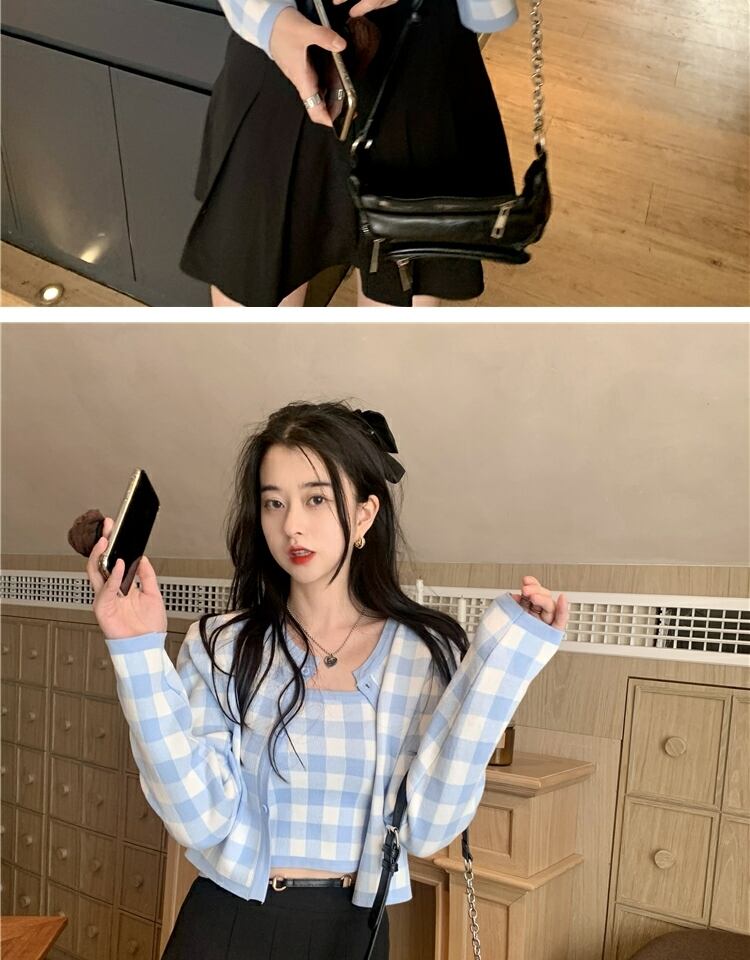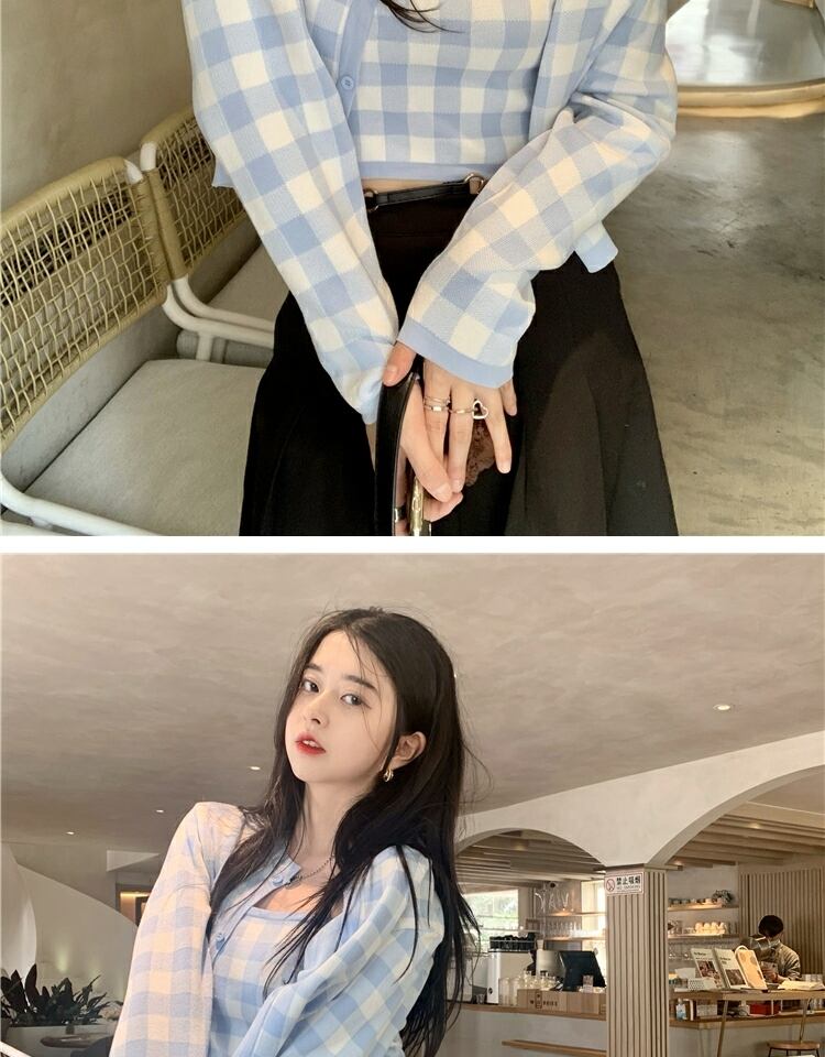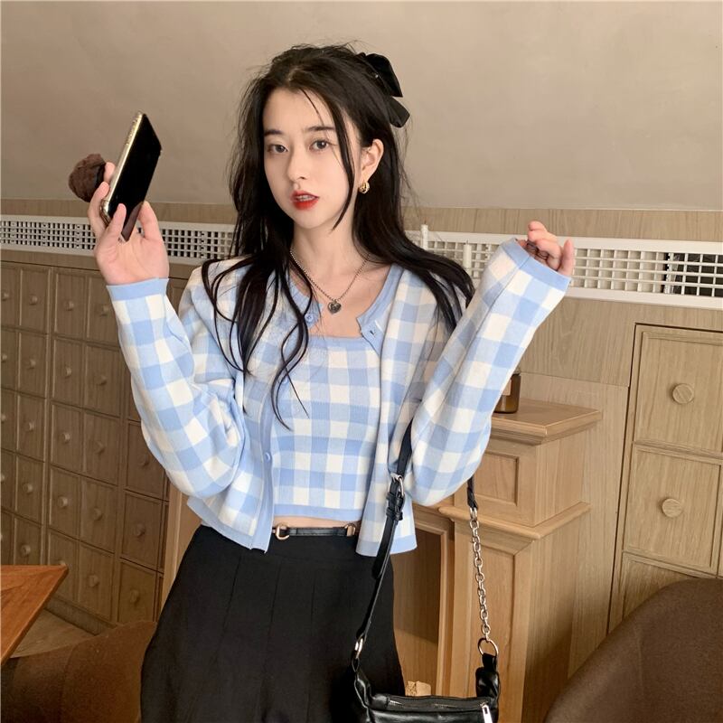 スタイルオータムスタンダードブルー格子柄パールカーディガンセット ロング レトロ 大人ガーリー スウィート キュート カジュアル 秋物 真珠 萌量不足9923155660