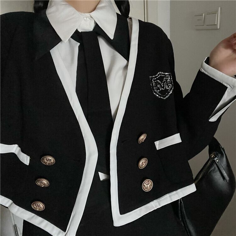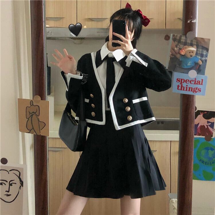 Vネックダブルブレストショートジャケット シャツ セット スプリングウェストプリーツスカート 春物 萌量不足24120612945