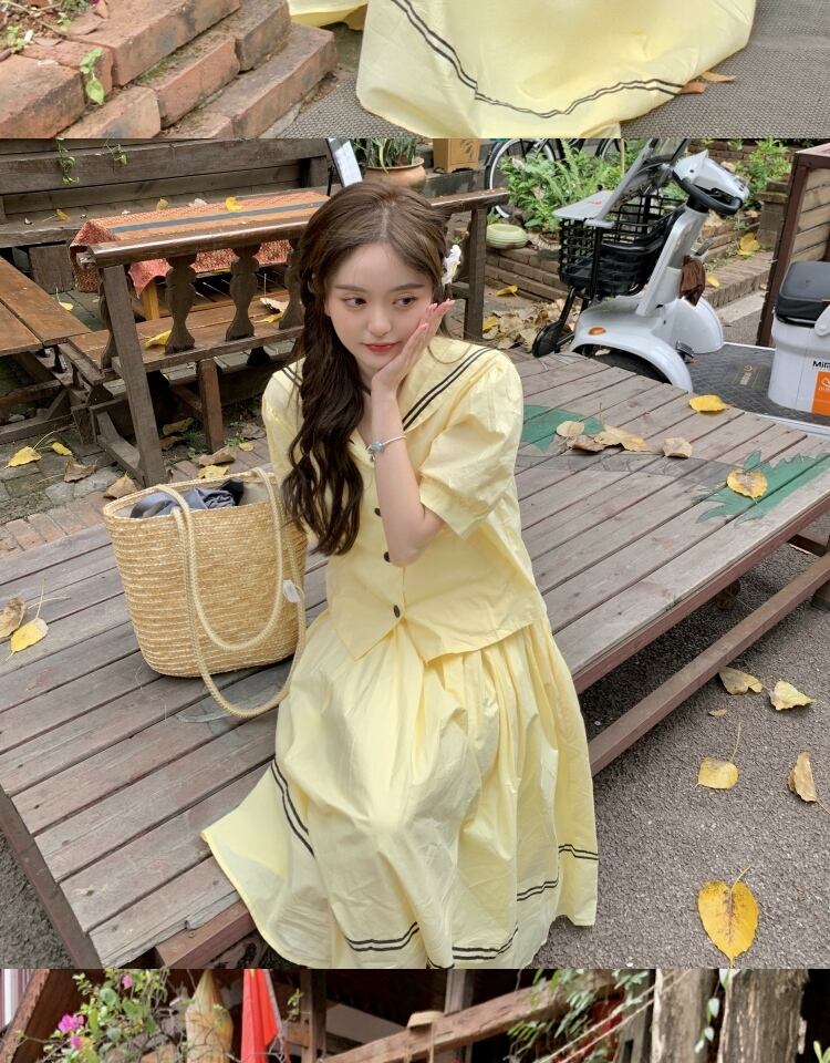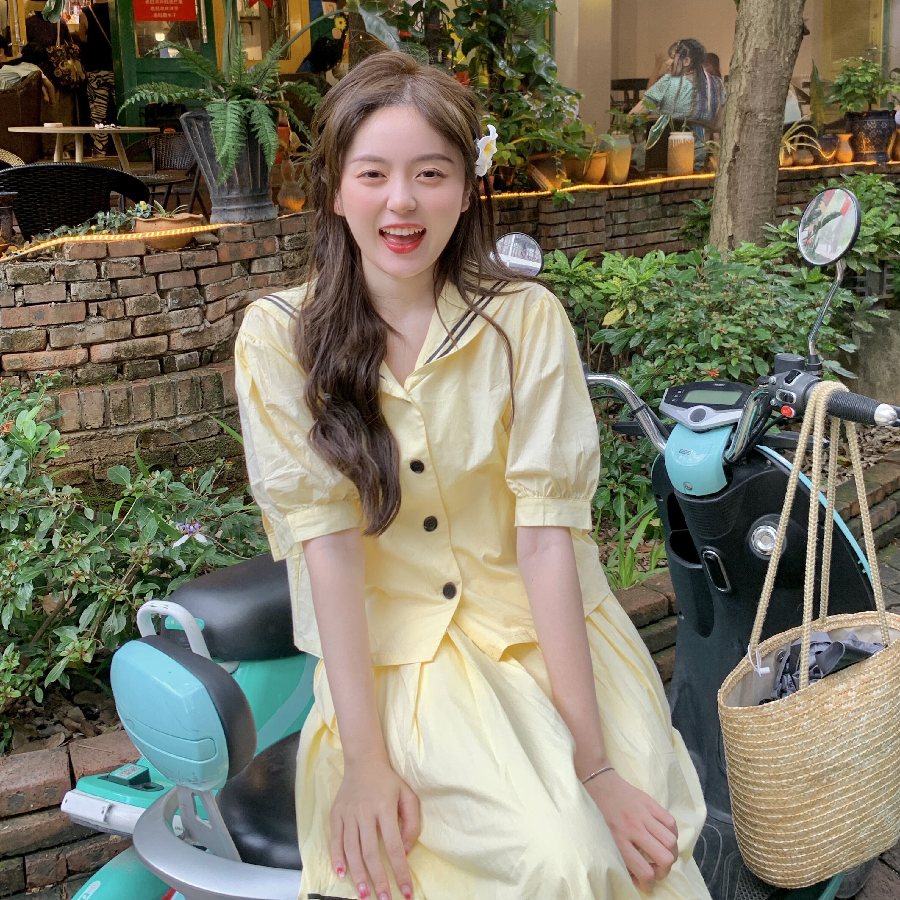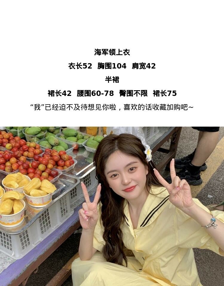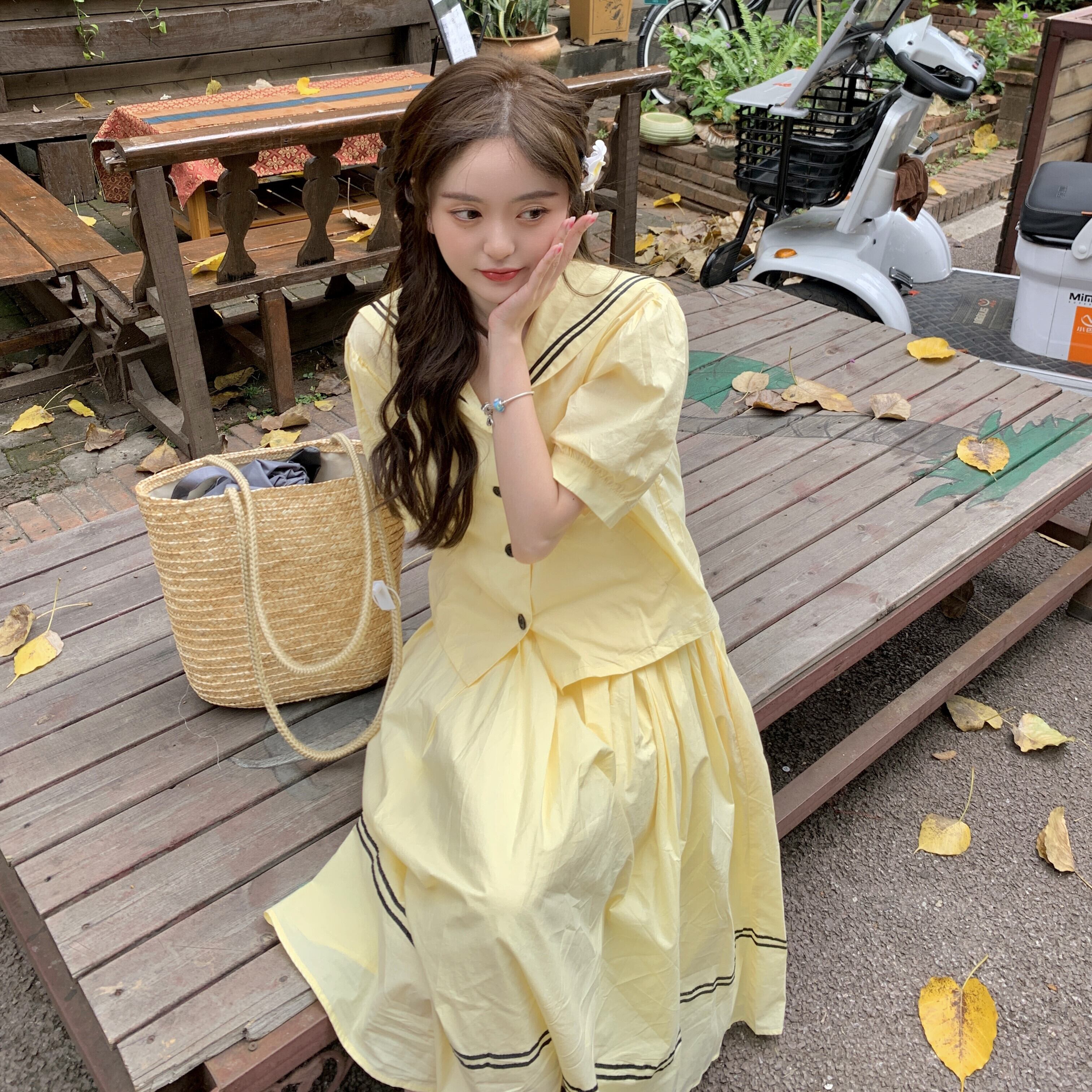 サマーネイビーカラースリーブシャツ トップス ハイウェストウェストスカート 夏物 萌量不足7297168769