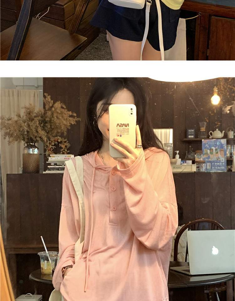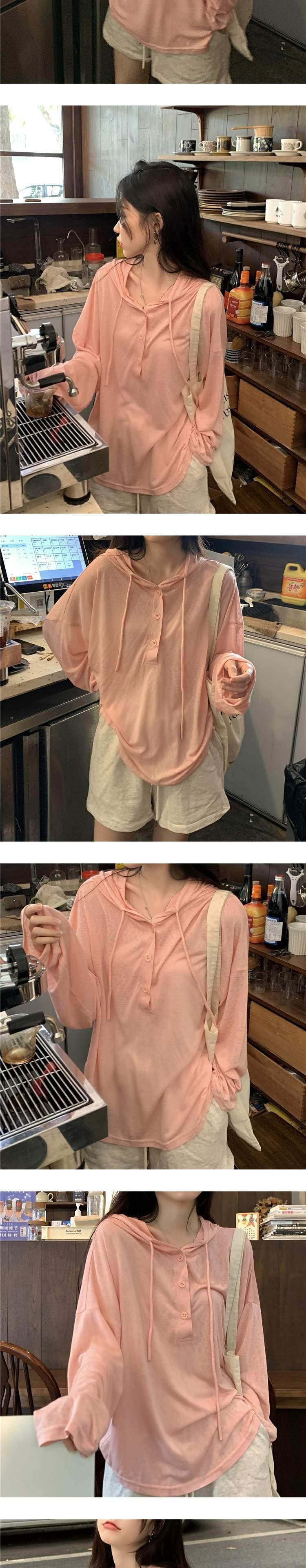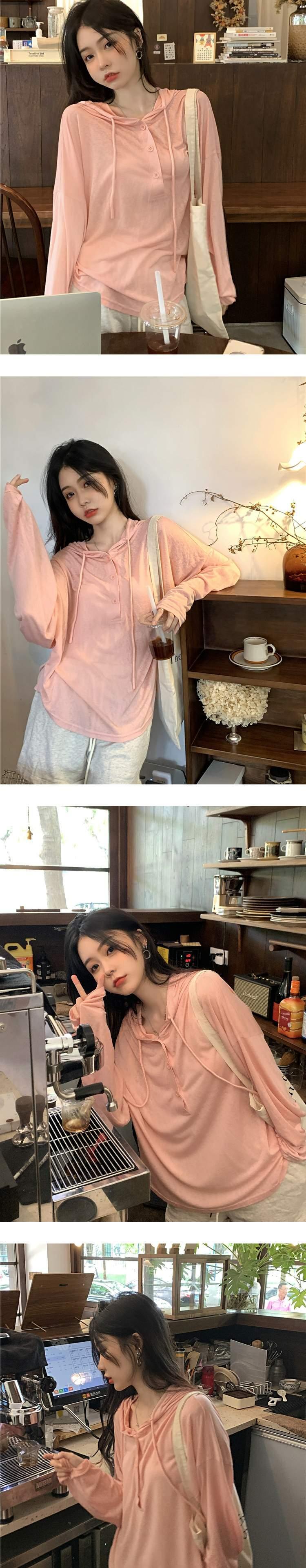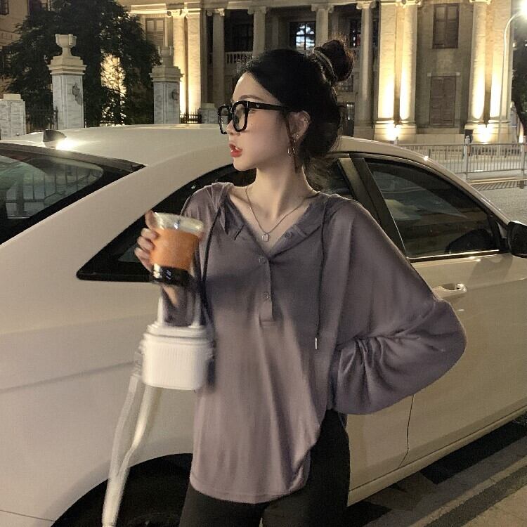 ルーズボタンフードTシャツ シャツ オータム薄手トップス ロング コットン 秋物 ピュア 萌量不足26060501031