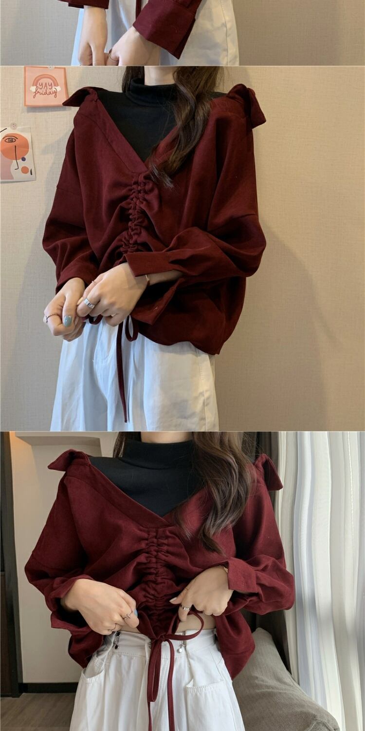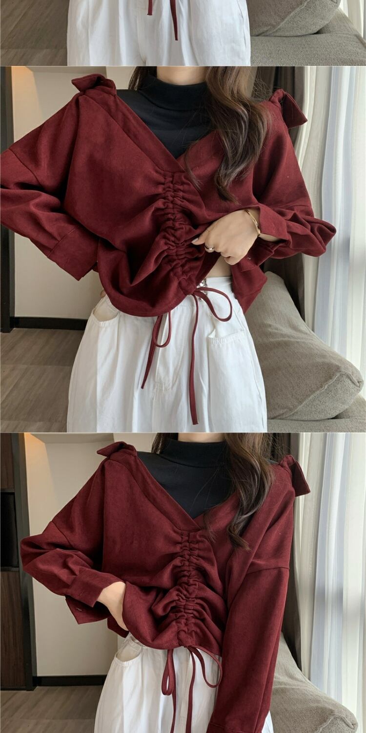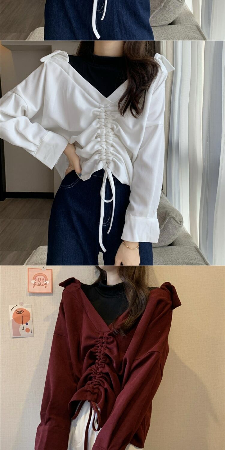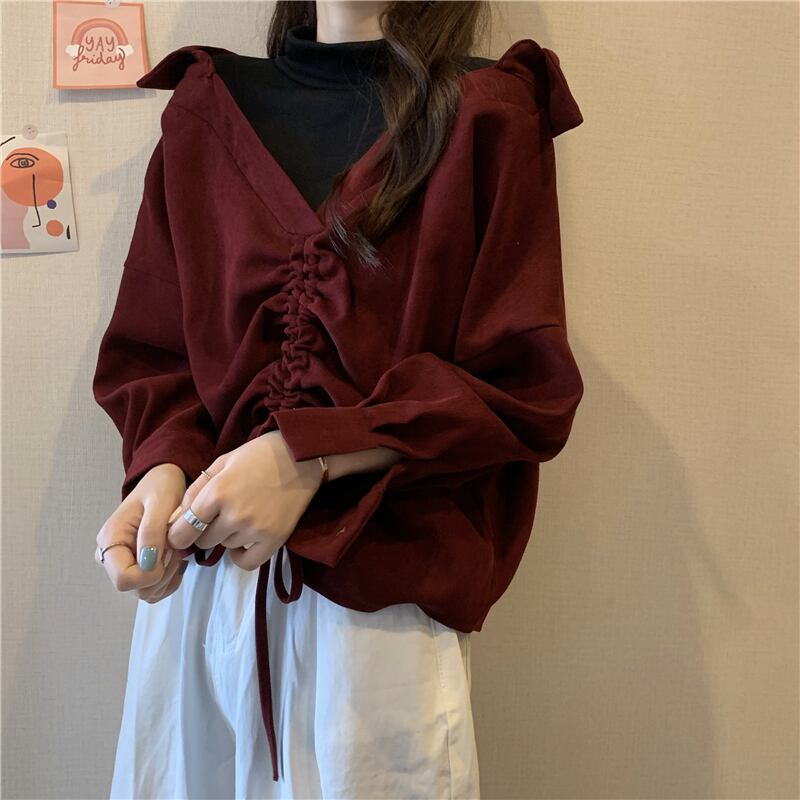 ギャザーセーター レディーススプリングVネックオータムトップス 春物 秋物 ステッチ 萌量不足55185871108