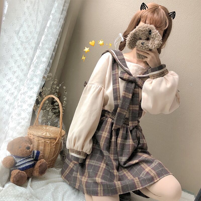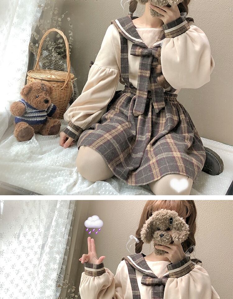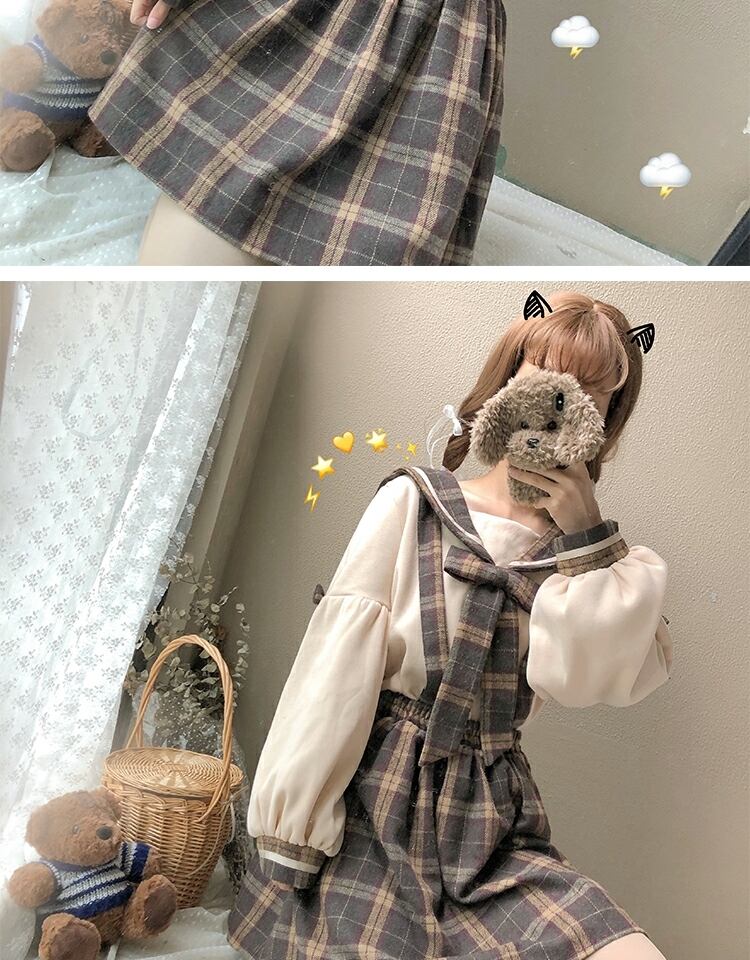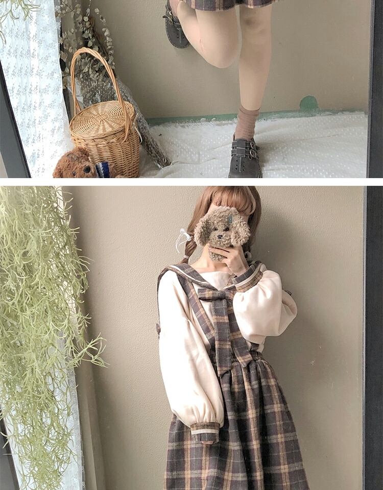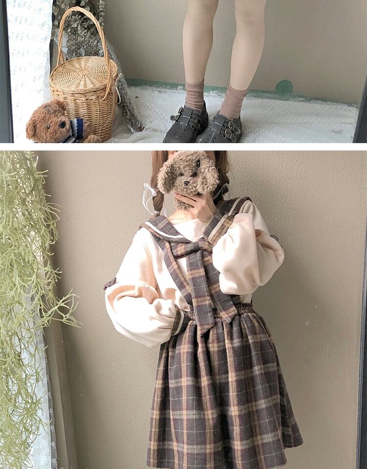 レディースオータムネイビーカラーセーター スタンダード格子柄スカート リボン レトロ 秋物 萌量不足24261763102