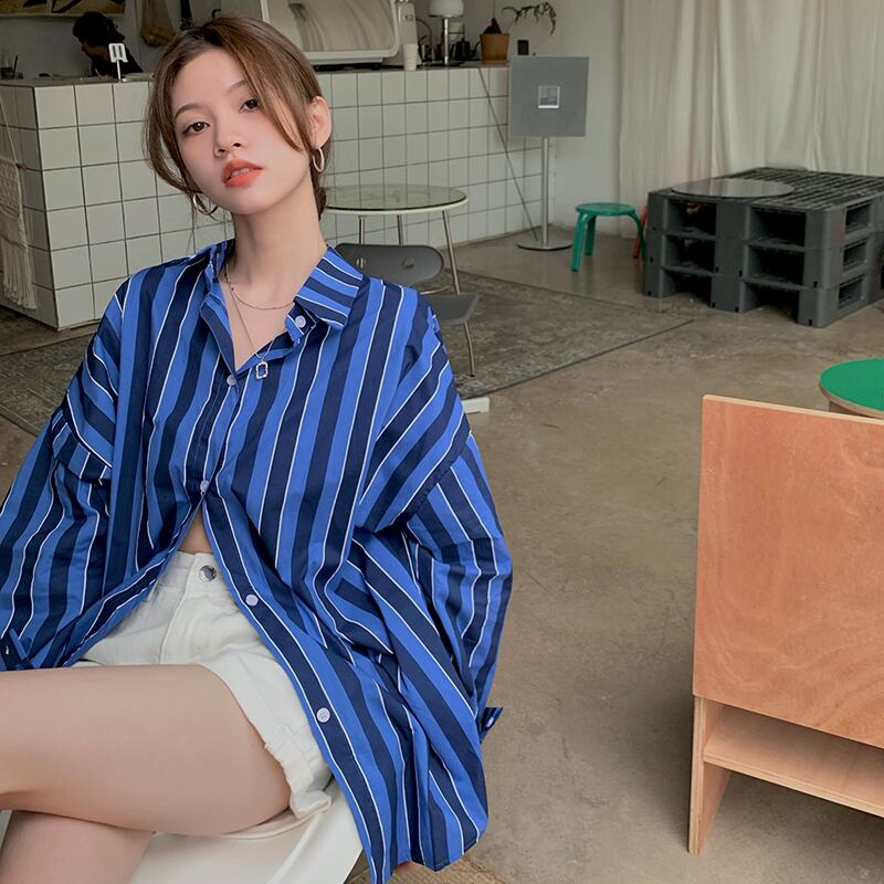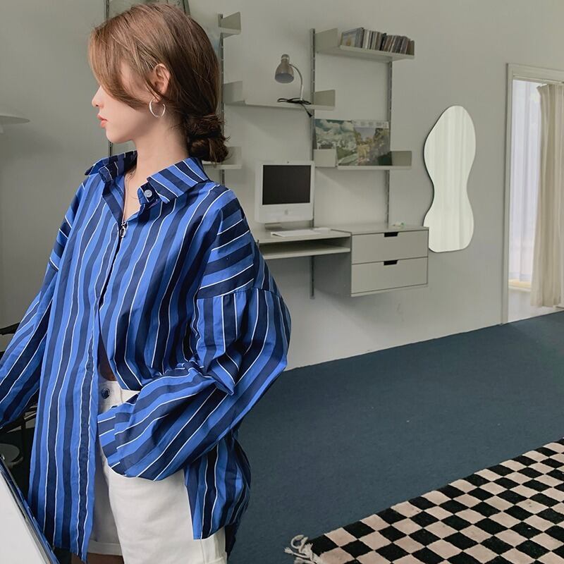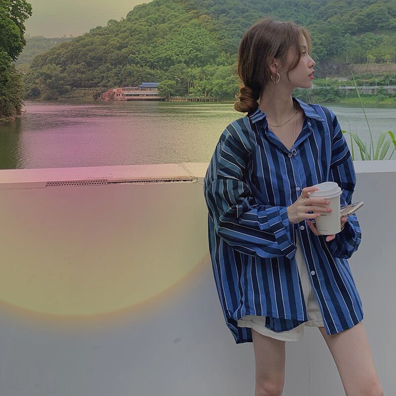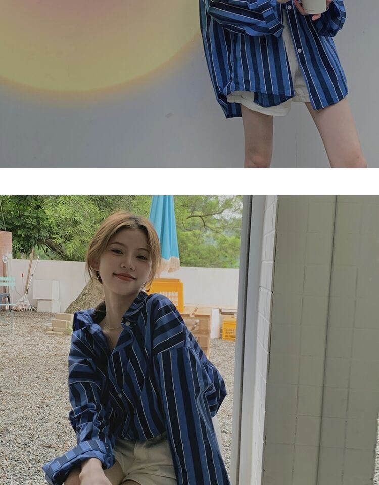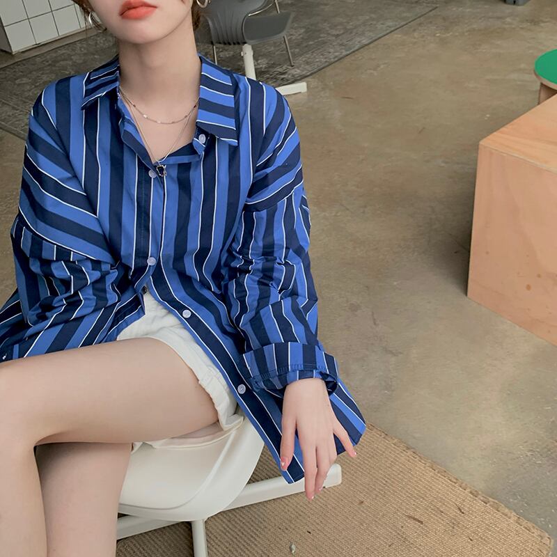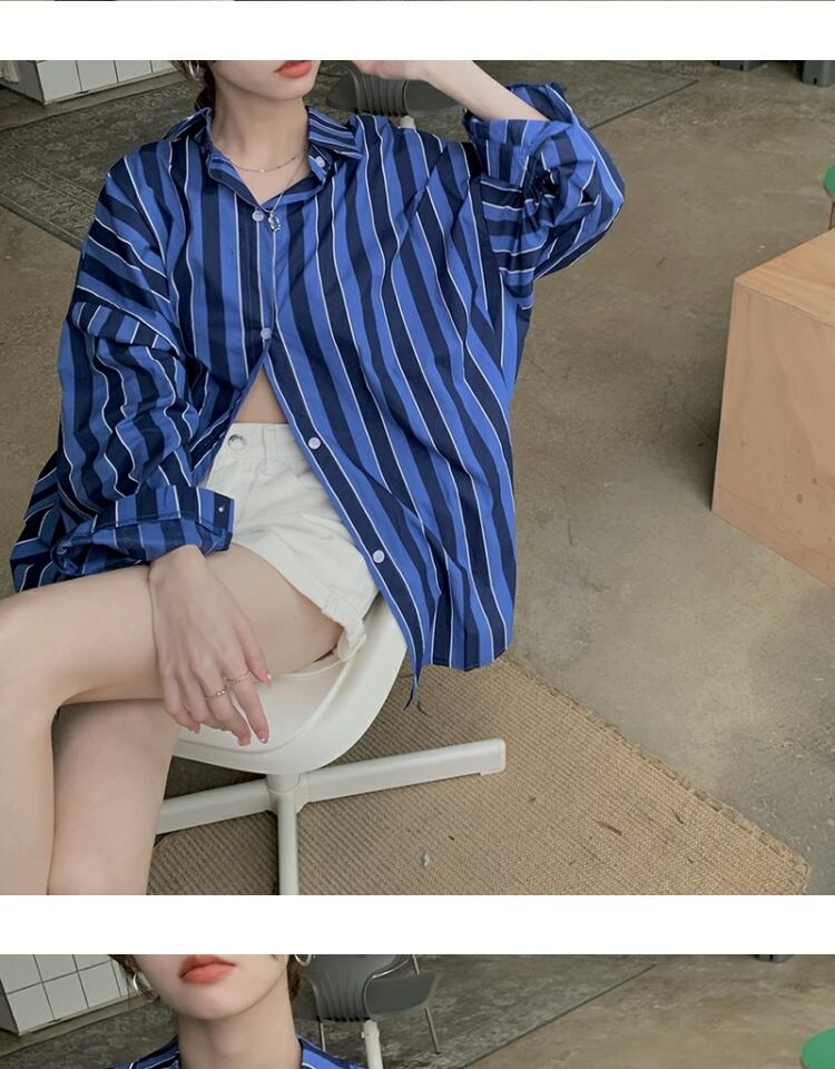 スタンダードルーズダークブルーストライプシャツ オータムジャケット トップス レトロ 秋物 萌量不足80809736011