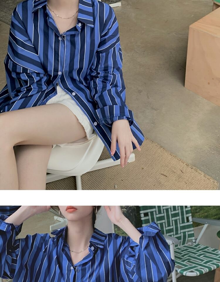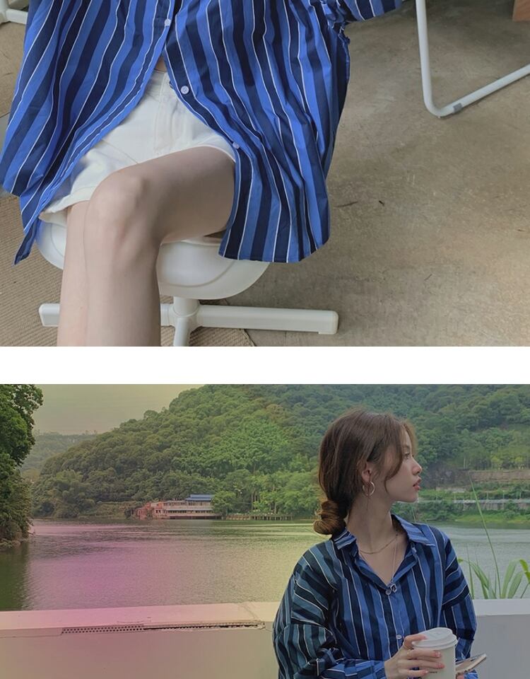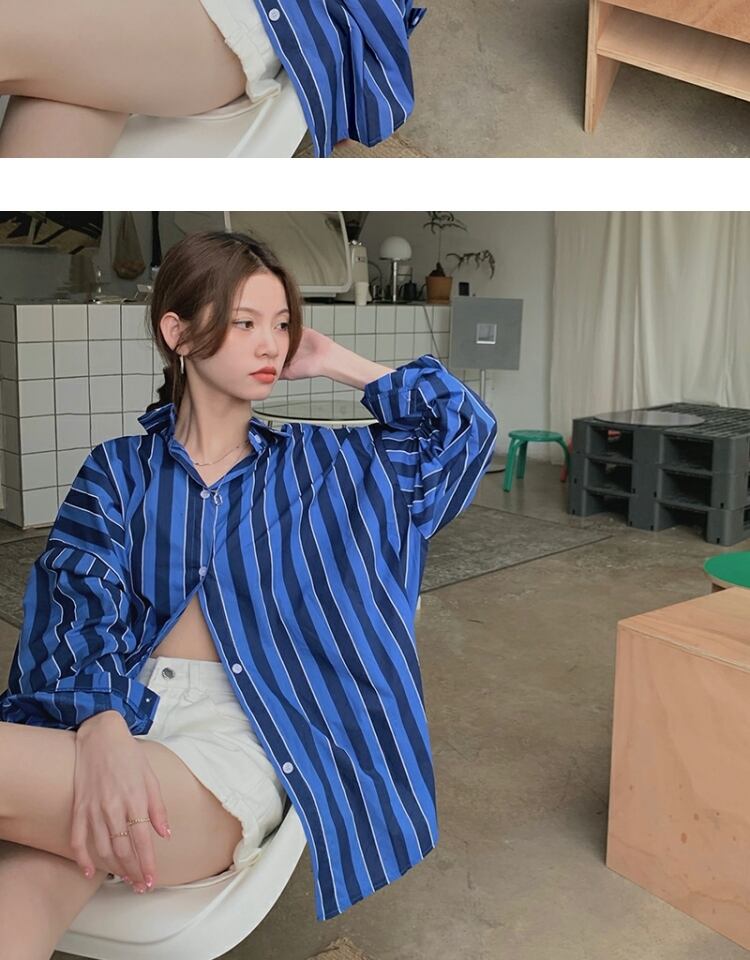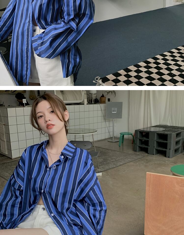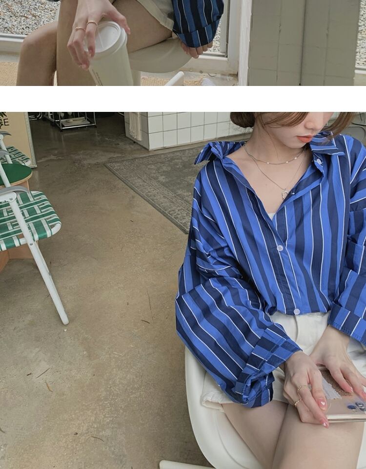 スタンダードルーズダークブルーストライプシャツ オータムジャケット トップス レトロ 秋物 萌量不足80809736011