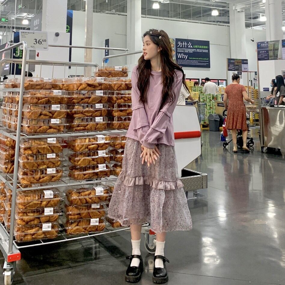 スタイルバックセーター オータムフローラルスカート ロング 秋物 花柄 パープル 萌量不足89731500379