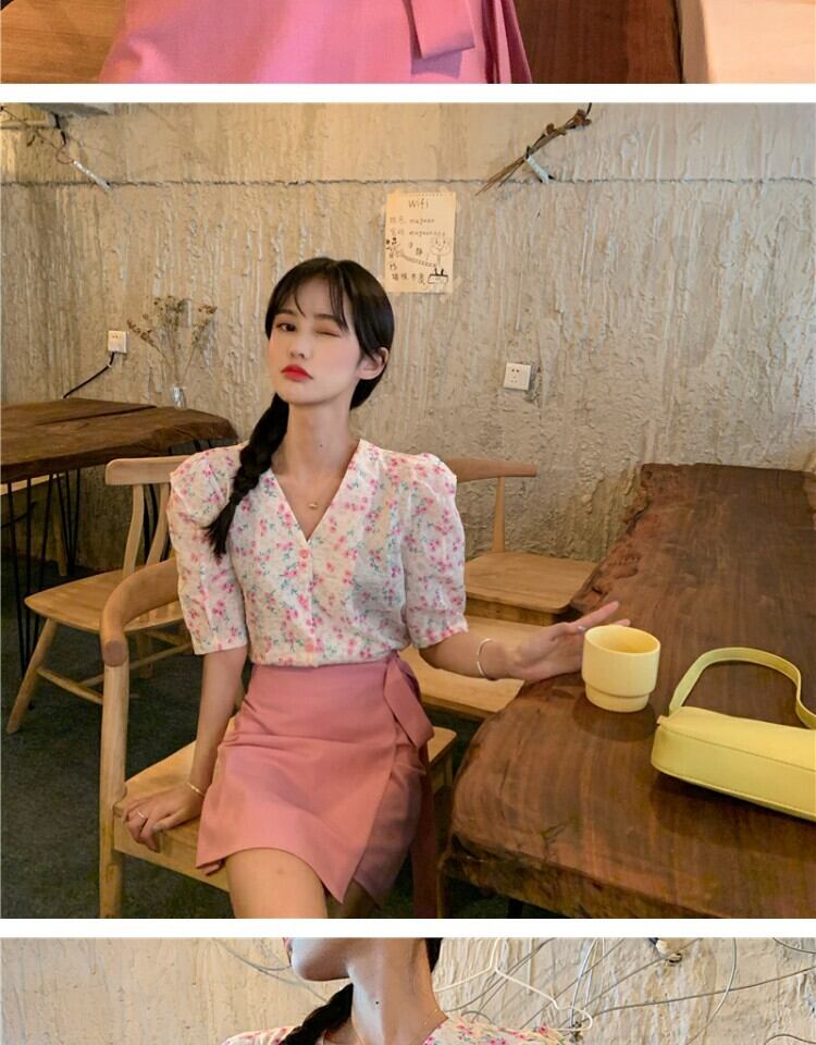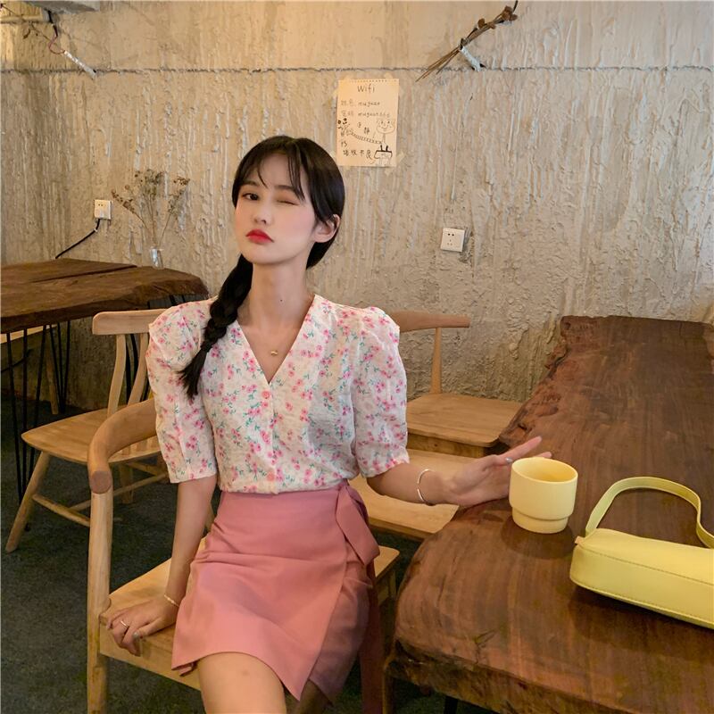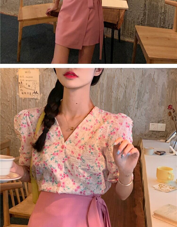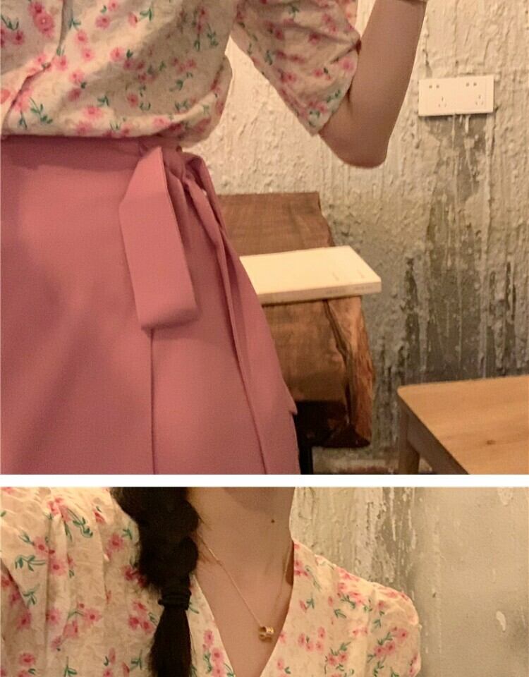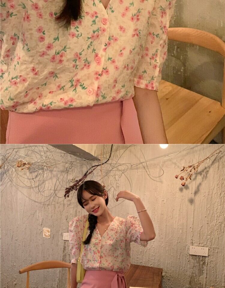 フローラルVネックスリーブシャツ レディースサマースタイルブラウス 夏物 花柄 萌量不足74427067192