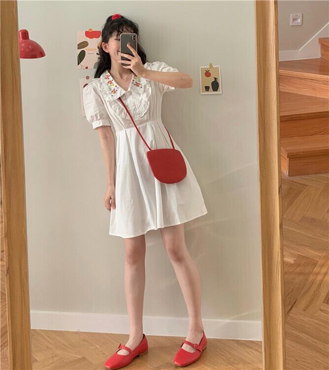 ドレス サマー薄手ウェスト刺繍ホワイトスカート スリーブAライン 大人ガーリー スウィート キュート カジュアル 夏物 萌量不足69383090196