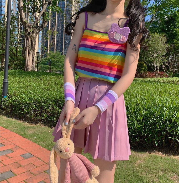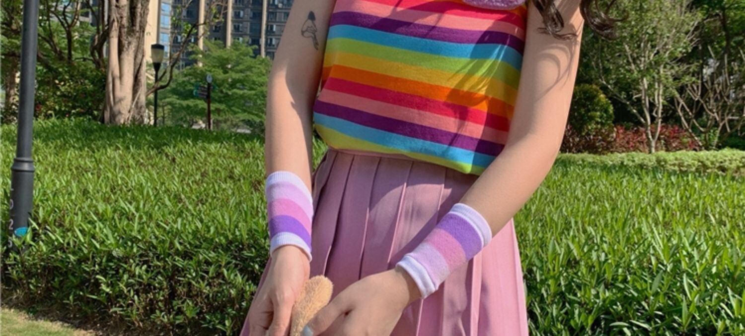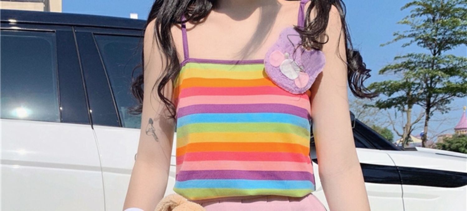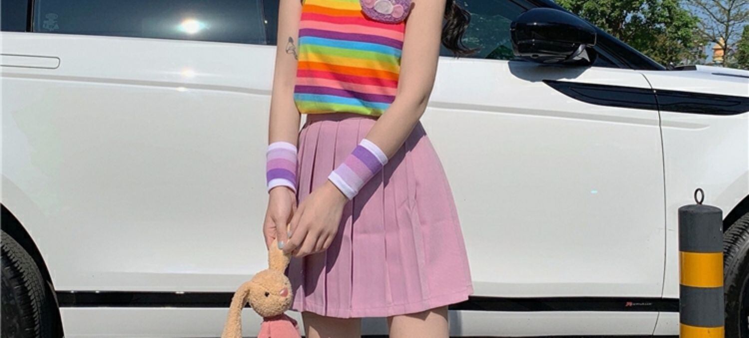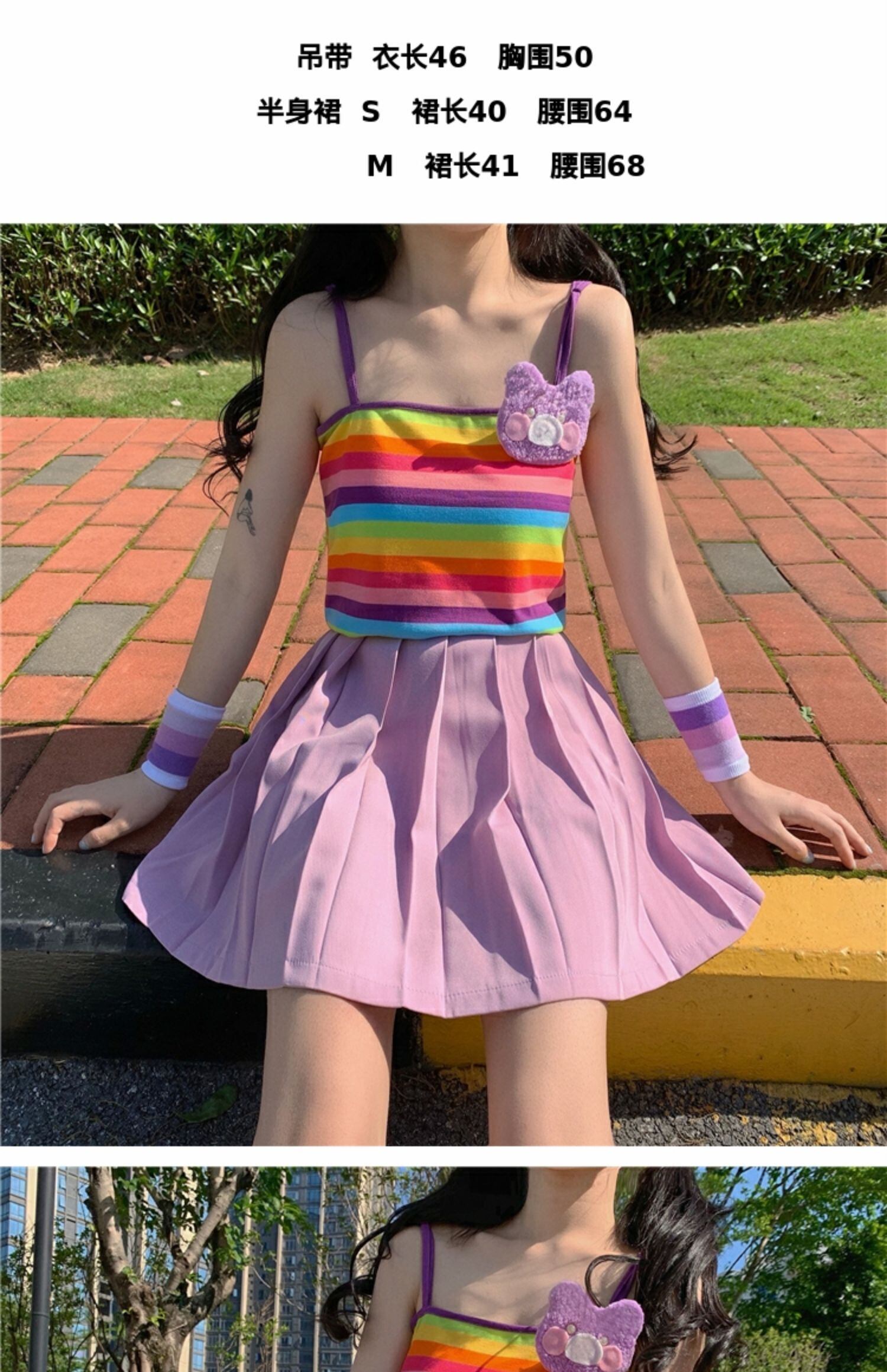 色:レインボーストリップスリング(ワンピース),紫のスカート(シングルピース)