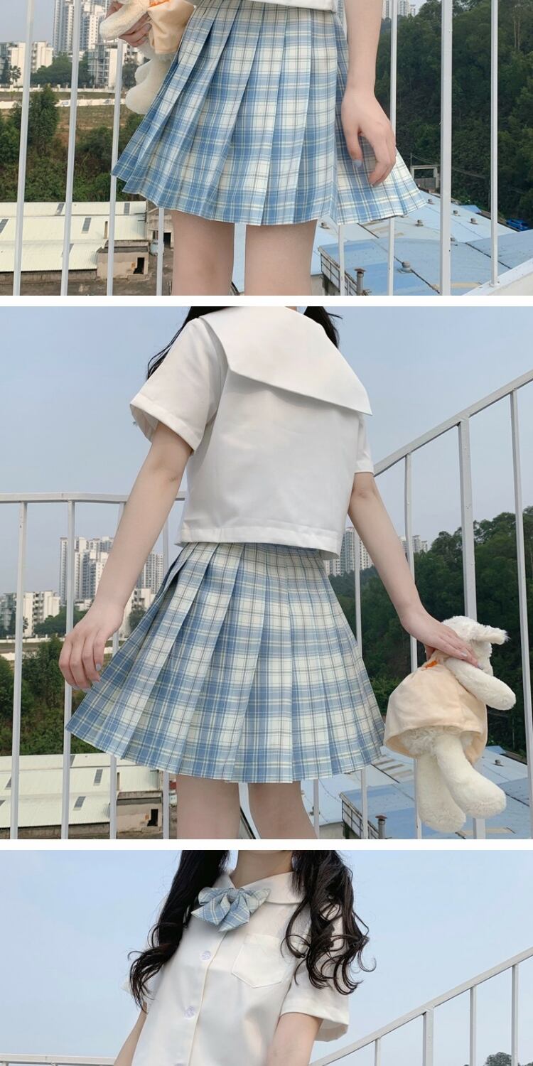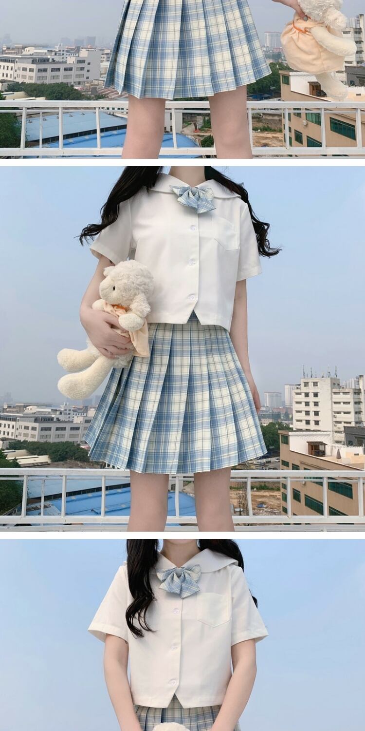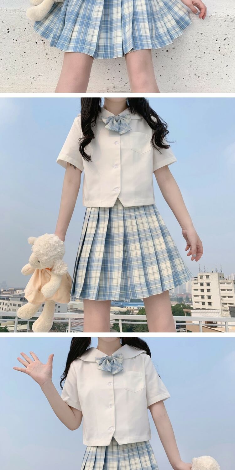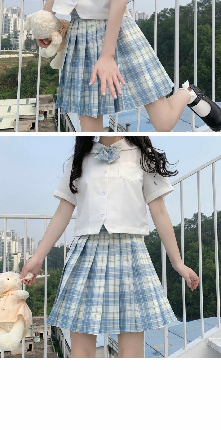 色:チェック柄スカート(シングルピース),蝶ネクタイ付きネイビーシャツ(ワンピース)