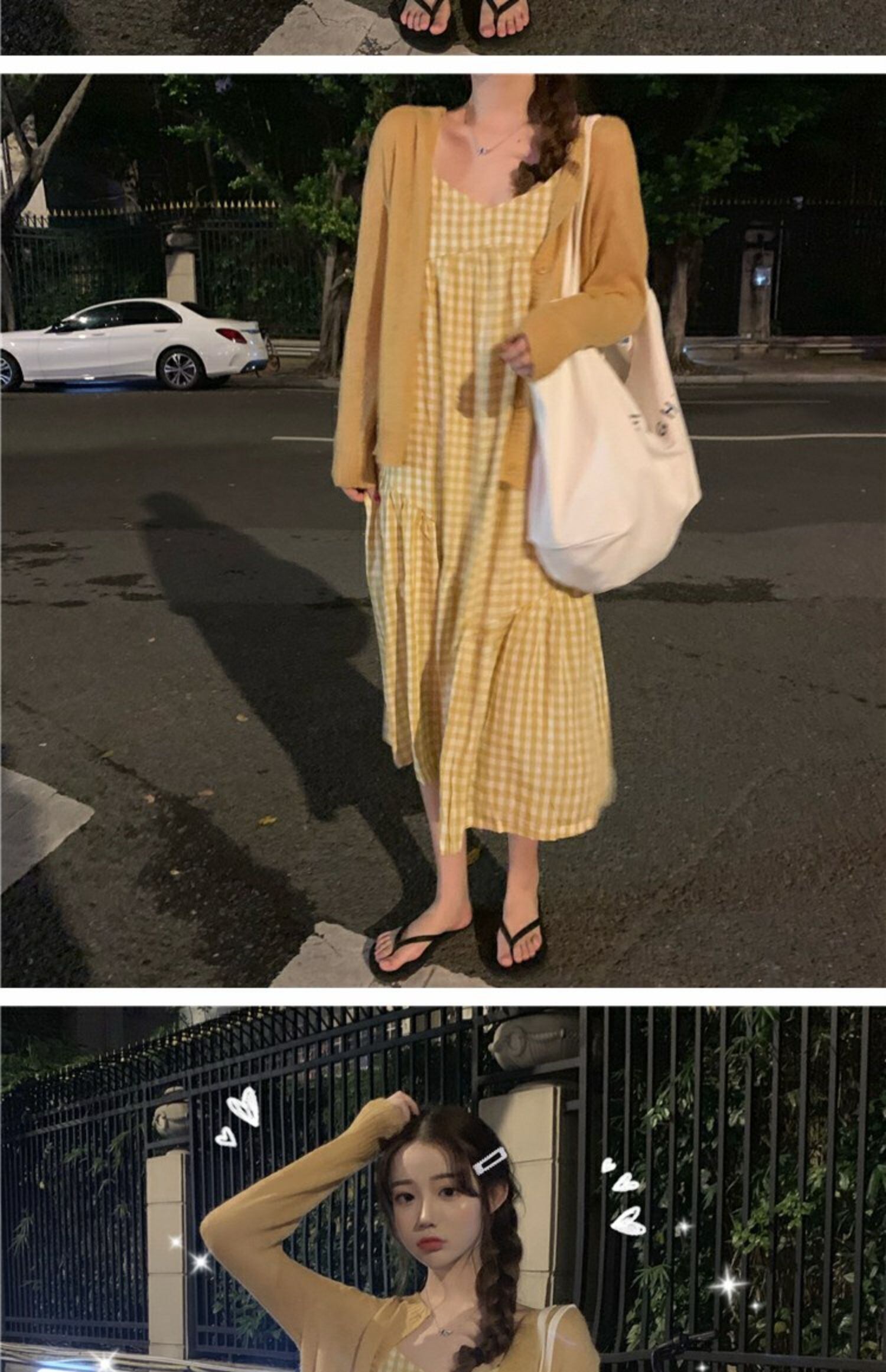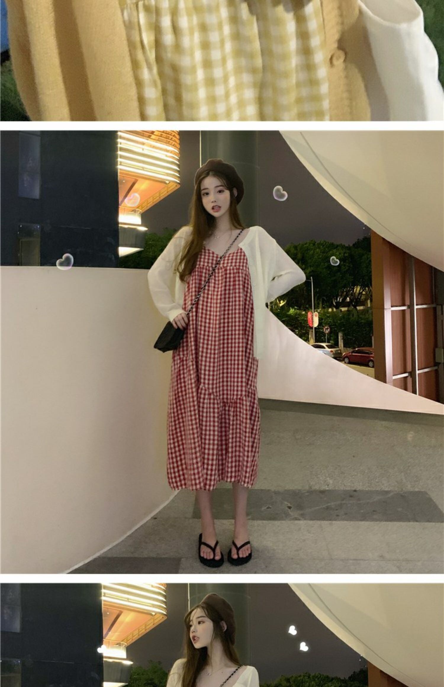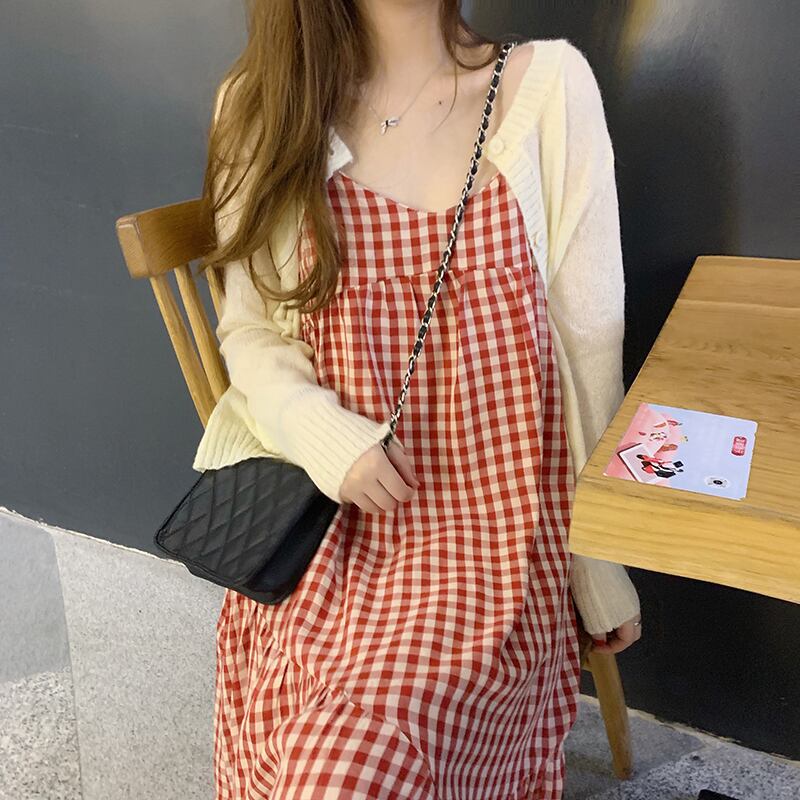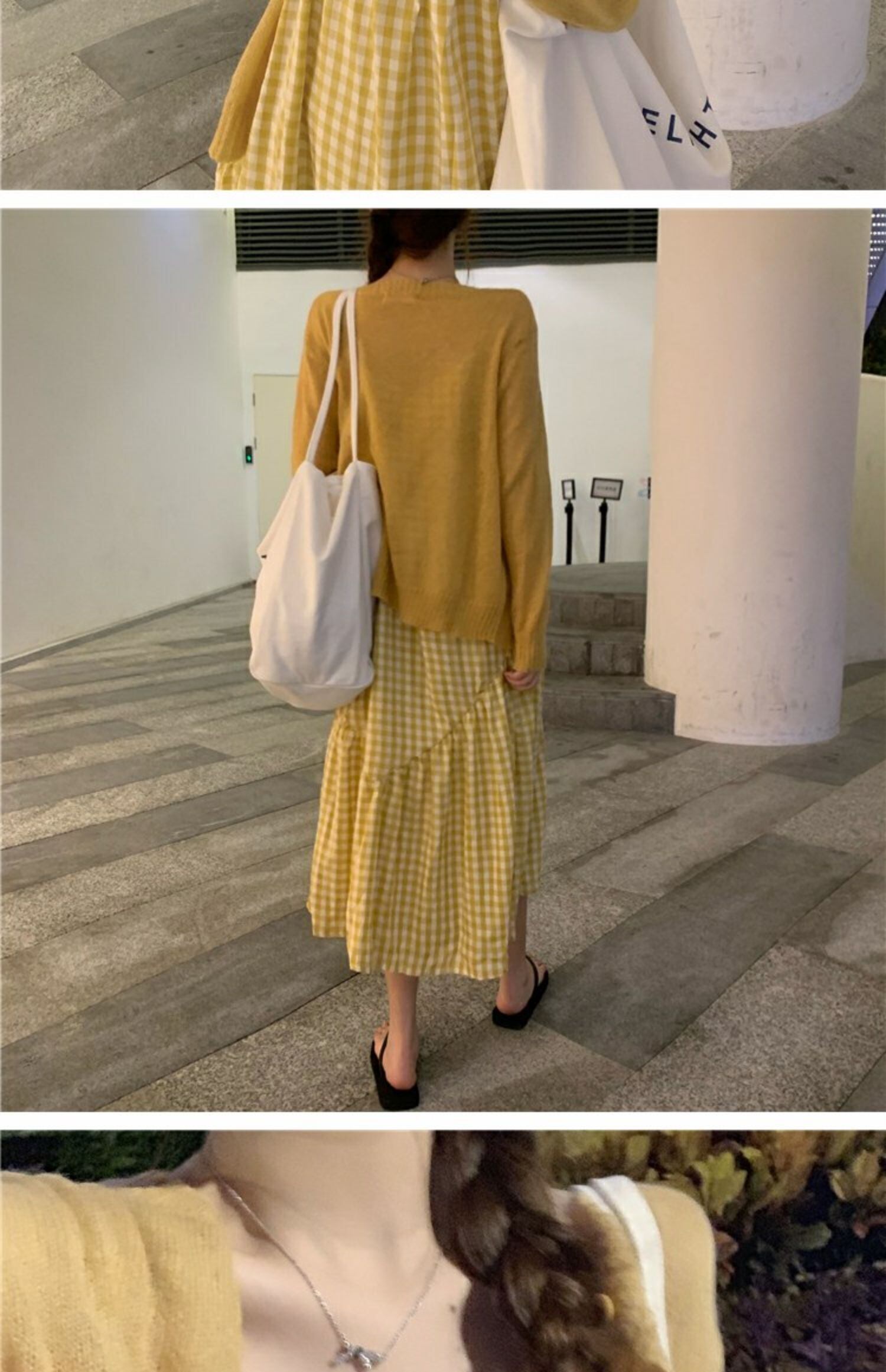 色:黄色いセーター(シングルピース),ベージュニットセーター(シングルピース),レッドグリッドドレス(シングルピース),Huanggeサスペンダースカート(シングルピース)