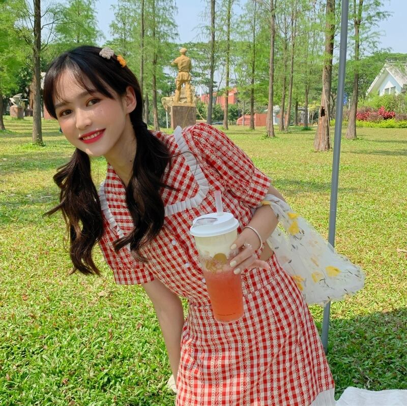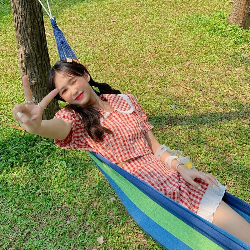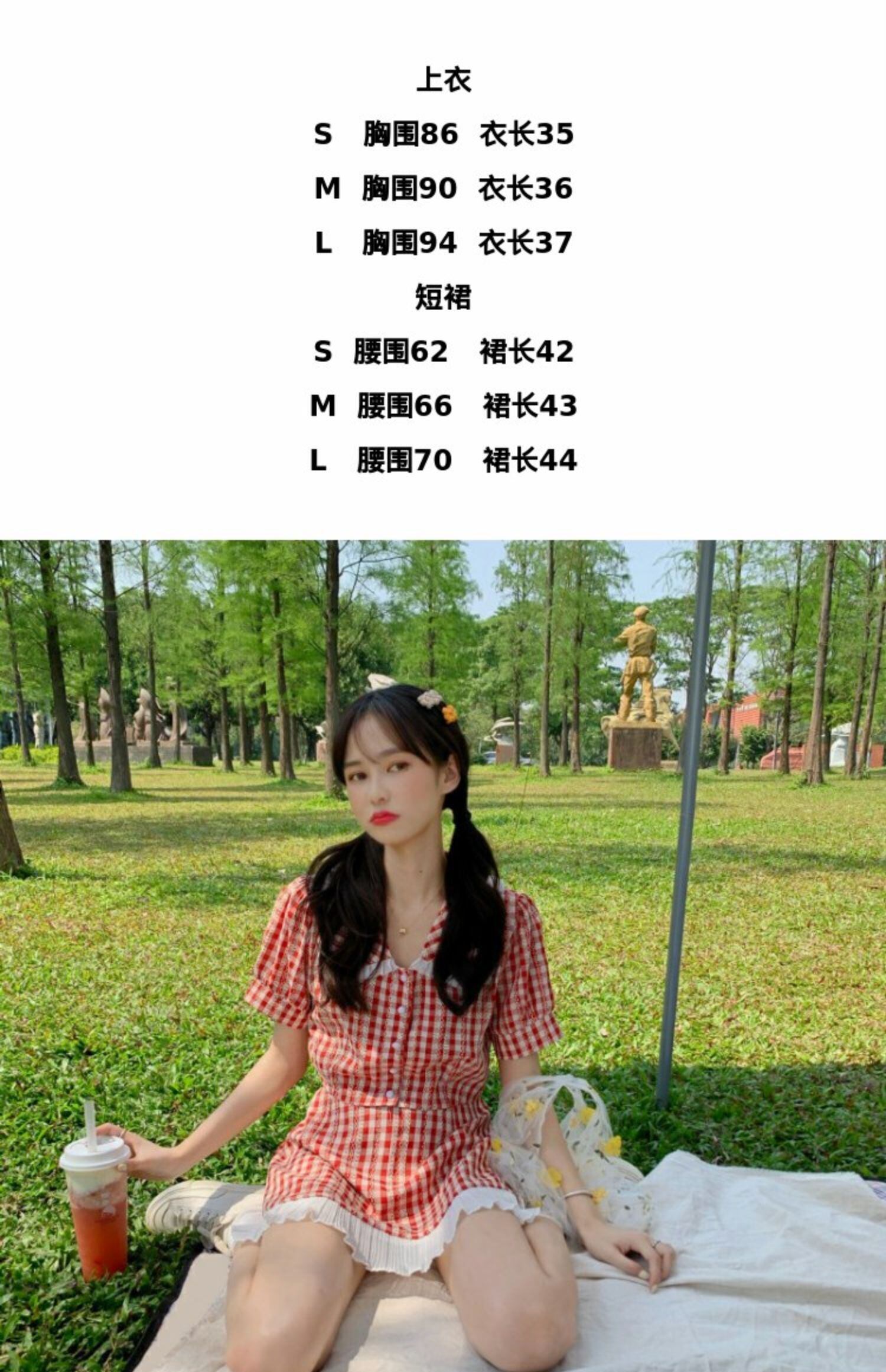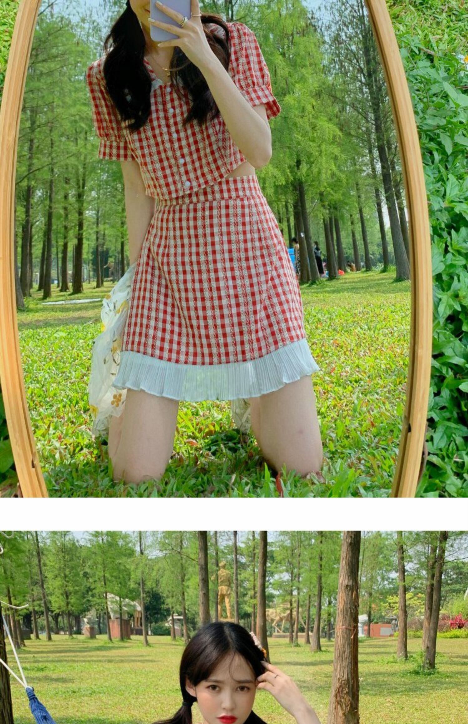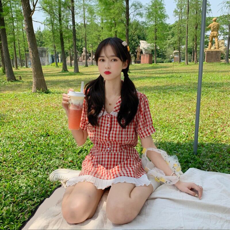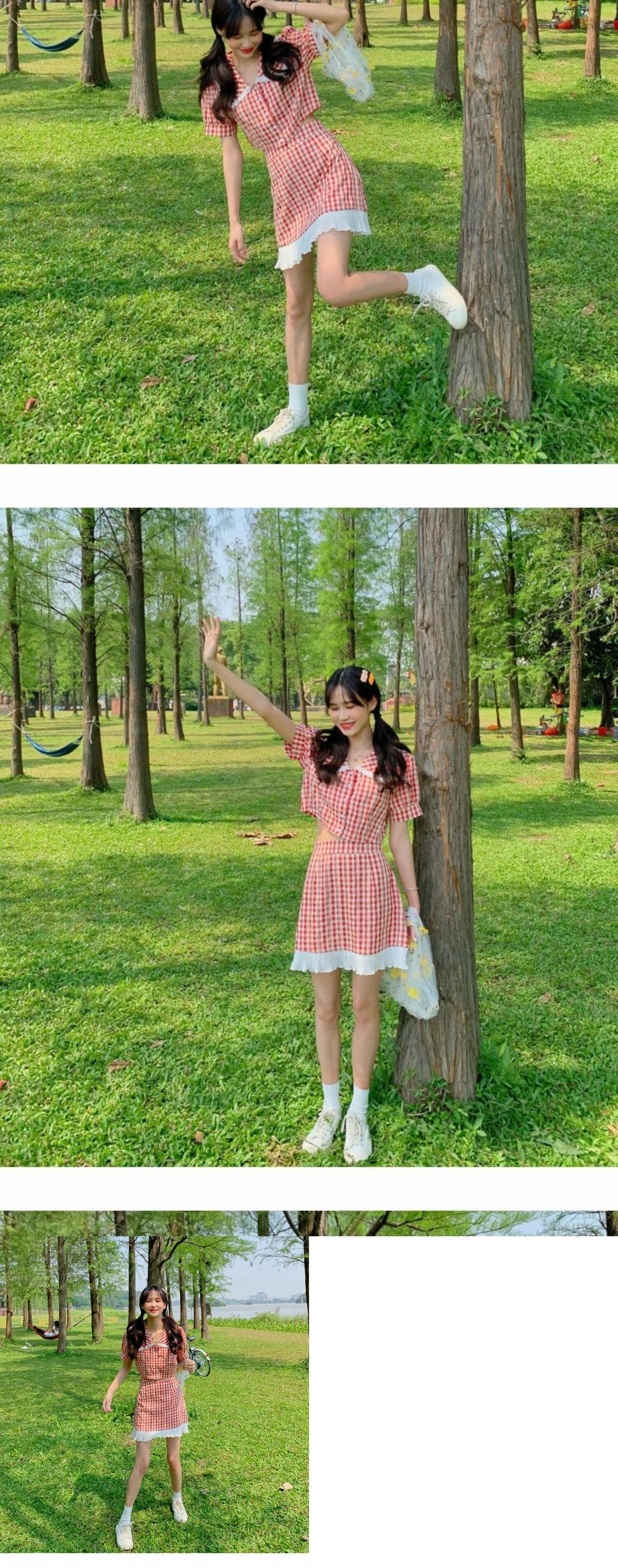 サマースタイルカラー格子柄トップス レースハイウェストウェストショートスカート 夏物 萌量不足61118363385