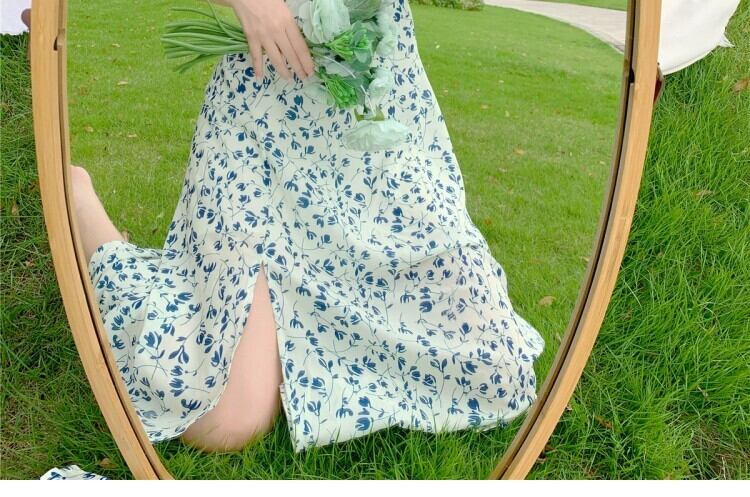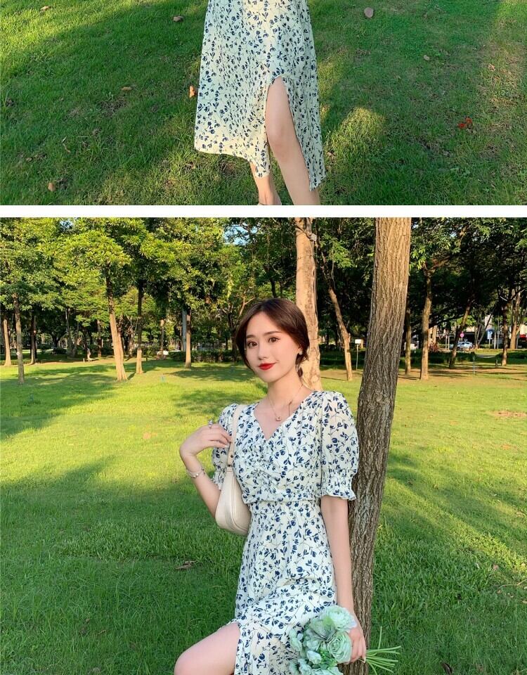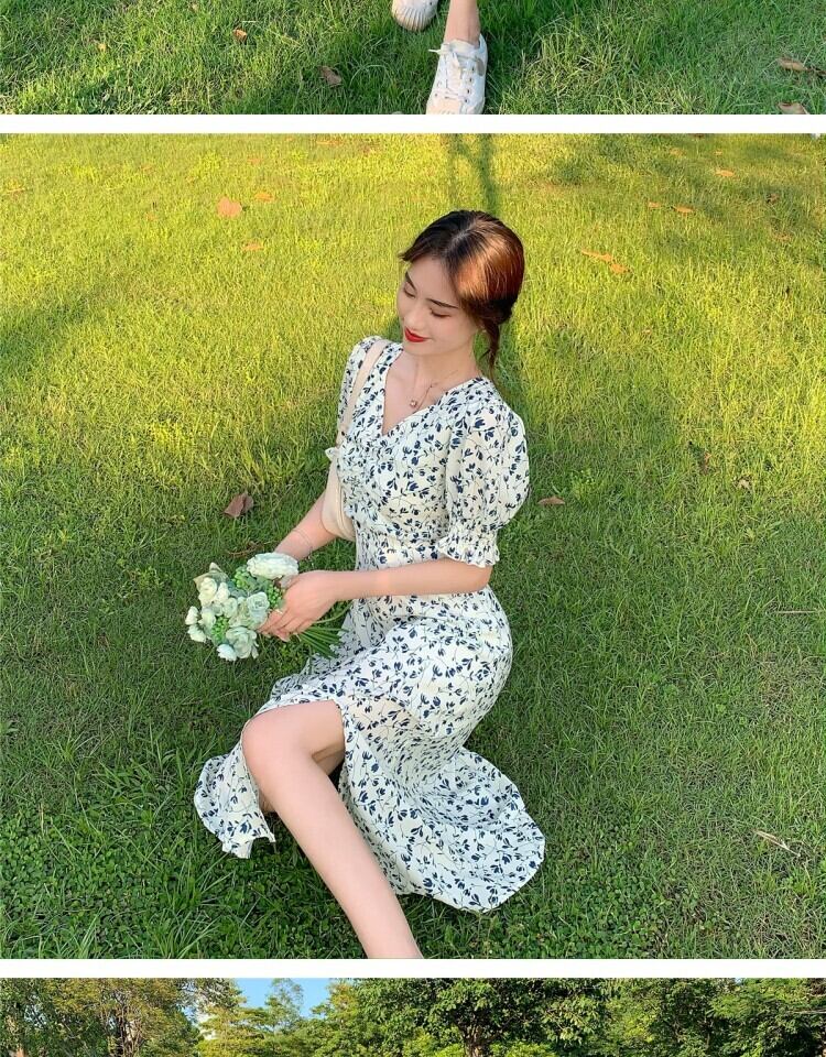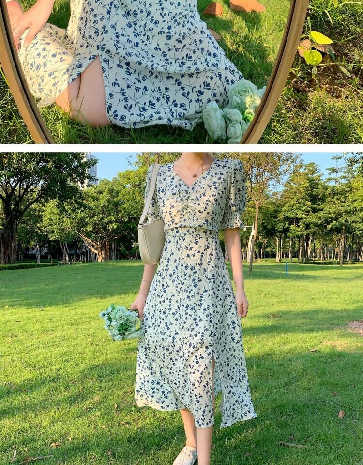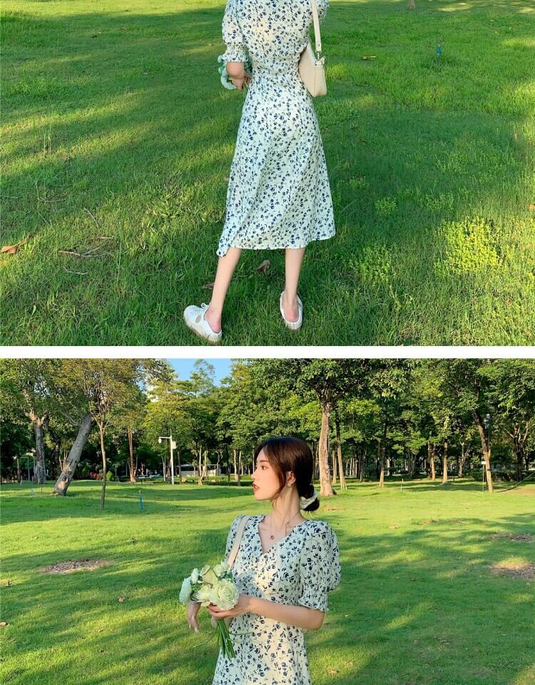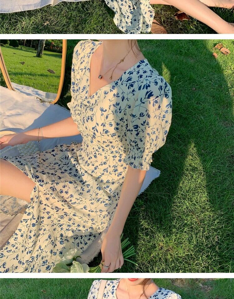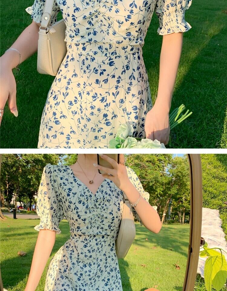 スタンダードシフォンウェストフローラルドレス サマーVネックスリーブ薄手スカート レトロ 大人ガーリー スウィート キュート カジュアル 夏物 花柄 萌量不足43826303578