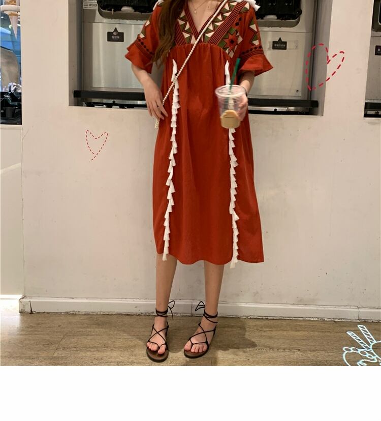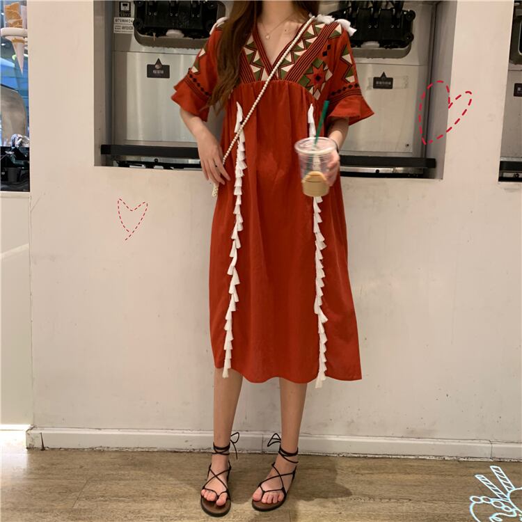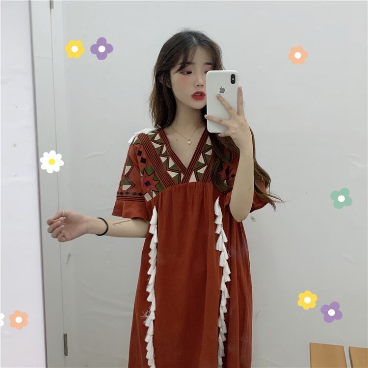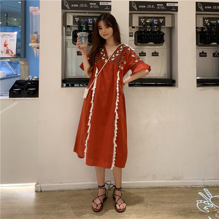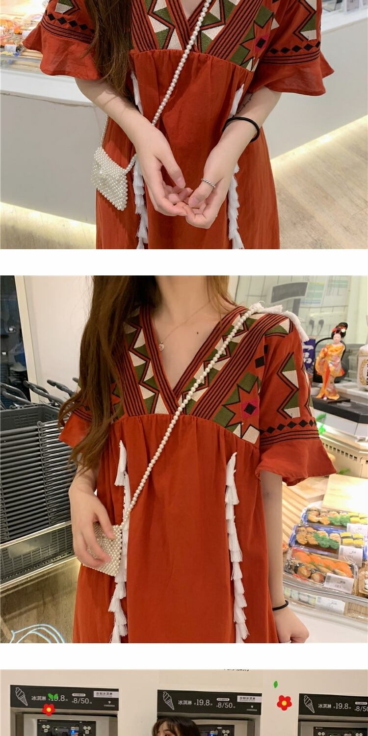 サマースタイルスタンダードVネックスカート 刺繍エスニックルーズドレス レディース レトロ 夏物 萌量不足61292596602