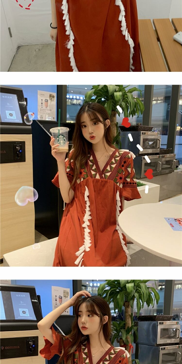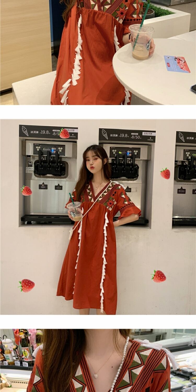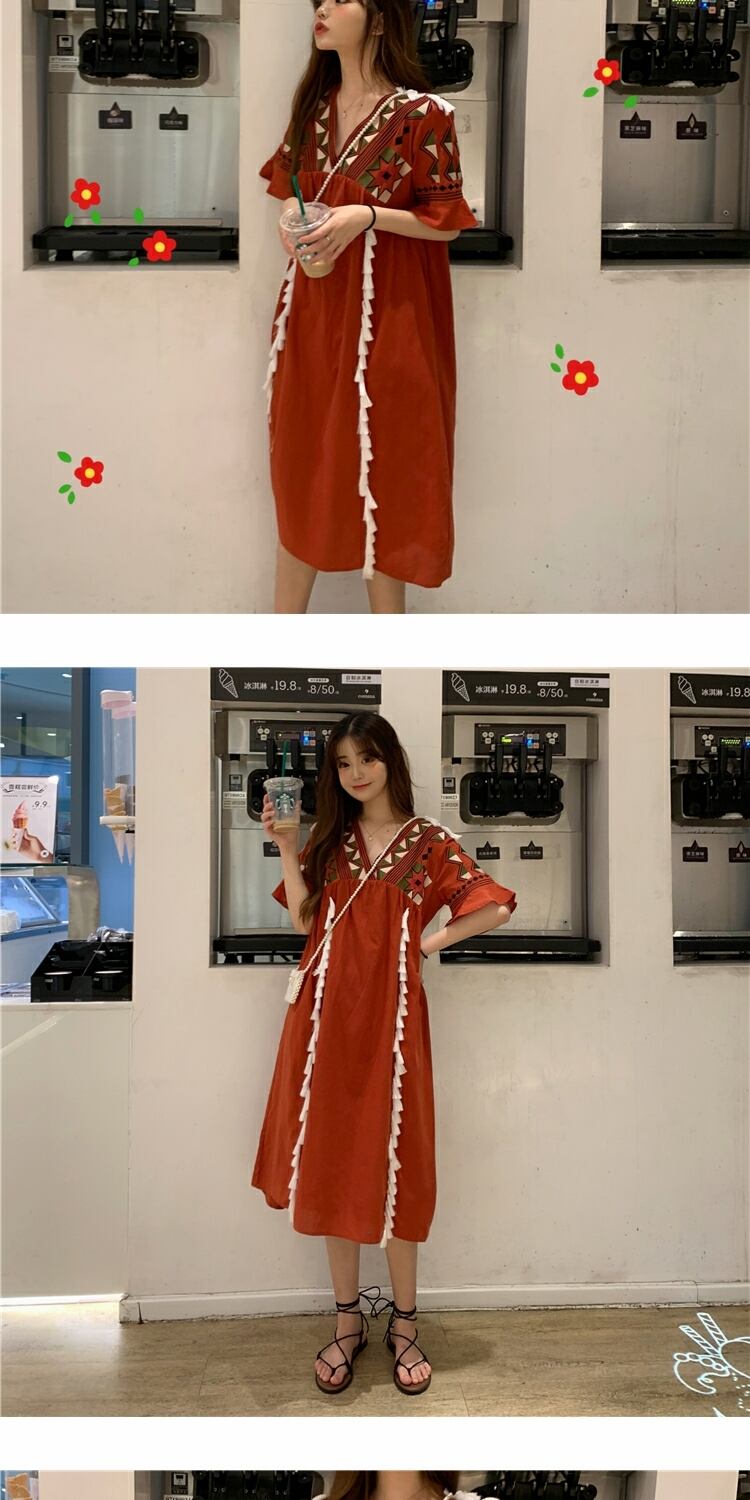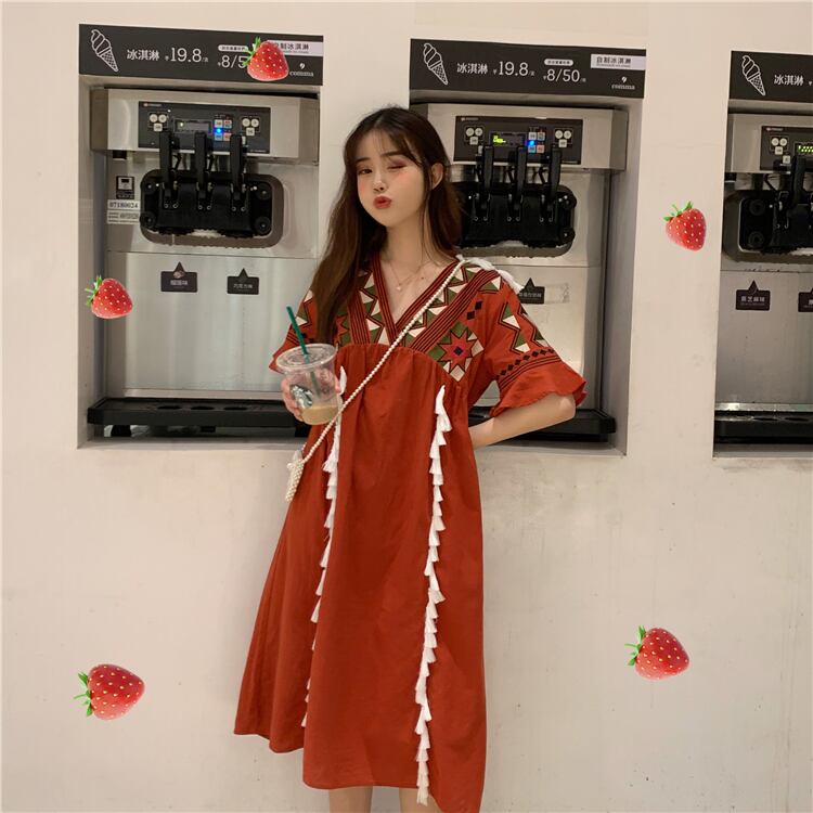 サマースタイルスタンダードVネックスカート 刺繍エスニックルーズドレス レディース レトロ 夏物 萌量不足61292596602