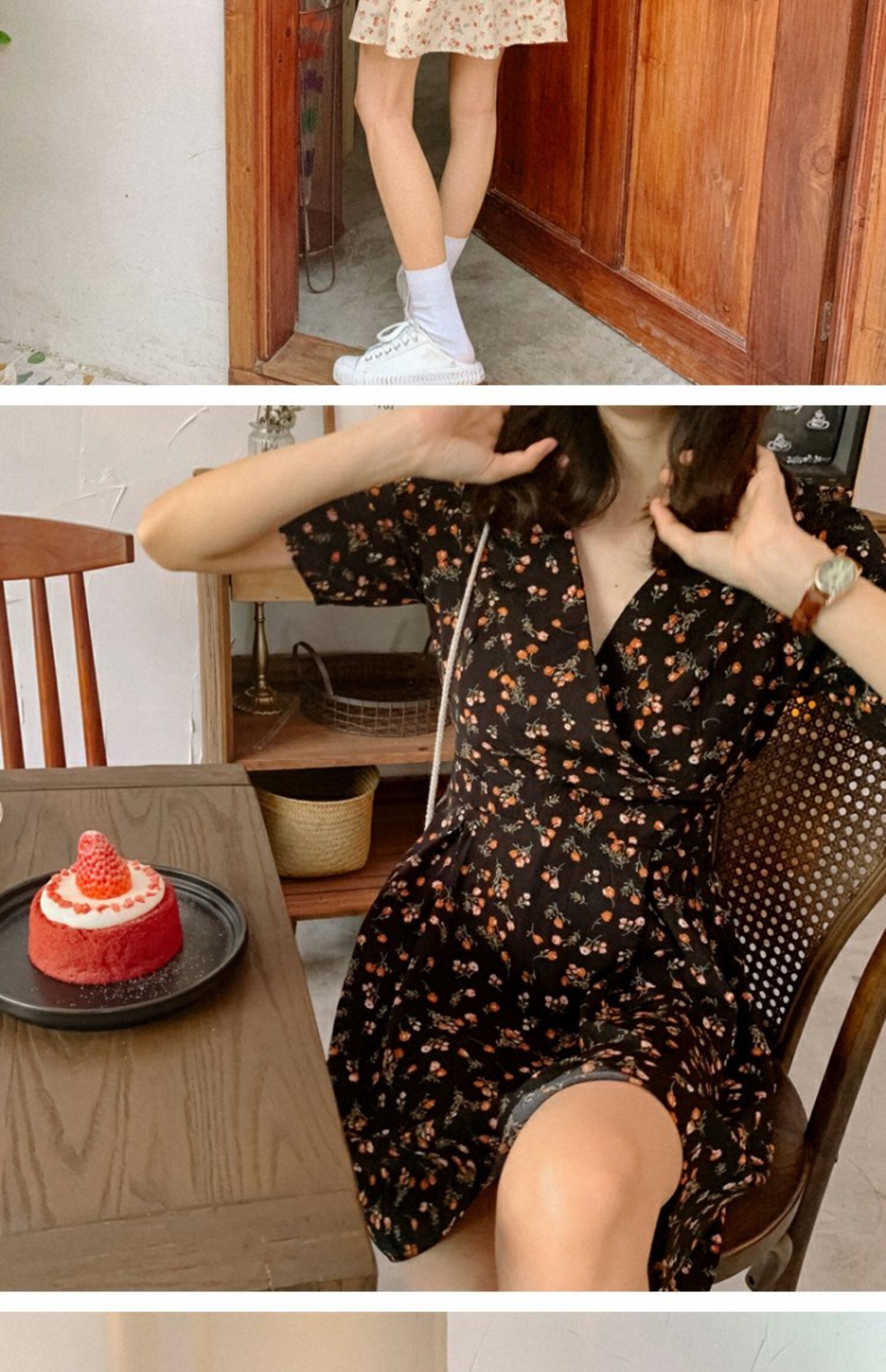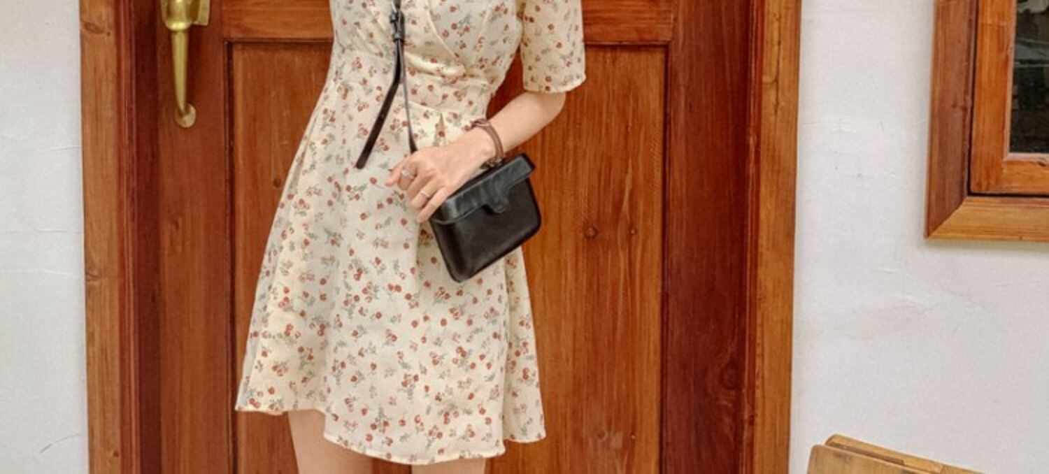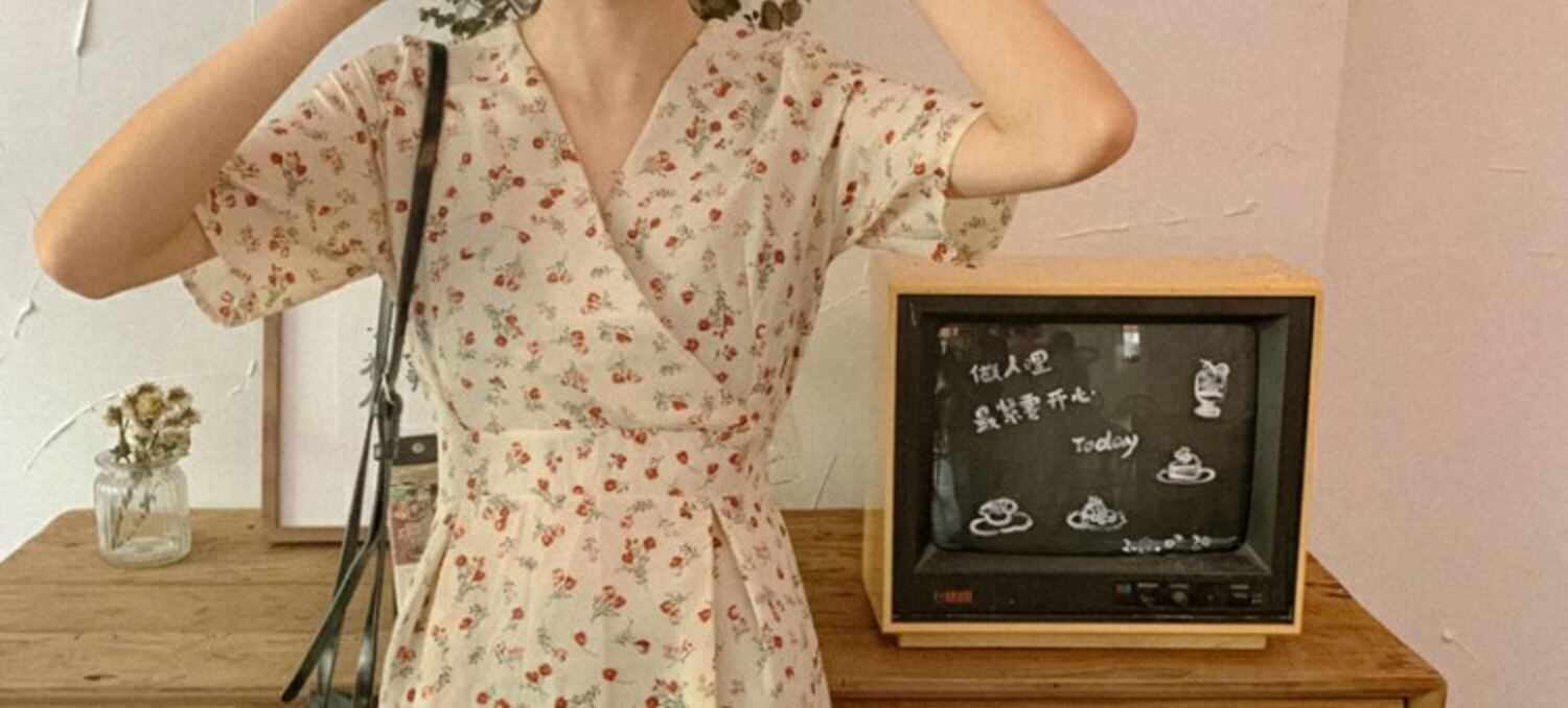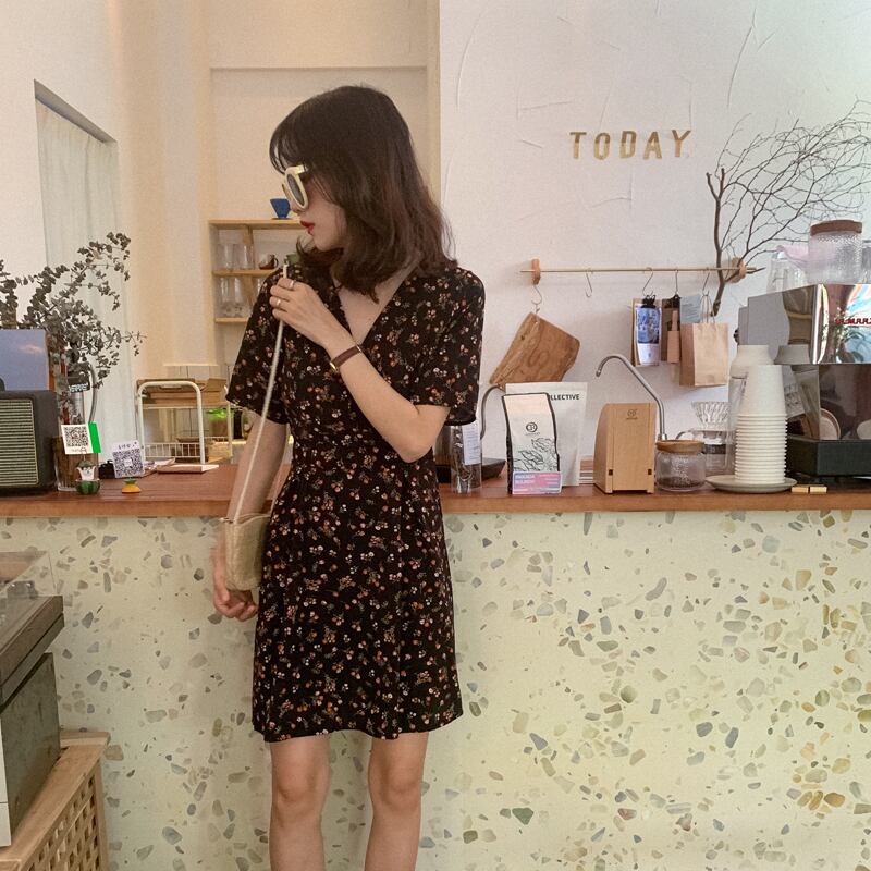 スタンダードVネックフローラルドレス サマースタイルウェストショートAラインスカート レトロ 夏物 花柄 萌量不足87506114612