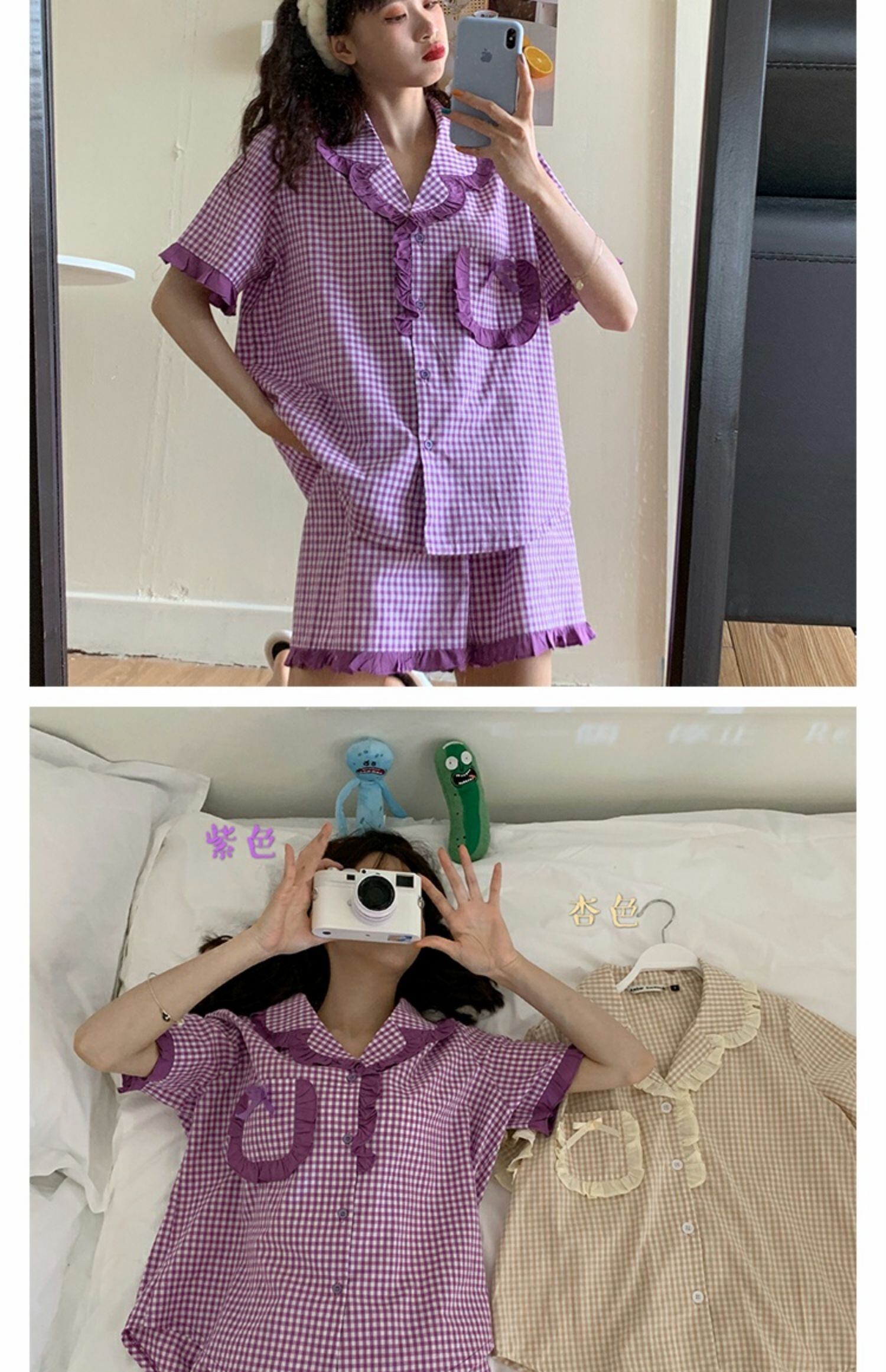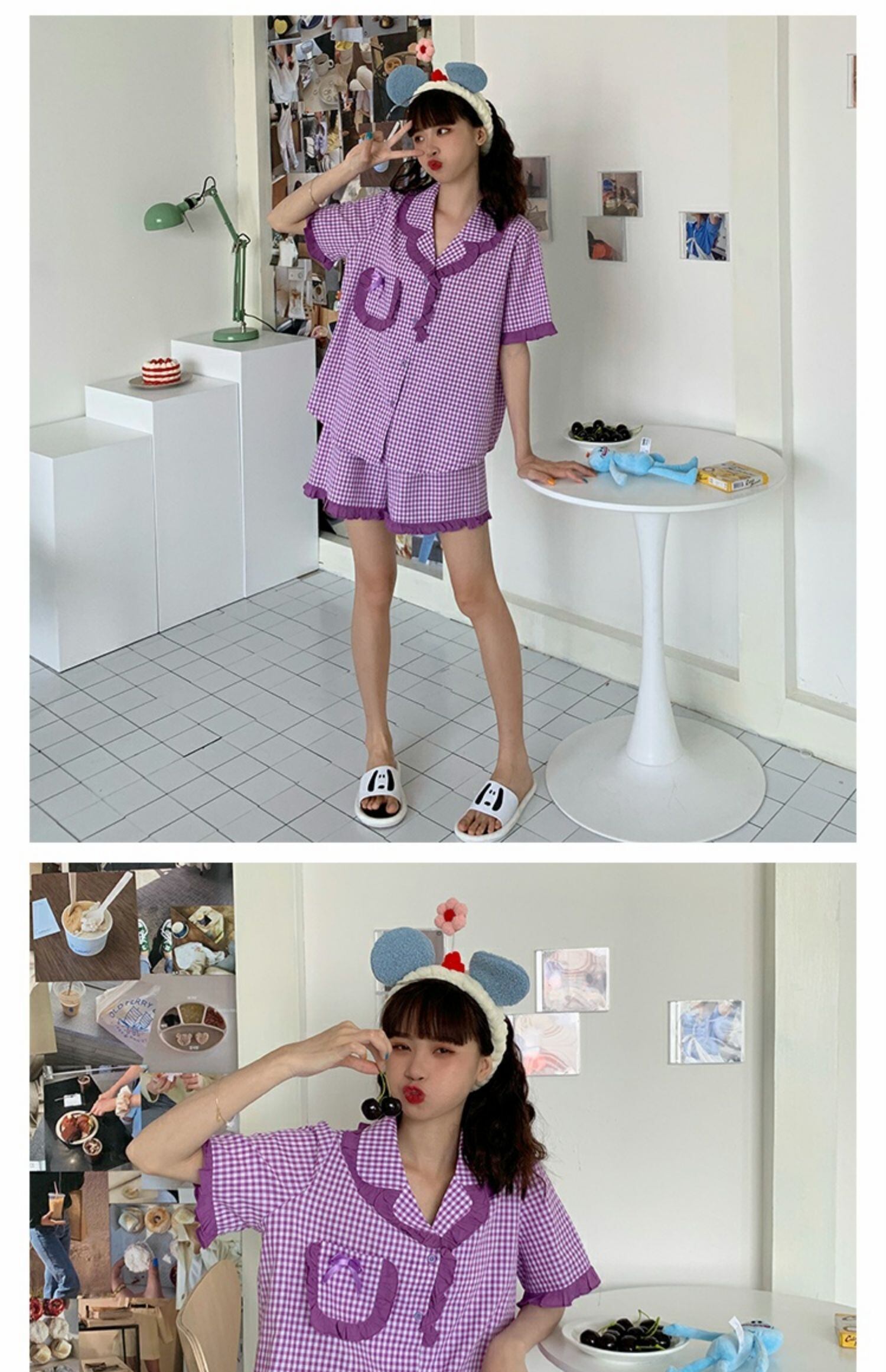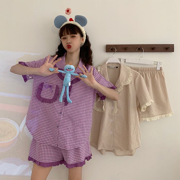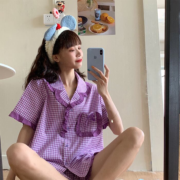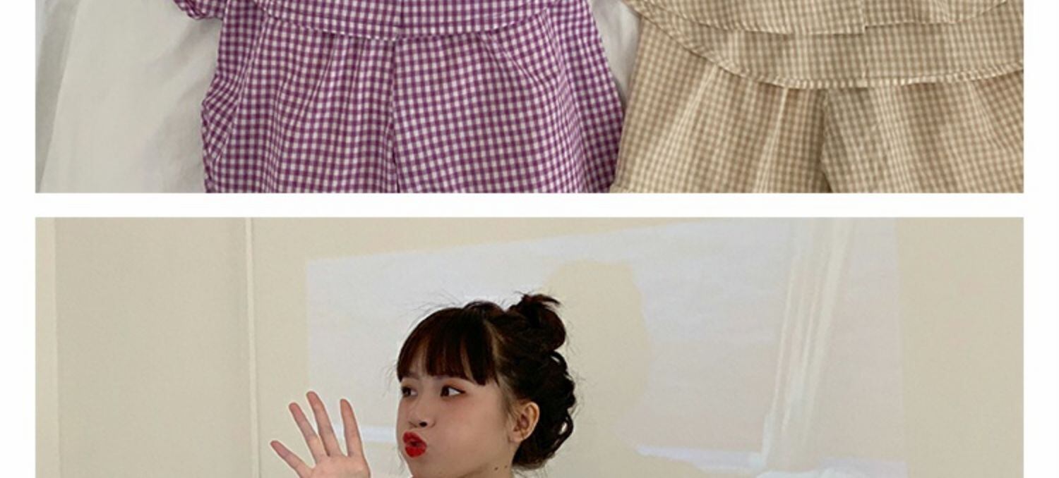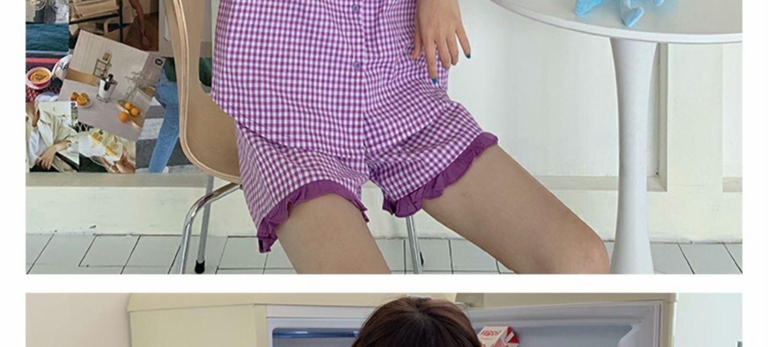 サマー格子柄トップス ショーツ 大人ガーリー スウィート キュート カジュアル 夏物 ブルマー パープル 萌量不足3712702315