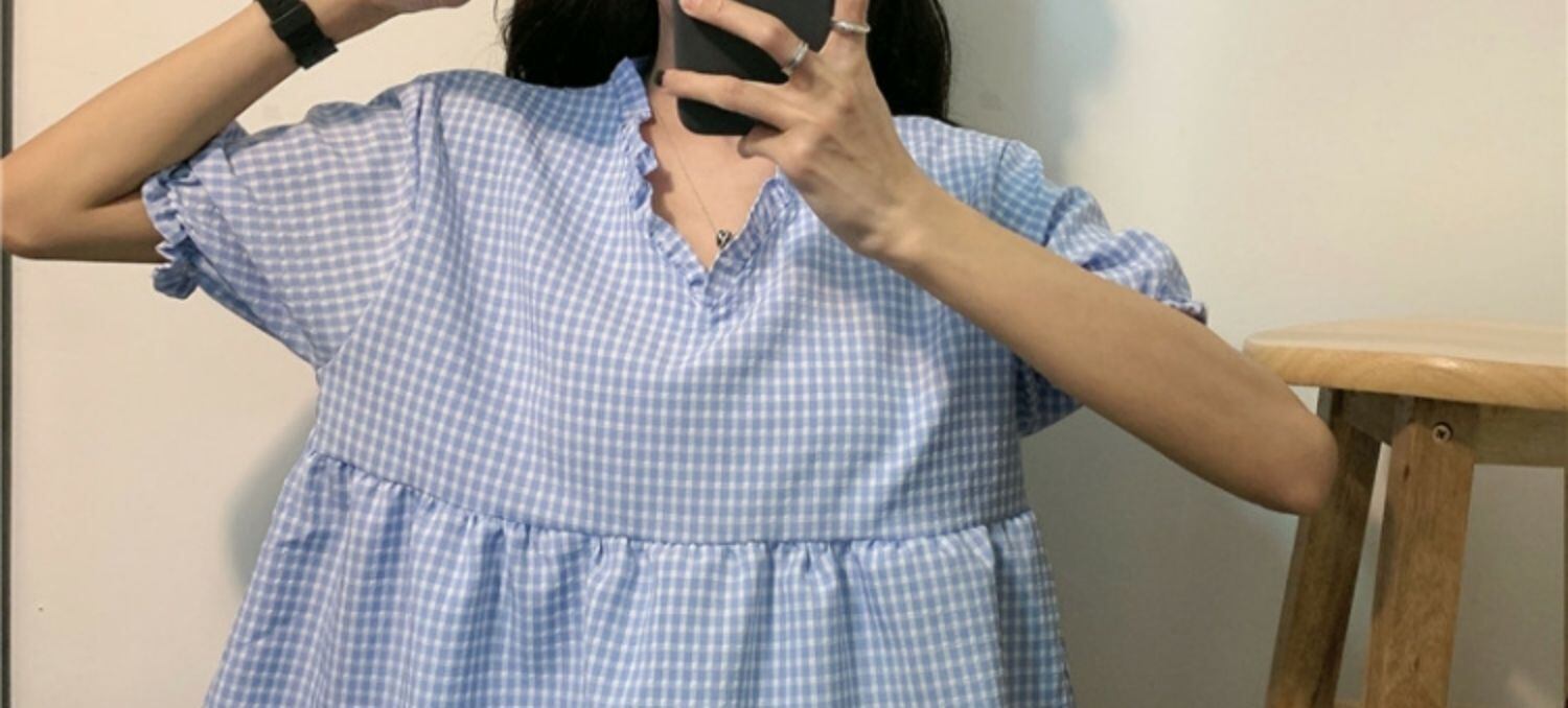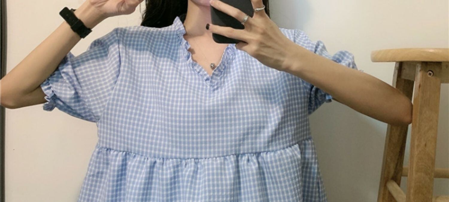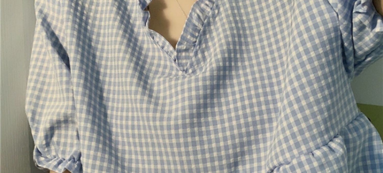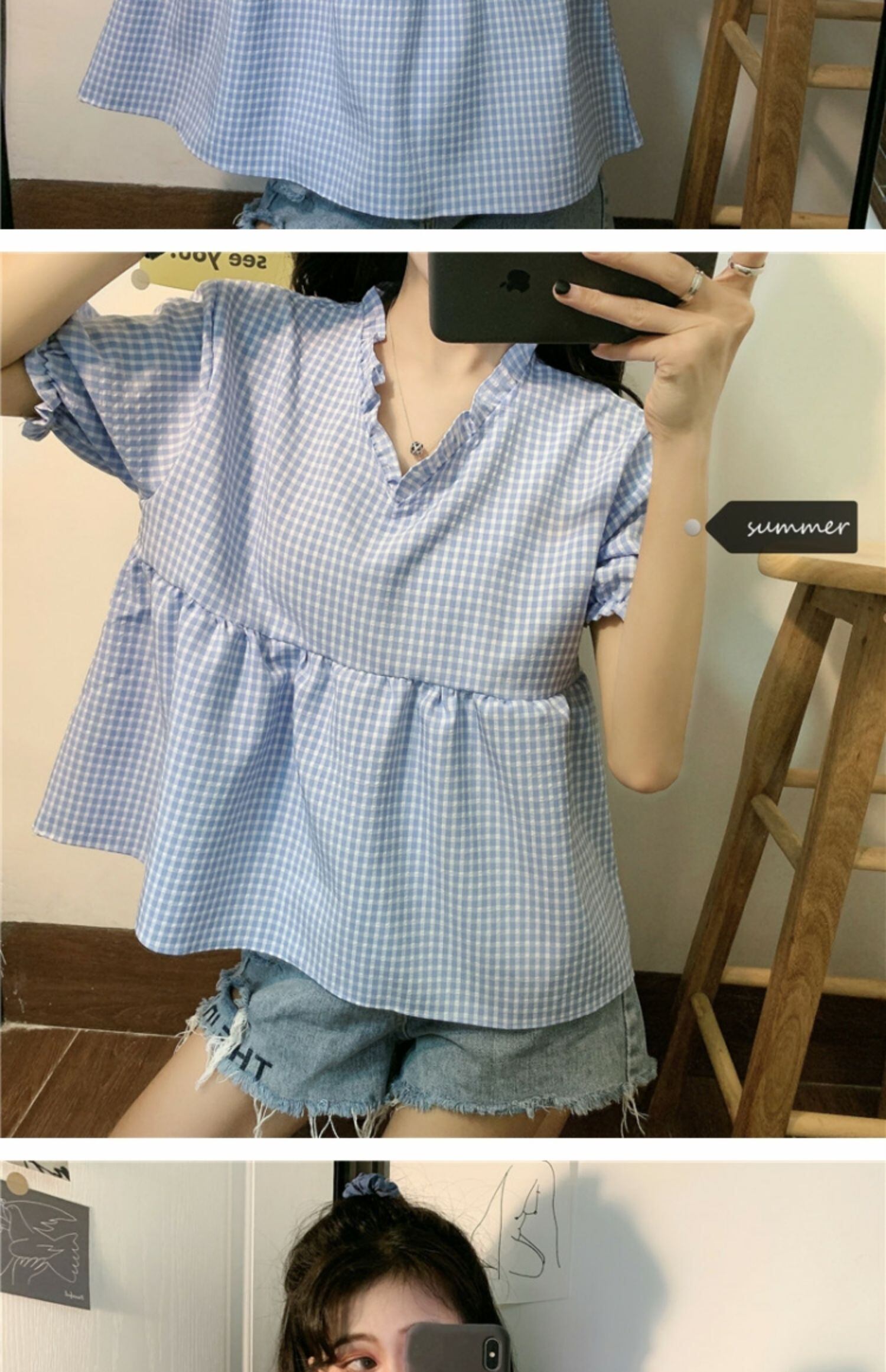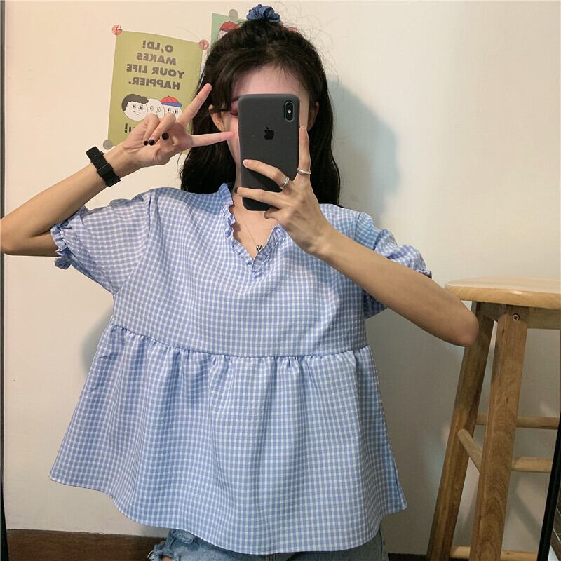 サマー格子柄トップス Vネックシャツ 夏物 萌量不足36831970319