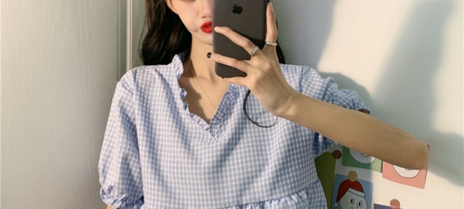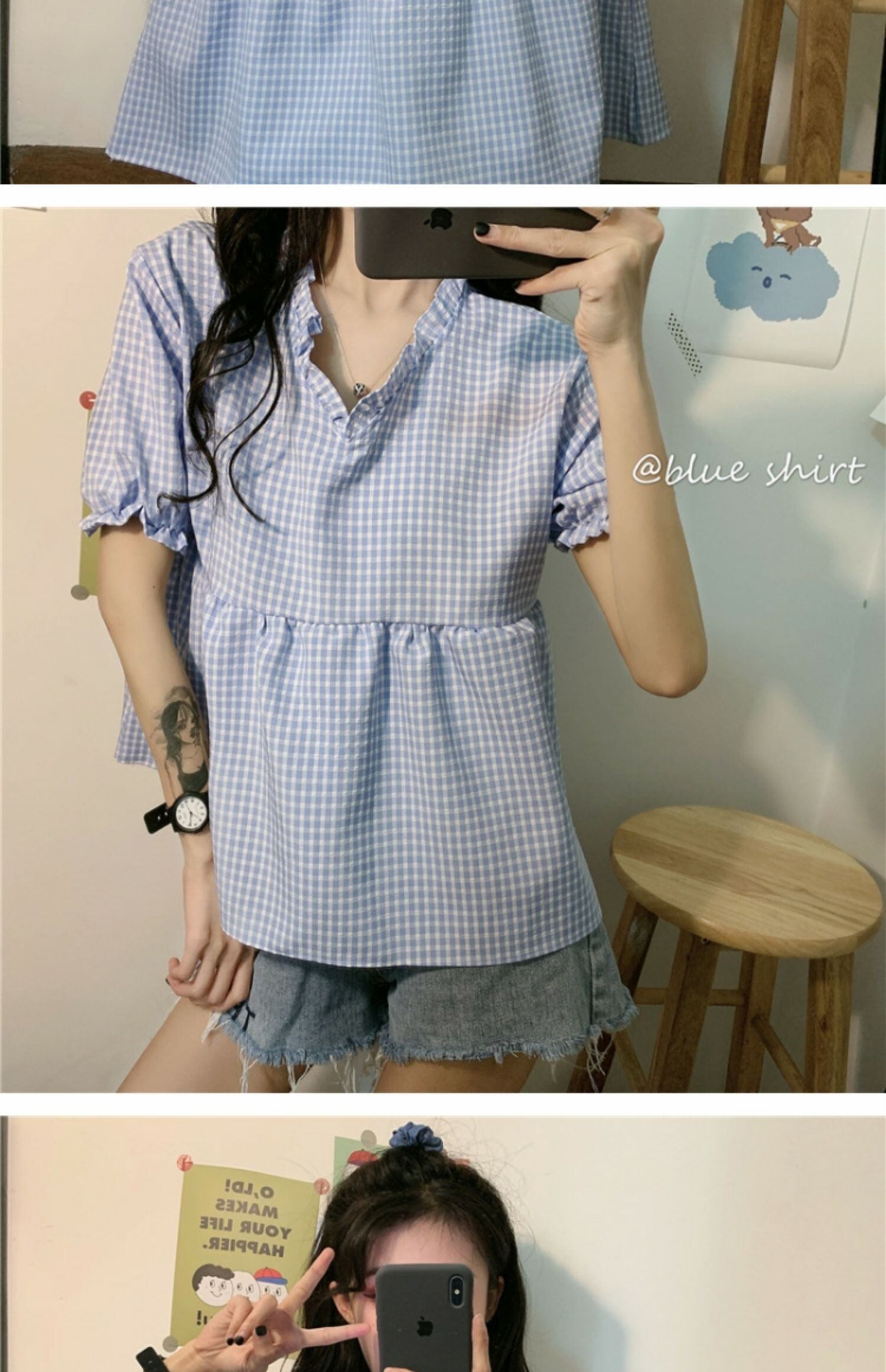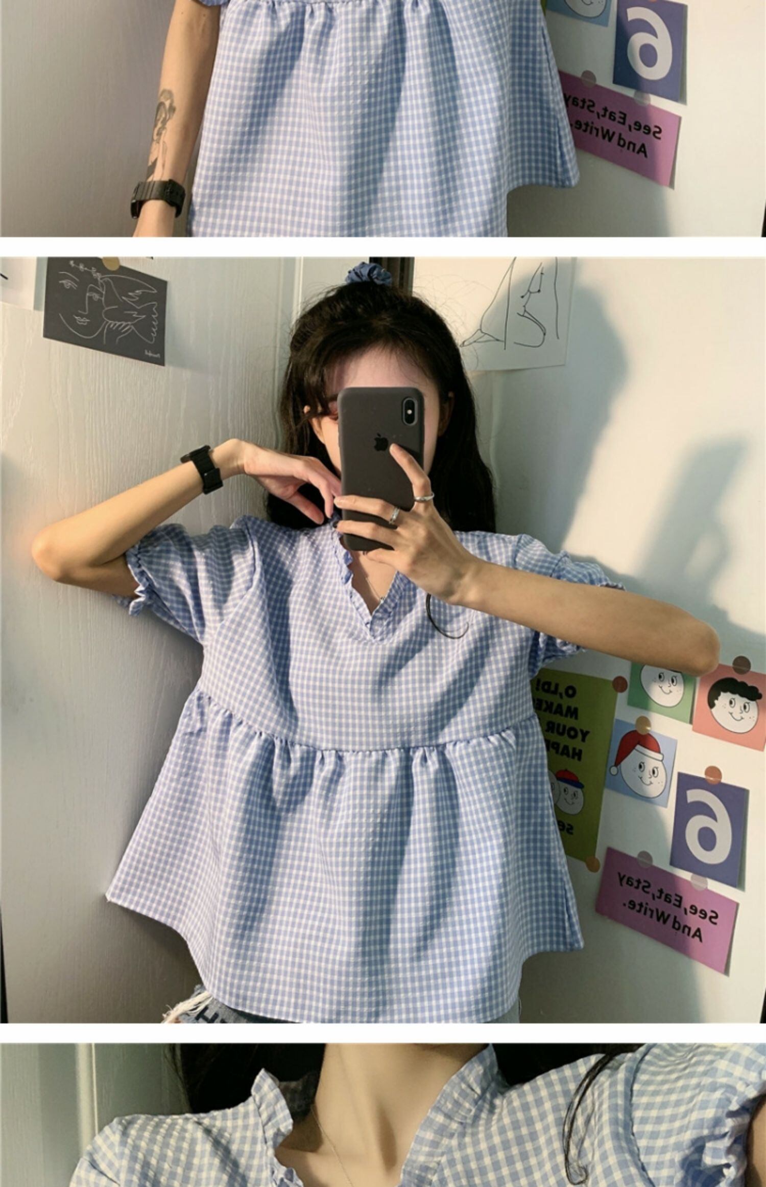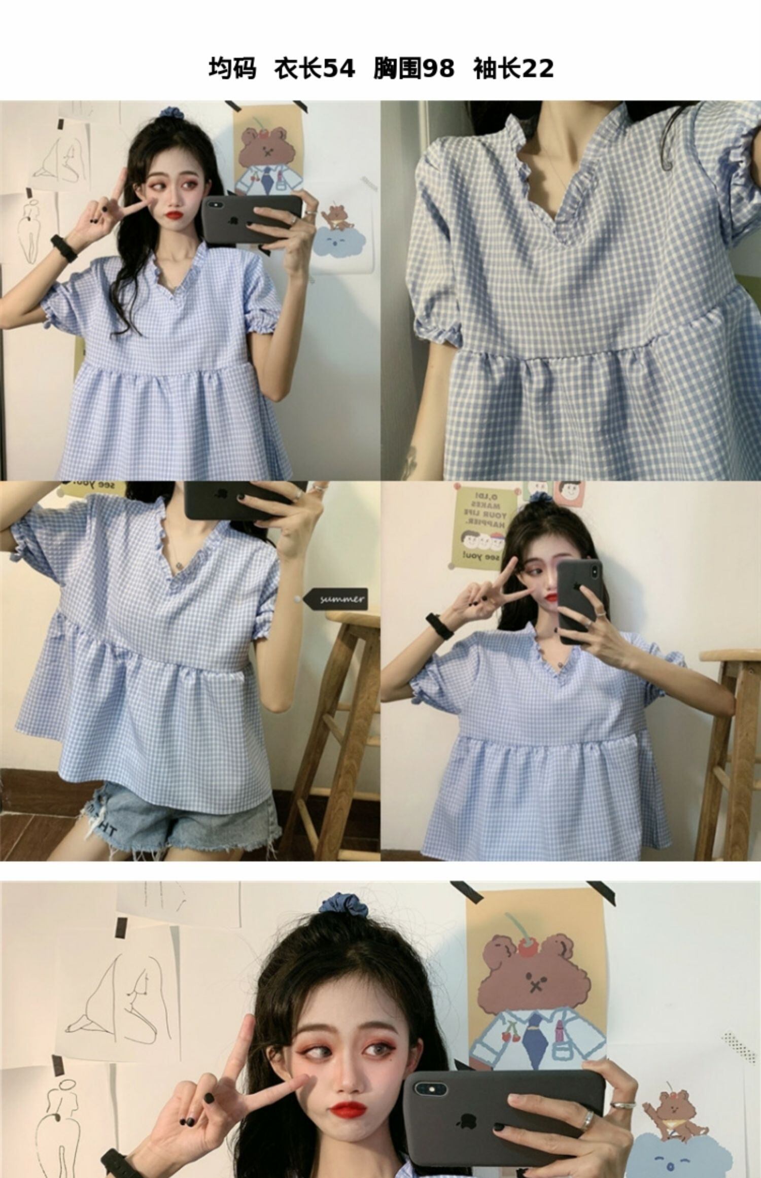 サマー格子柄トップス Vネックシャツ 夏物 萌量不足36831970319