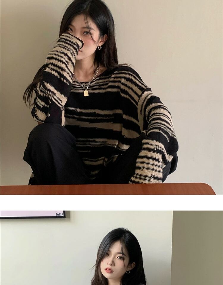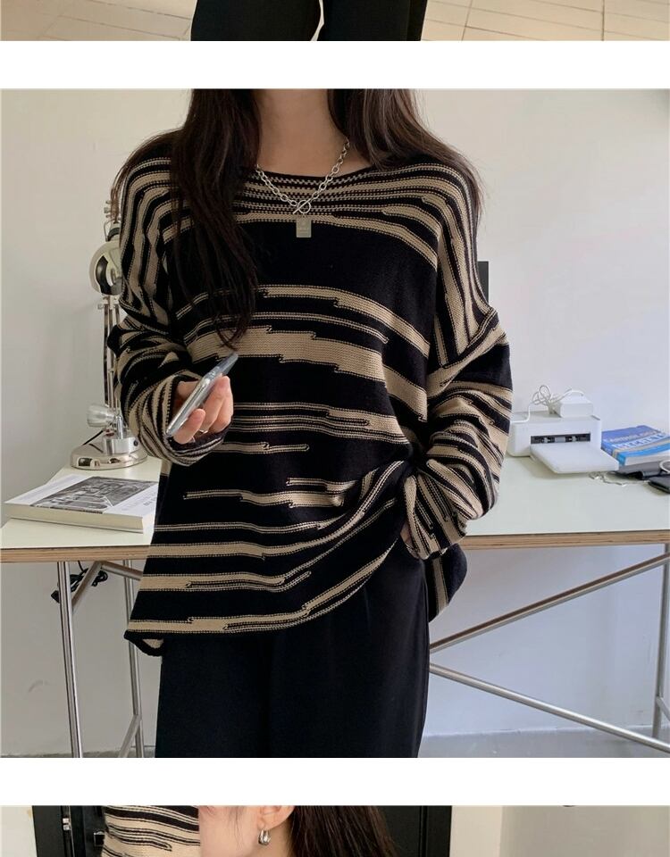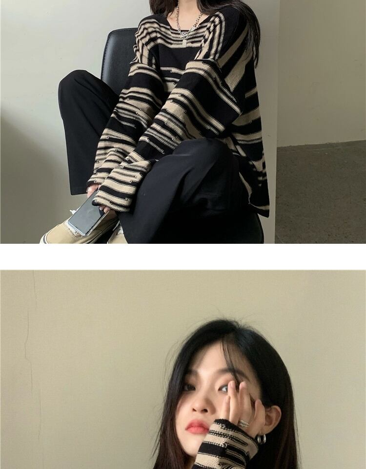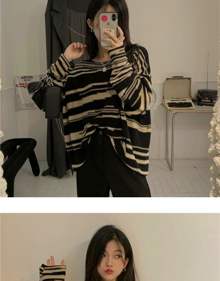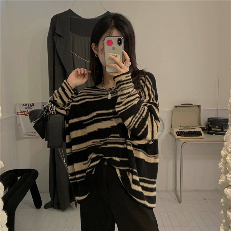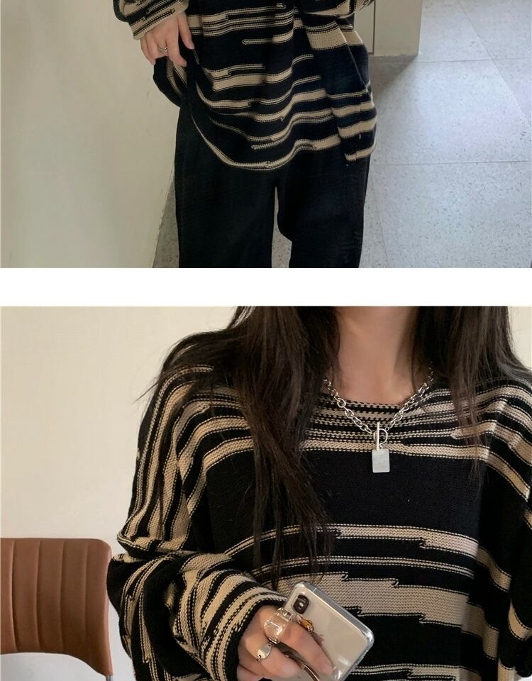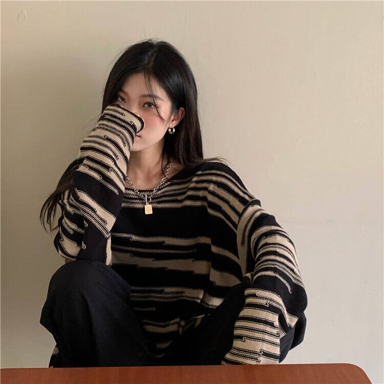 ストライプセーター スプリングオータム薄手シャツ スタンダードルーズウィンターニットトップス レトロ 春物 秋物 冬物 萌量不足30940970129