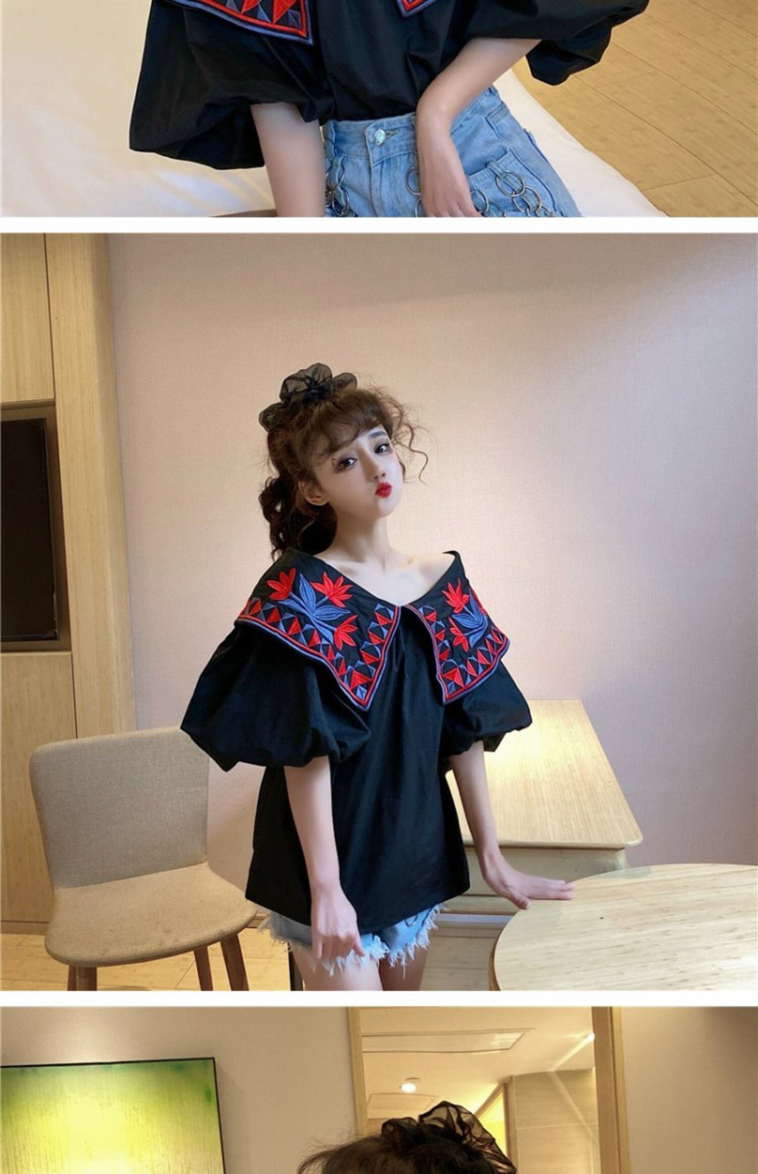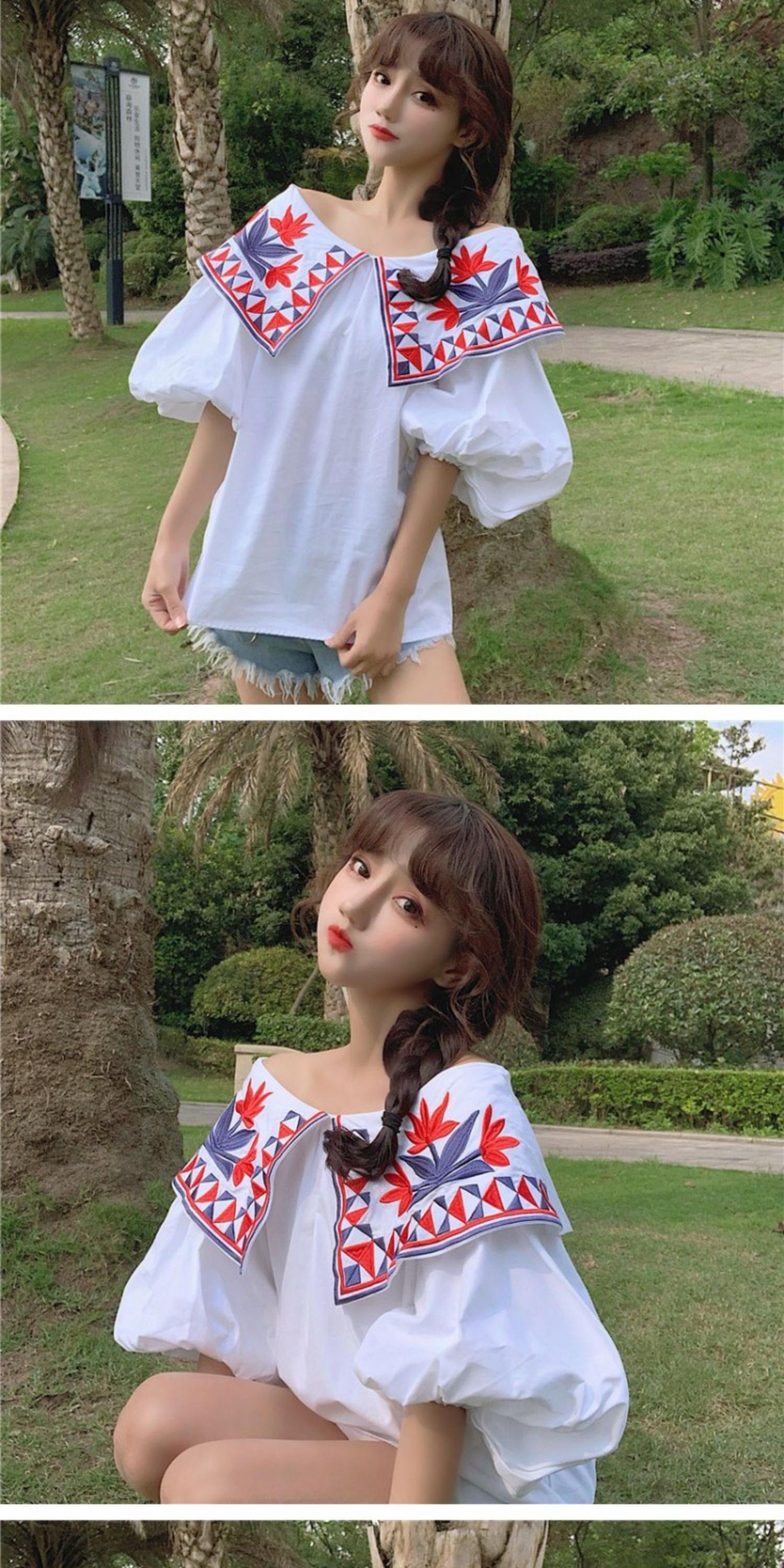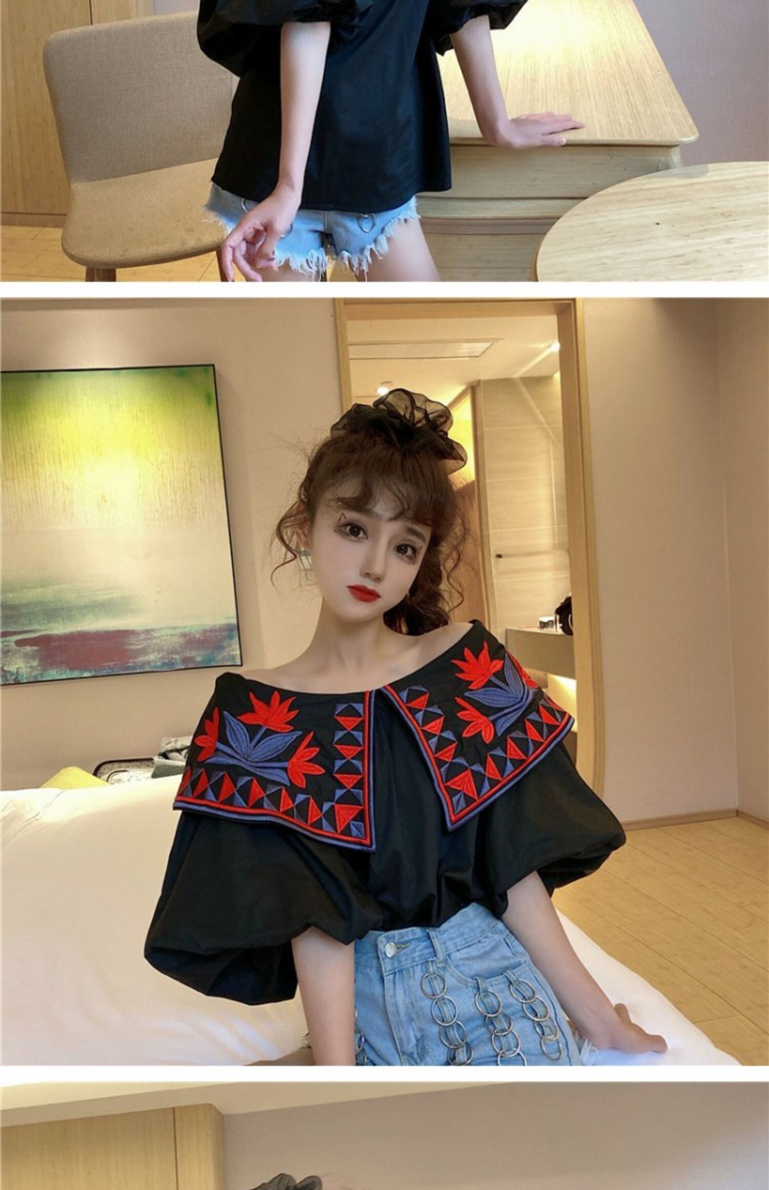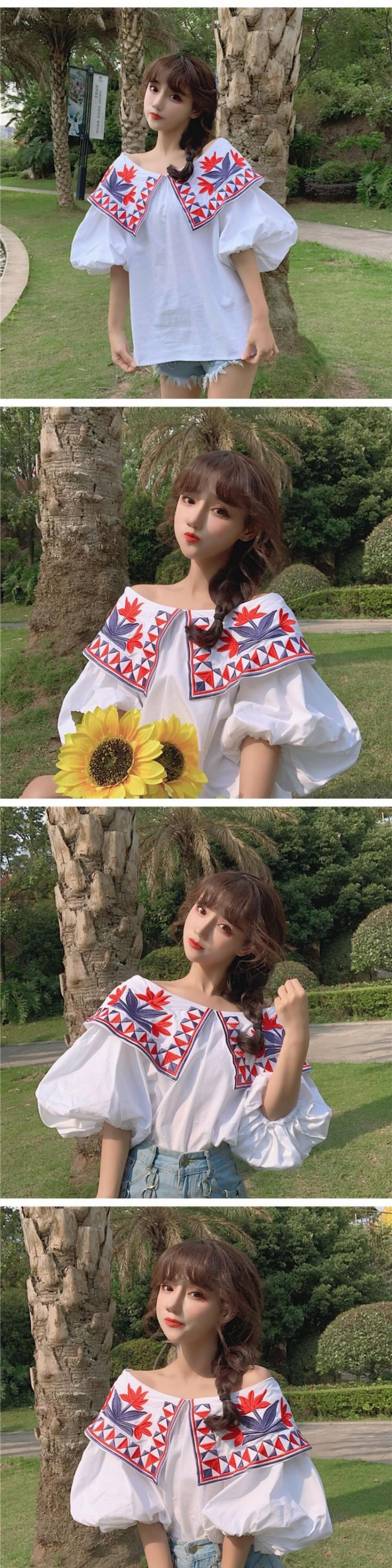 サマースタンダードシャツ Flowerデザイン 刺繍スリーブトップス ランタンスリーブ レトロ 夏物 フラワーデザイン 萌量不足52049004338