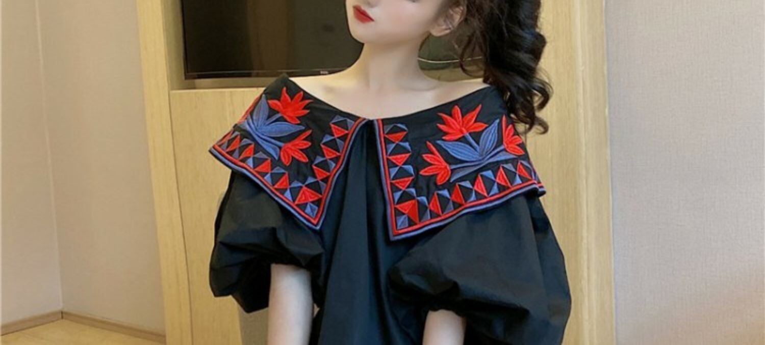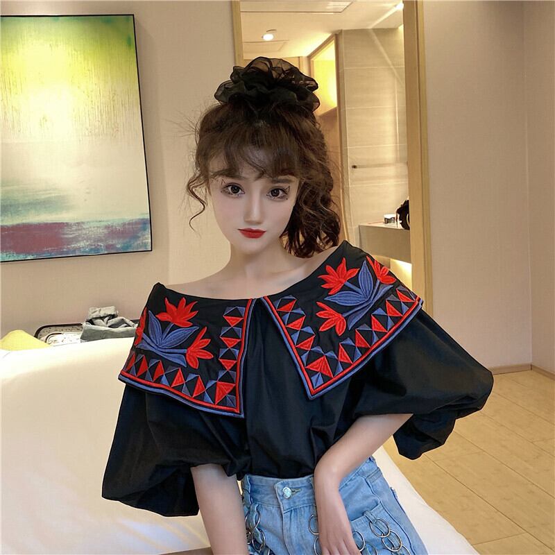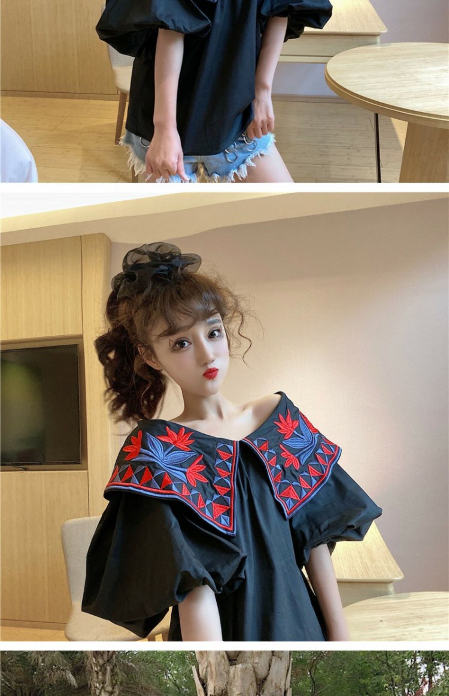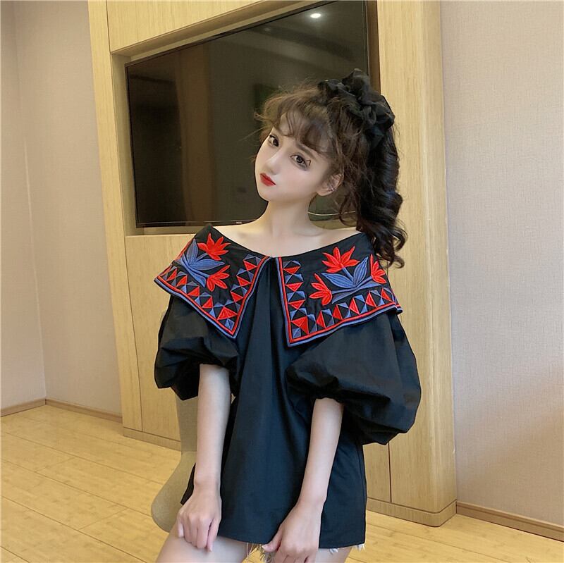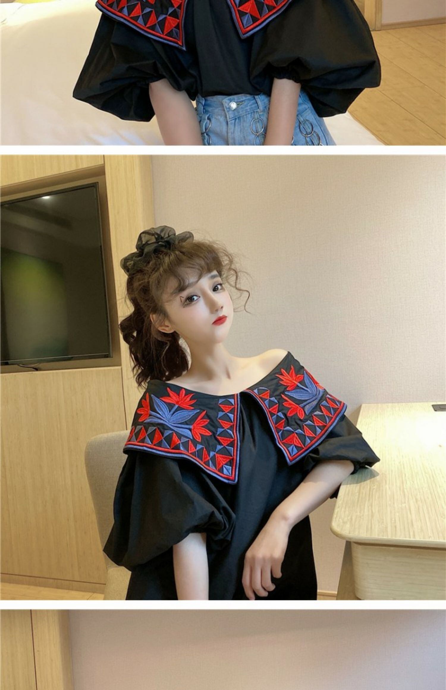 サマースタンダードシャツ Flowerデザイン 刺繍スリーブトップス ランタンスリーブ レトロ 夏物 フラワーデザイン 萌量不足52049004338